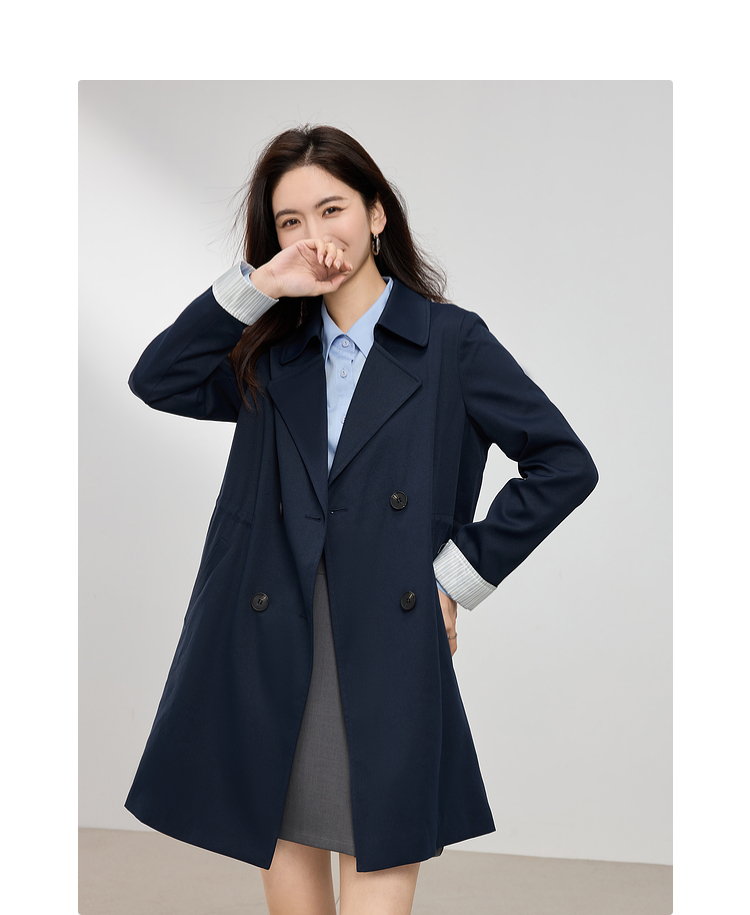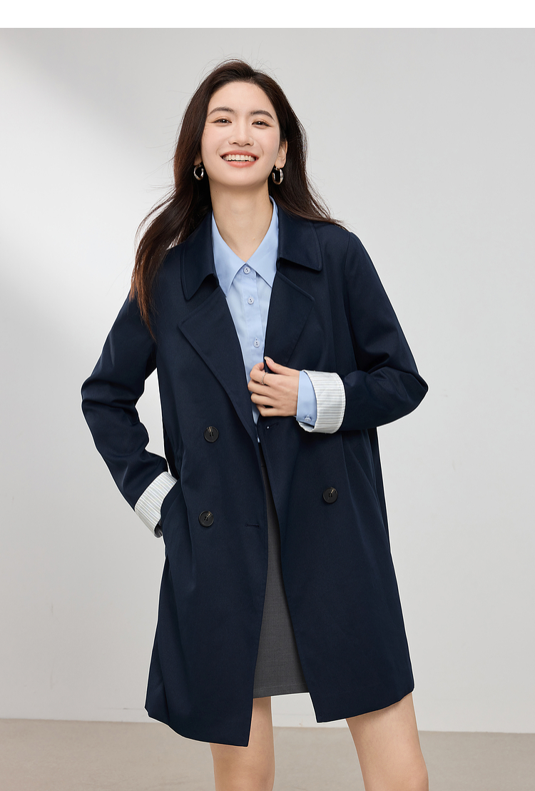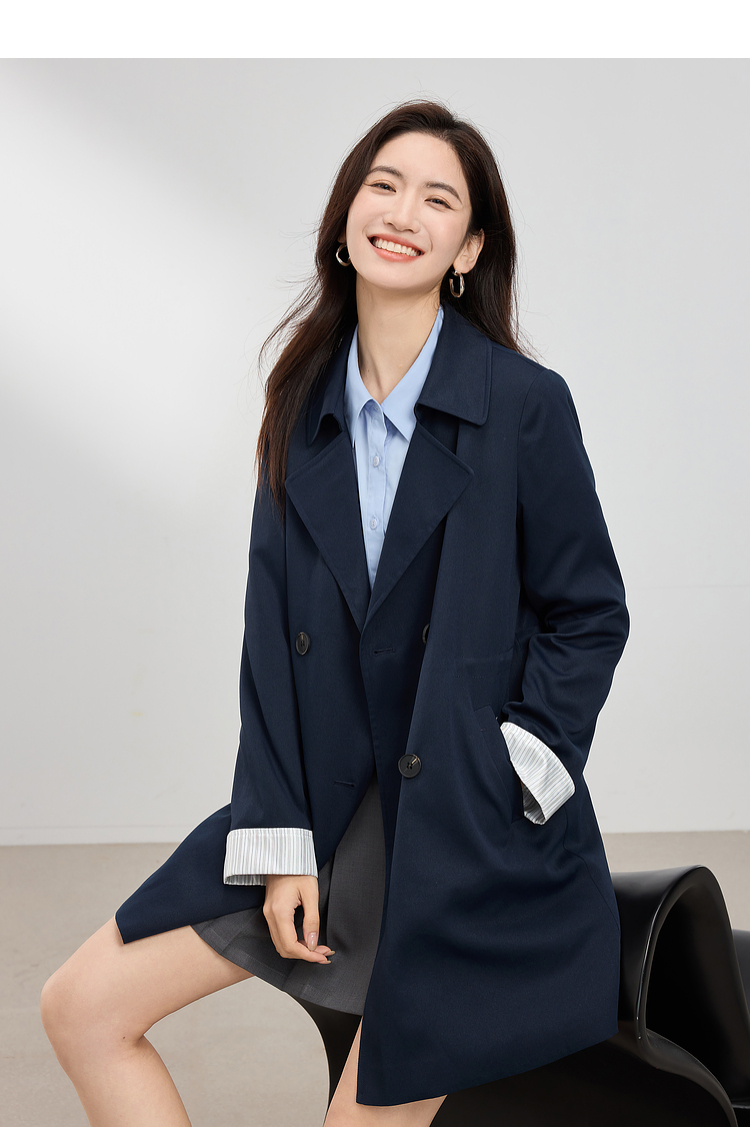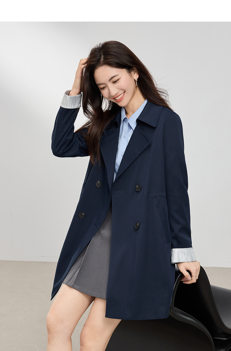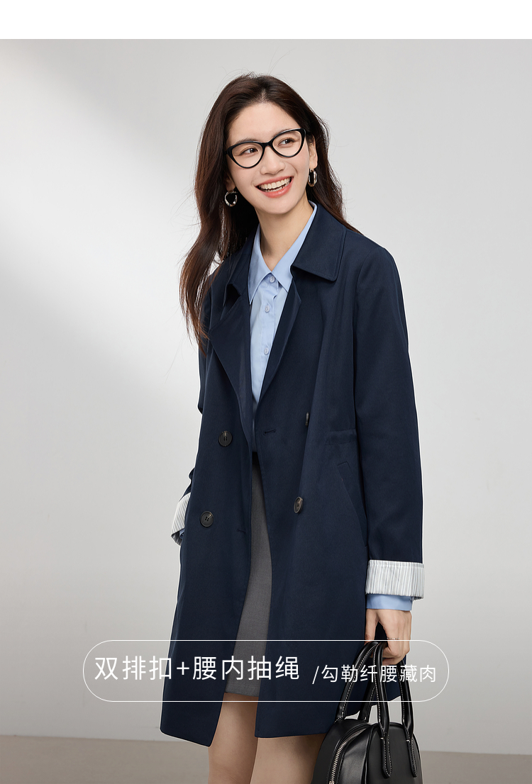 【专属特价】熙世界风衣中长款2025春装新款时尚修身宝蓝色双排扣英伦风外套