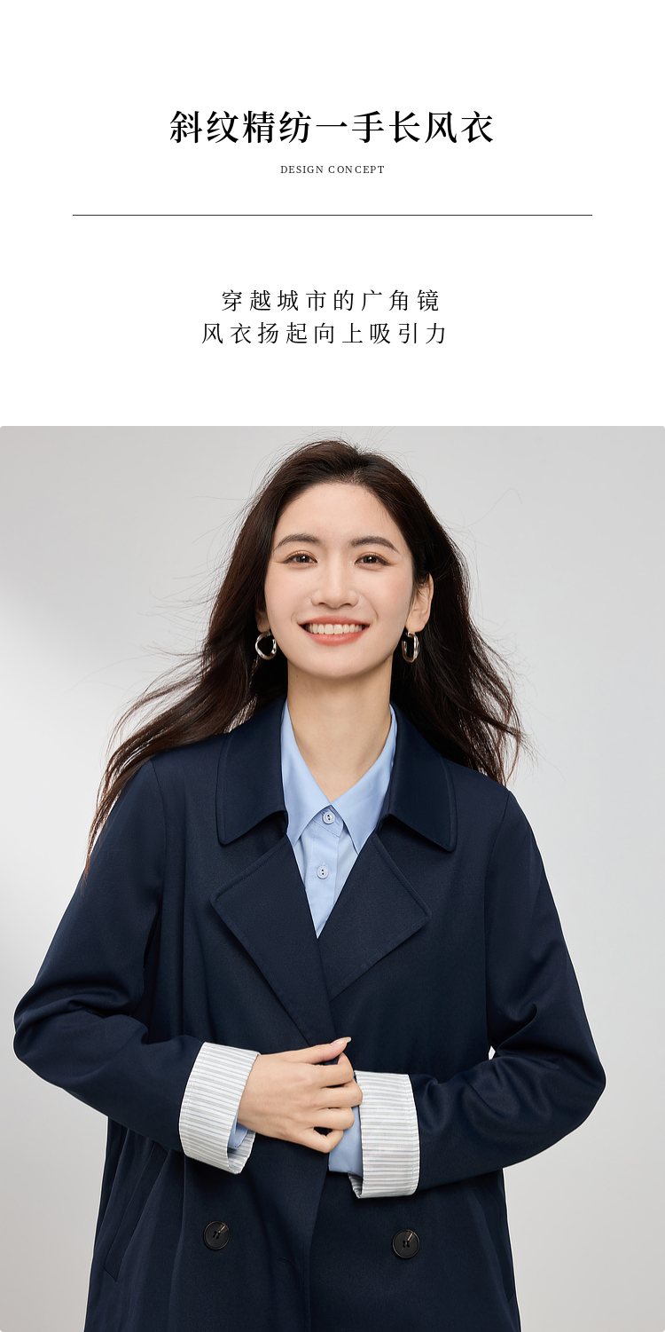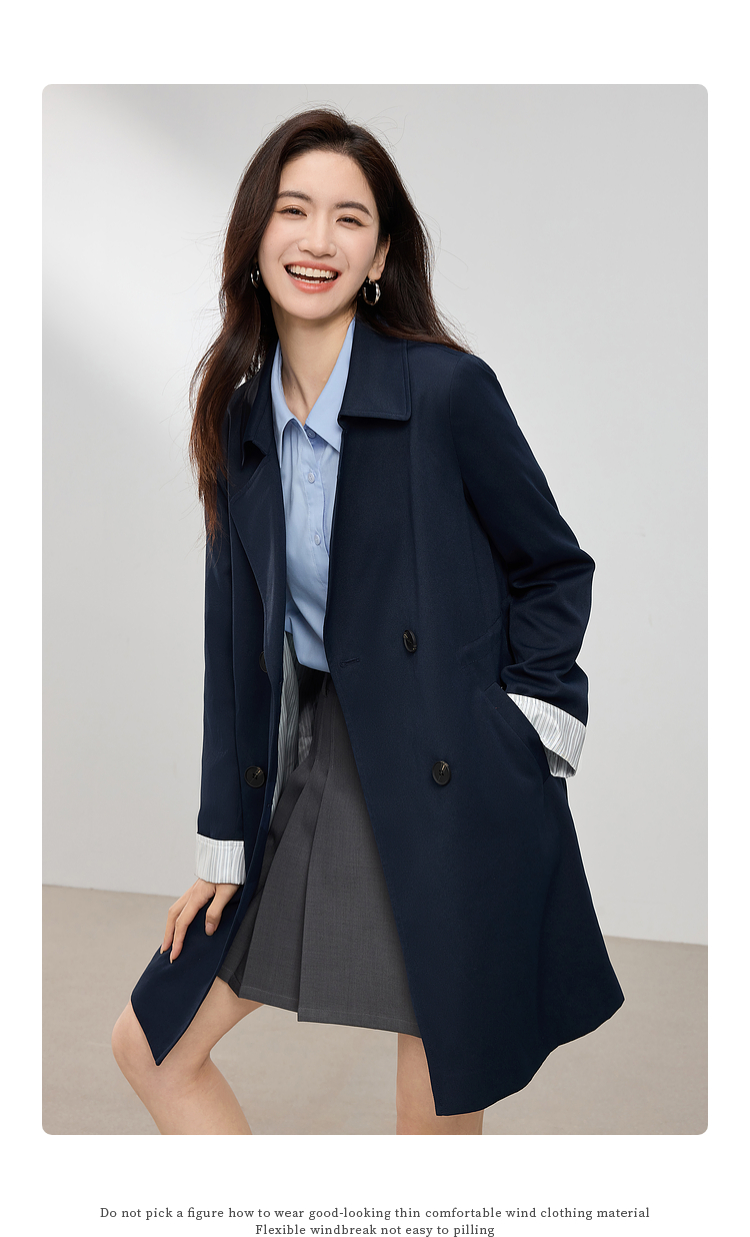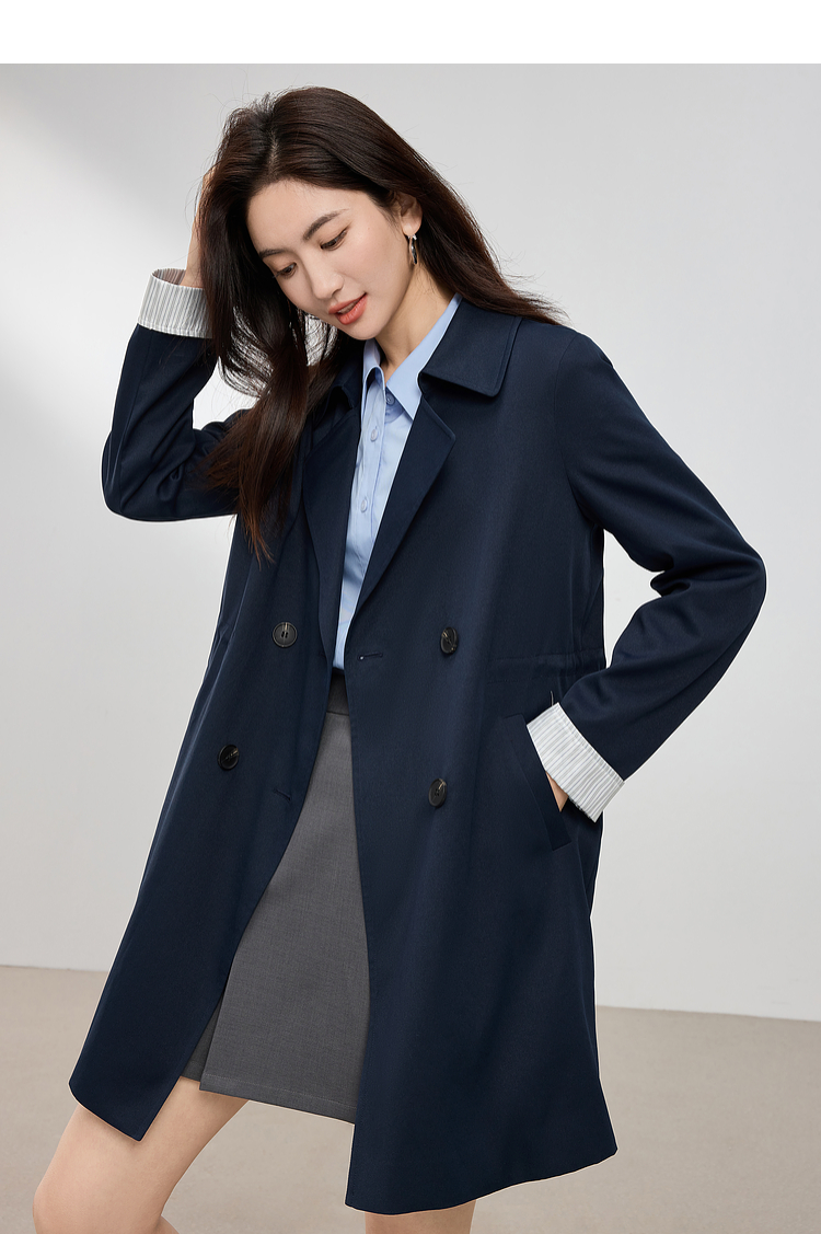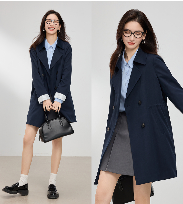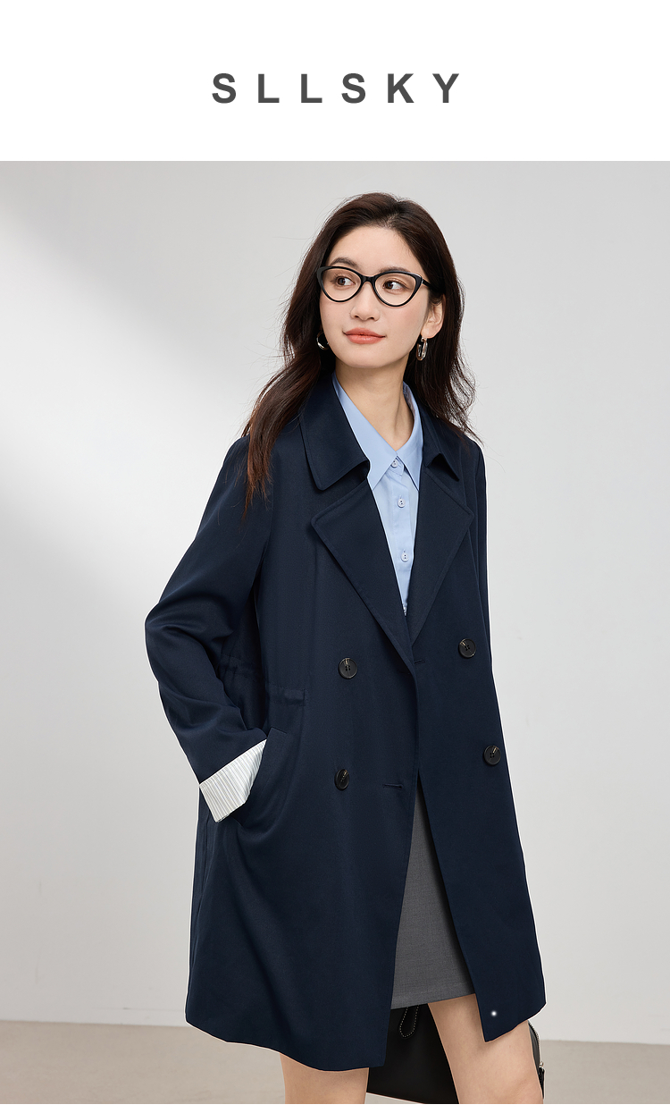 【专属特价】熙世界风衣中长款2025春装新款时尚修身宝蓝色双排扣英伦风外套