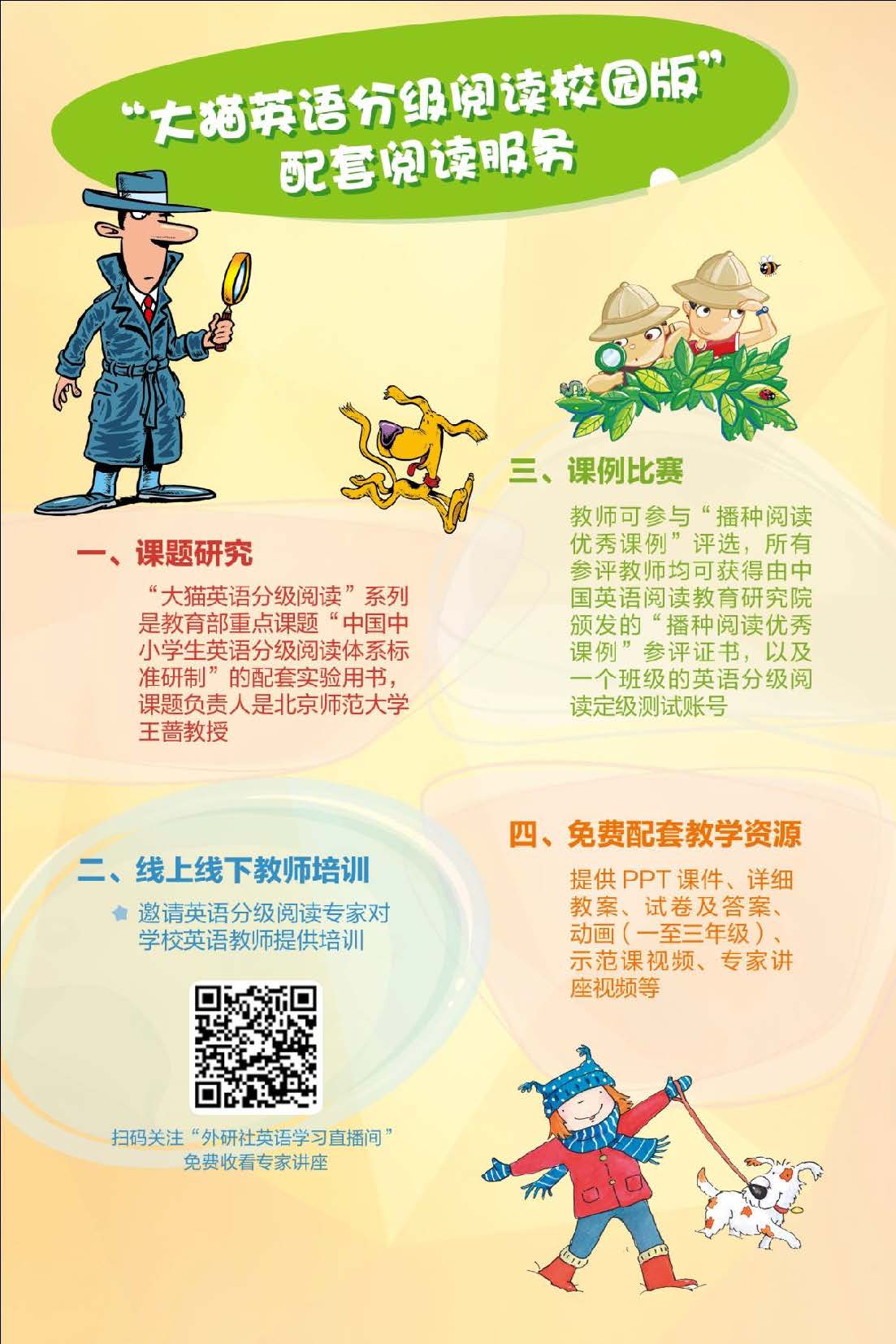 《大猫英语分级阅读校园版六年级下》《大猫英语分级阅读校园版六年级下》"大猫英语分级阅读校园版"中的一个套装,套装内含7本分级读物和1本自然拼读读物:《我是小小故事家》《聪明的蜘蛛哈里:家有哈里》《开心农场》《宠物侦探:足球失窃之谜》《小鸡里肯》《马儿的假日狂欢》《荒岛逃生》《来种豆茎吧!》,以及1本《阅读手册》(含练习题、阅读记录表和译文),并附赠单词卡片。读物既可点读,也可扫描图书封底二维码听音频。8本书既包括故事类读物又包括百科类读物,匹配小学英语课标及小学主流教材单元话题,并配有丰富的免费配套教学资源,适合小学六年级下学期阅读教学使用,也适合家庭阅读。