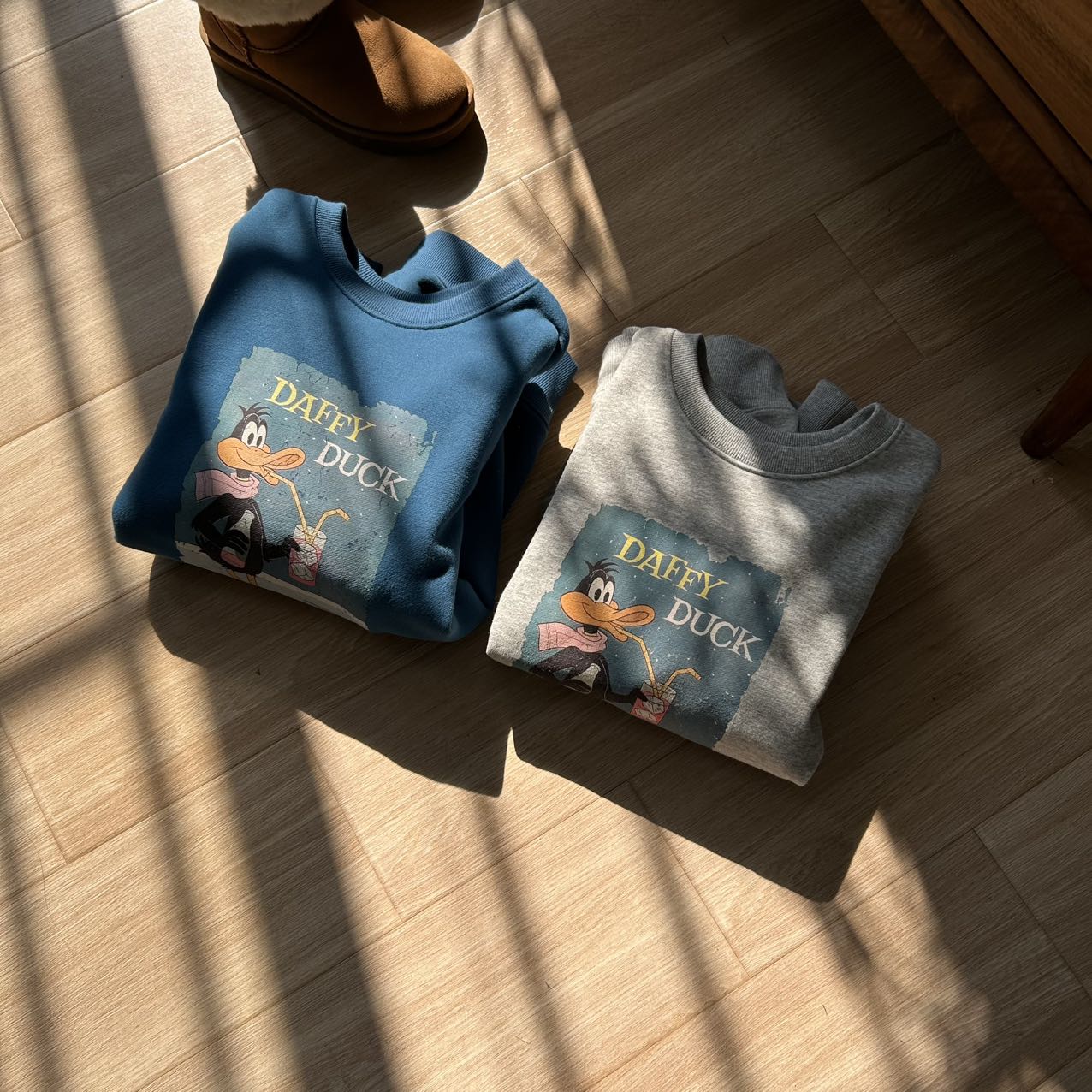 达菲鸭“摆烂式”喝冰饮的印花,自带做旧滤镜,