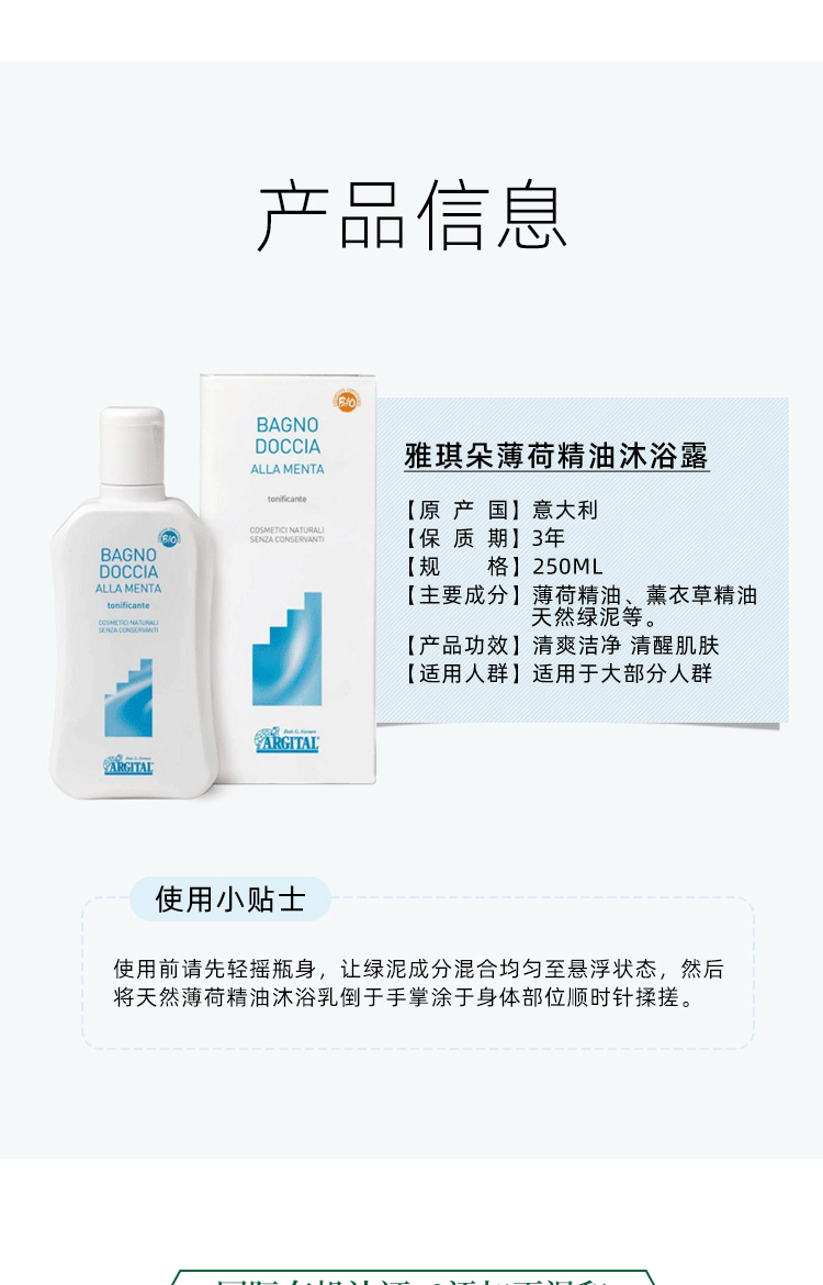 雅琪朵薄荷精油沐浴露 250ML/瓶