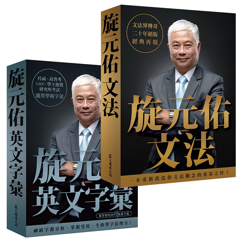 旋元佑老師依照語言建構的順序安排,設計一系列改變觀念的英文學習書。透過字源分析、系統性理解文法等方式,徹底扭轉「學好英文很難」的刻板認知,並收集各大英文檢定考題作為資料庫,整合通用的閱讀和寫作技巧。全系列共五本:《旋元佑英文字彙》、《旋元佑文法》、《旋元佑文法解題》、《旋元佑英文閱讀》、《旋元佑英文寫作》,協助讀者確實培養深厚的英文實力。