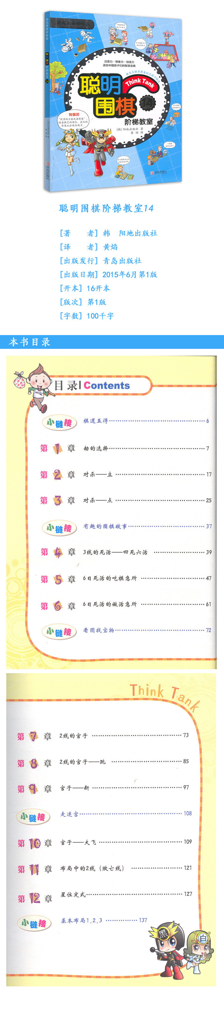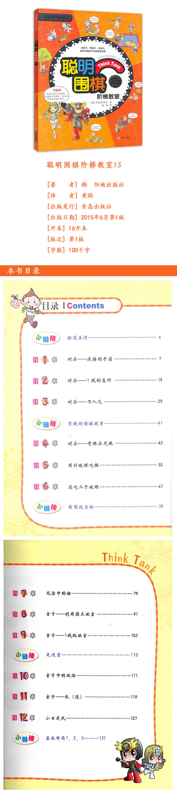 本套图书共18本,由简至难,每个章节的知识点不仅有适度的练习题加以学习,更有丰富的漫画帮助理解。除了知识点的学习之外,还有围棋礼仪、游戏、成语故事等穿插其中,使得儿童在学习的过程中不会觉得枯燥无味,激发兴趣,不知不觉进入围棋的世界,是一套完全针对儿童学棋的教材。