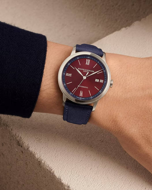 镜面材质 | 蓝宝石水晶玻璃 | 表盘 | 精钢表壳 太阳缎面打磨的勃艮第红色与蓝色凸缘,白色罗马数字与表刻,镀铑叶形指针,日期视窗位于3点钟位置 棒状和罗马数字时标 |