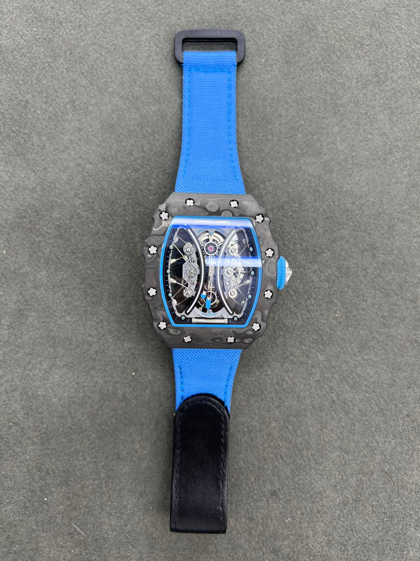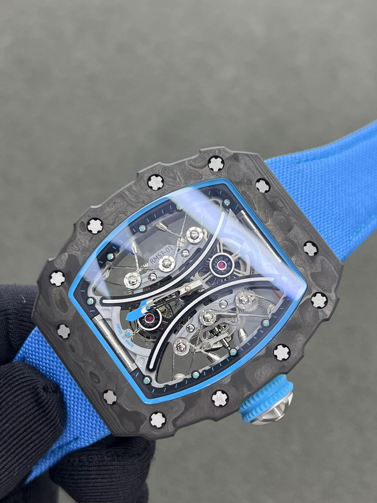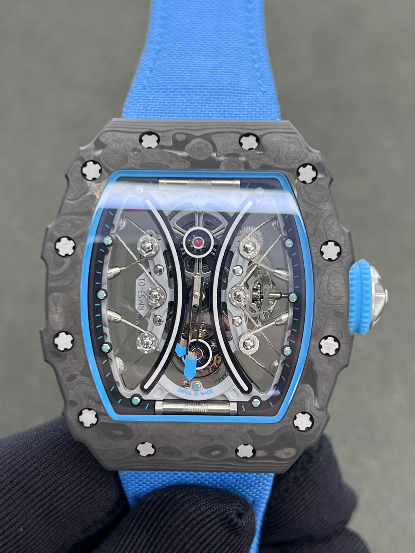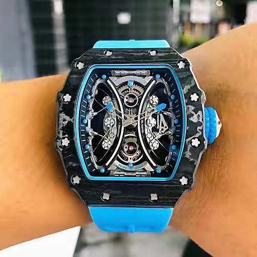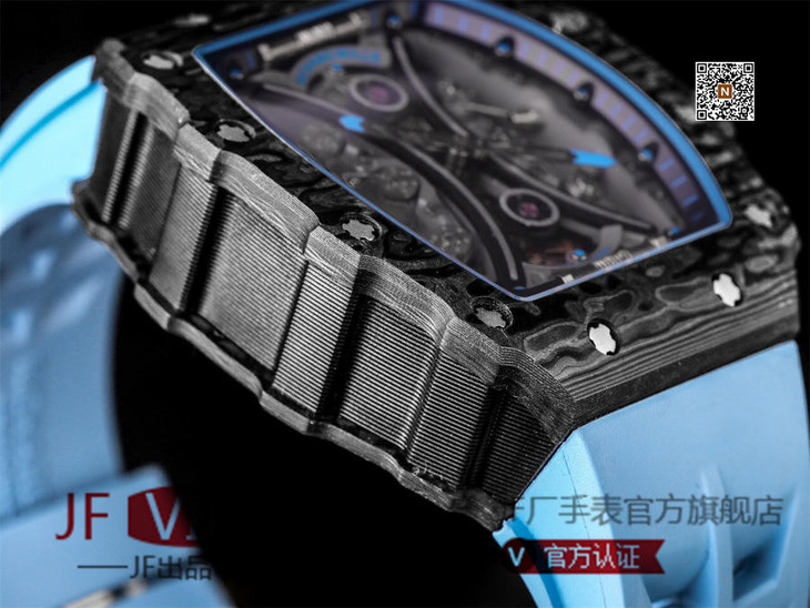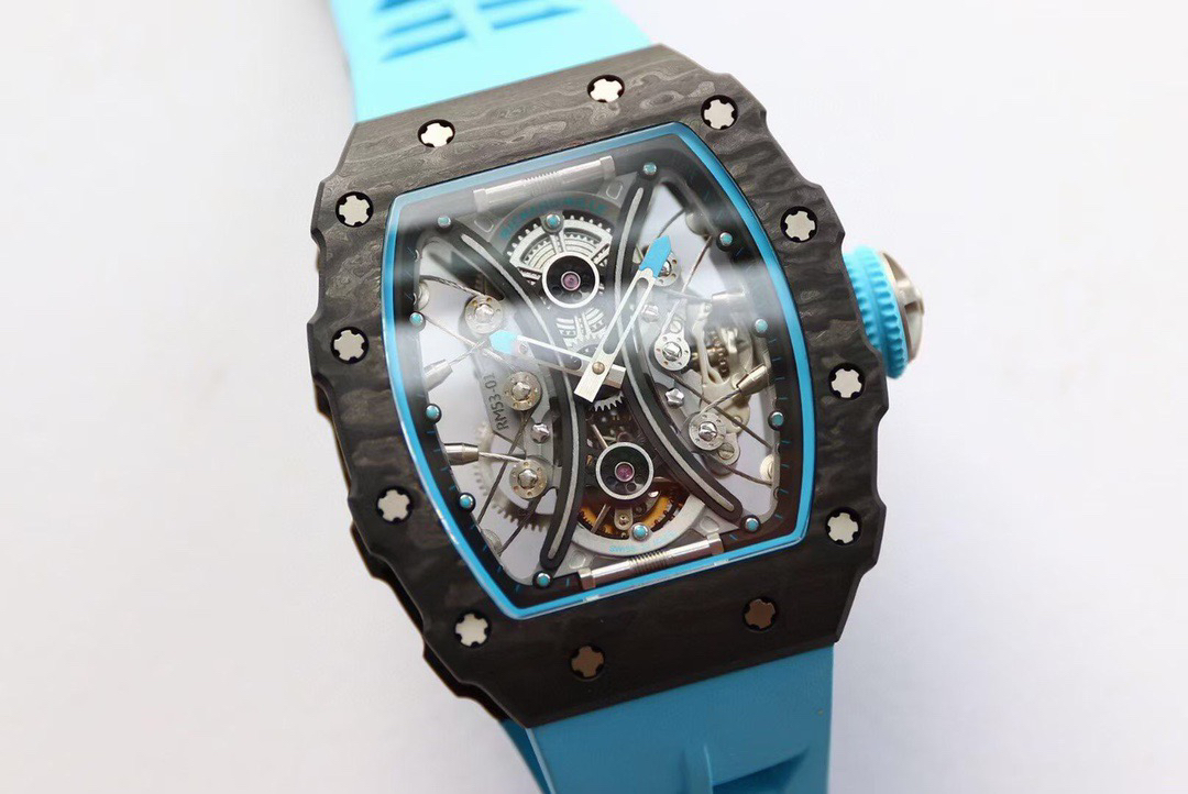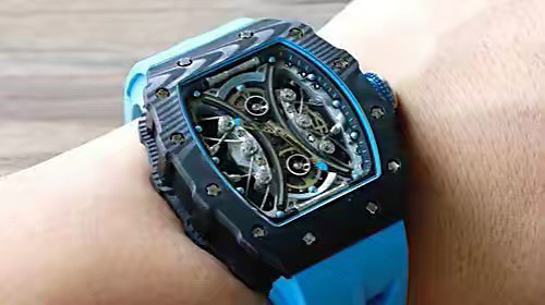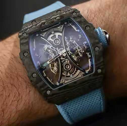 JB理查德米勒RM53-01陀飞轮腕表,全身碳钎维+真陀飞轮心脏,号称腕表界的“兰博基尼第六元素”。配备了坚固的TPT?碳纤维表壳