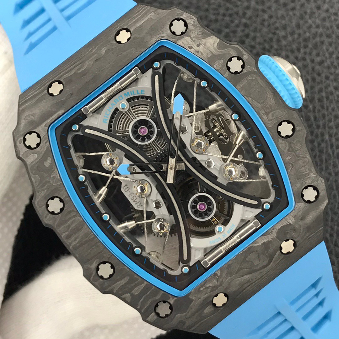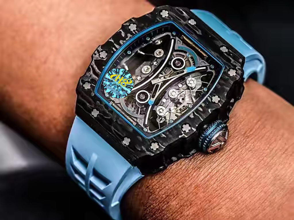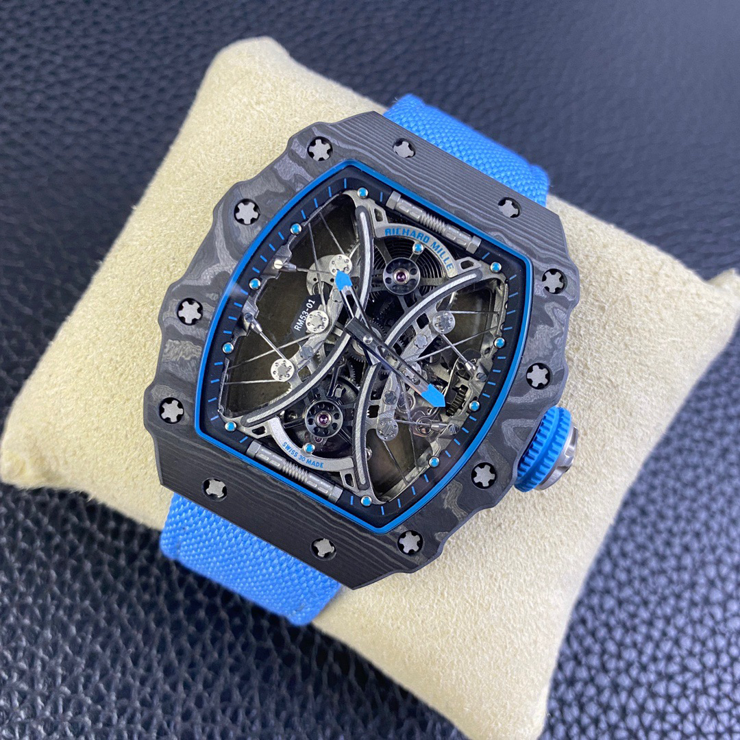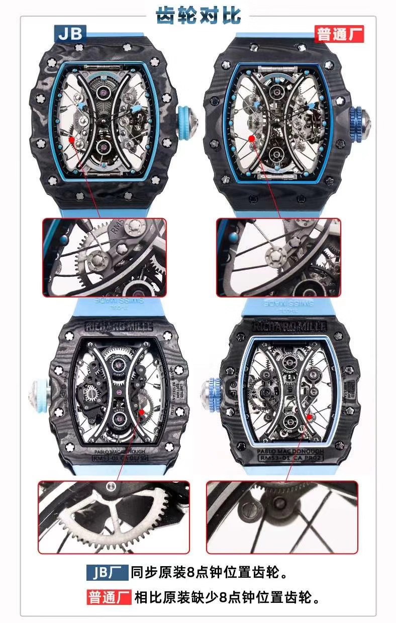 JB理查德米勒RM53-01陀飞轮腕表,全身碳钎维+真陀飞轮心脏,号称腕表界的"兰博基尼第六元素"。配备了坚固的TPT?碳纤维表壳(碳钎维中的极品)外加高精密缝合技术,解决了市场普通版本"缝合度不高有缝隙、纹路不清晰质感差"的问题,95%还原原装构架,一比一尺寸(43X49X16mm),层压蓝宝石水晶表镜以及固定机芯的悬浮式钢索,TPT?碳纤维独特的波纹光泽和犀利的表壳线条,更突显了区别于小厂的质感。具体卖点可以归纳为"六高元素":