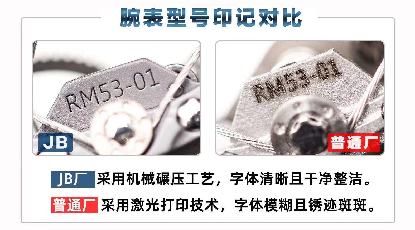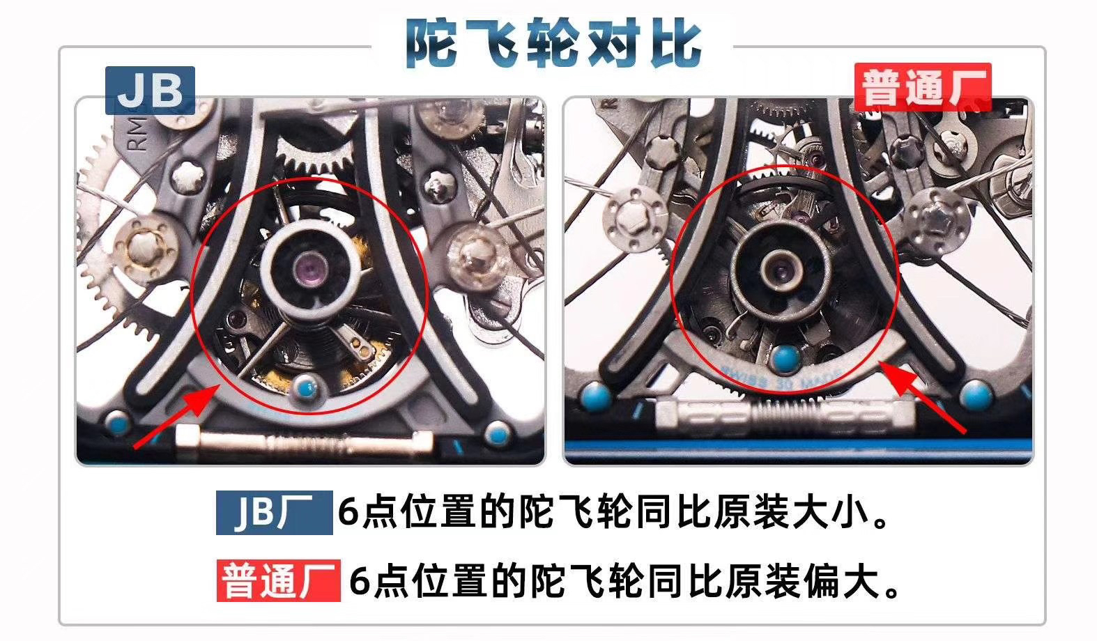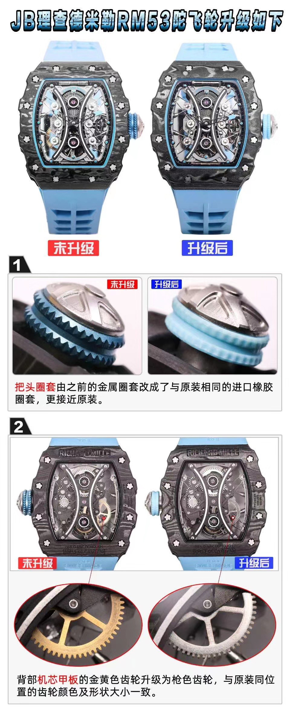 JB理查德米勒RM53-01陀飞轮腕表,全身碳钎维+真陀飞轮心脏,号称腕表界的"兰博基尼第六元素"。配备了坚固的TPT?碳纤维表壳(碳钎维中的极品)外加高精密缝合技术,解决了市场普通版本"缝合度不高有缝隙、纹路不清晰质感差"的问题,95%还原原装构架,一比一尺寸(43X49X16mm),层压蓝宝石水晶表镜以及固定机芯的悬浮式钢索,TPT?碳纤维独特的波纹光泽和犀利的表壳线条,更突显了区别于小厂的质感。具体卖点可以归纳为"六高元素":