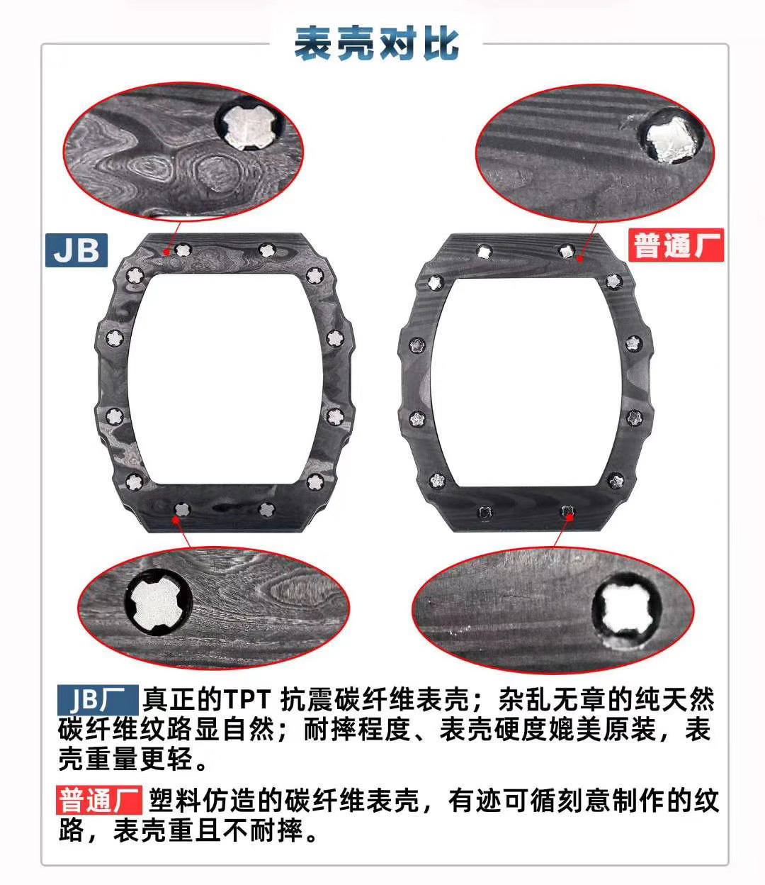 4、高抗震——TPT 抗震碳纤维表壳,纹理清晰有质感;