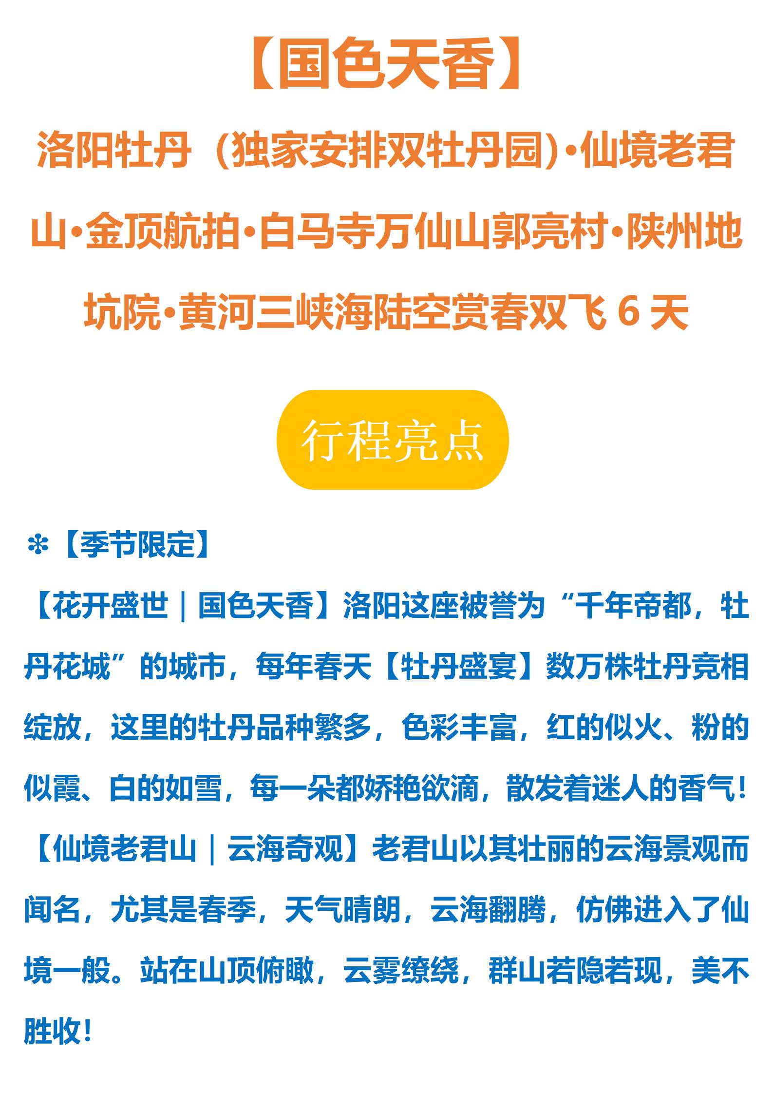 【国色天香】 洛阳牡丹(独家安排双牡丹园)·仙境老君山·金顶航拍·白马寺万仙山郭亮村·陕州地坑院·黄河三峡海陆空赏春双飞6天