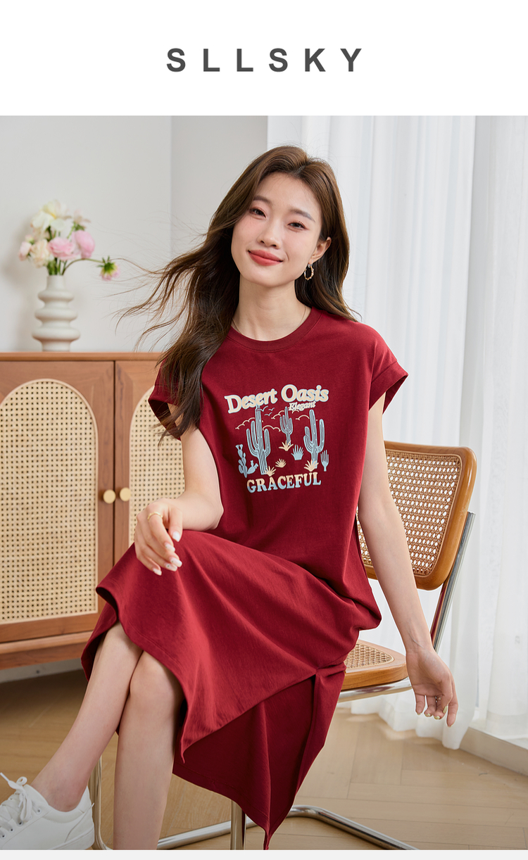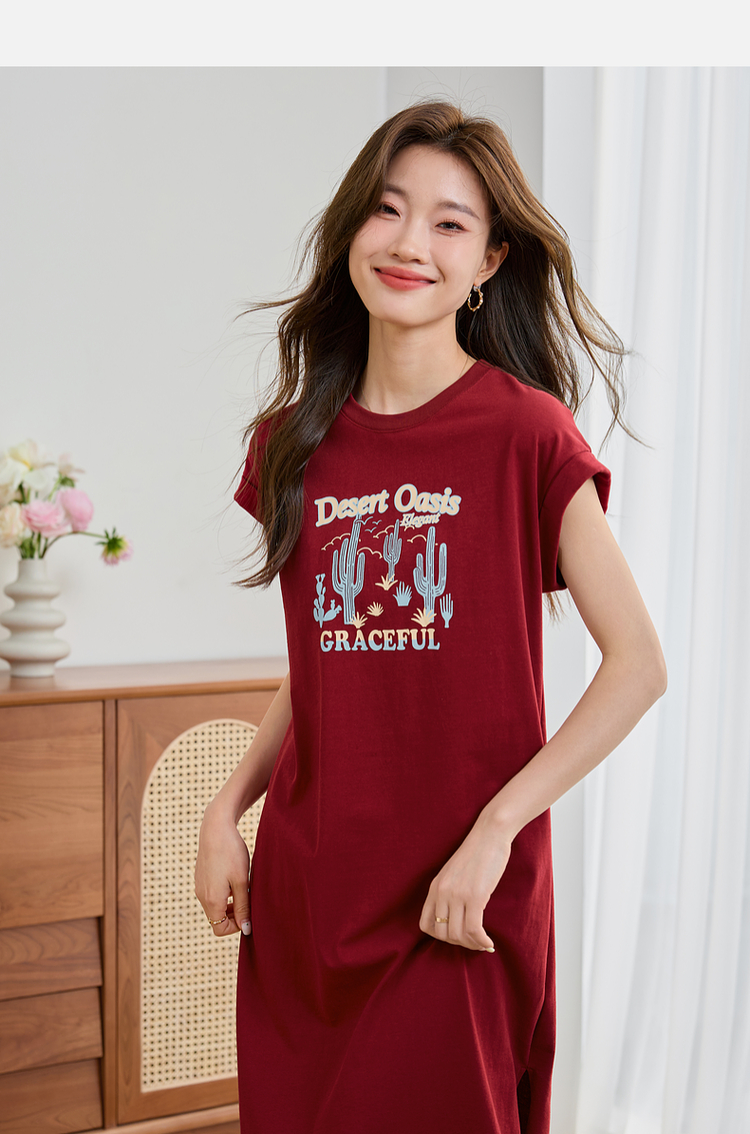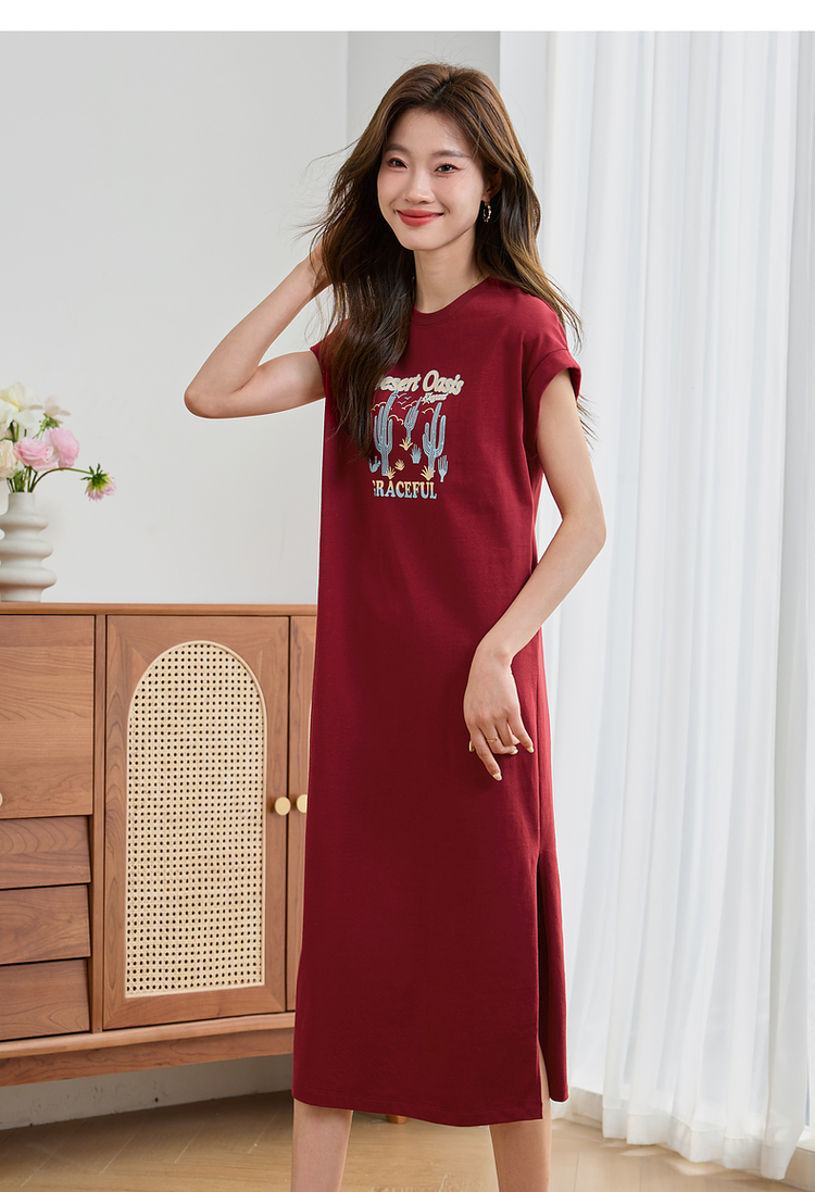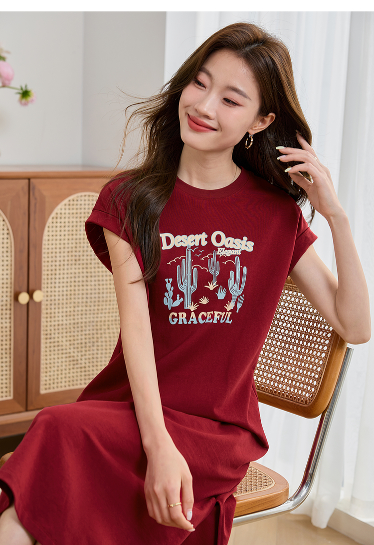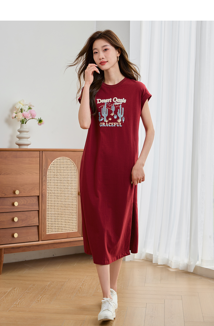 【专属特价】熙世界落肩袖宽松休闲连衣裙夏季新款美式印花纯棉开叉T恤裙子