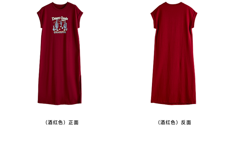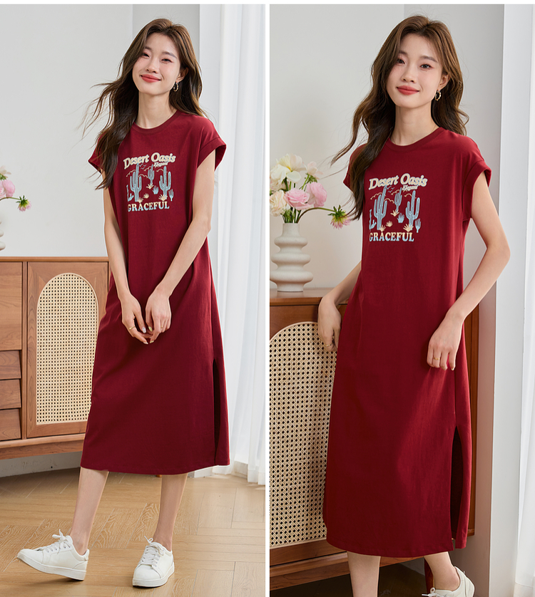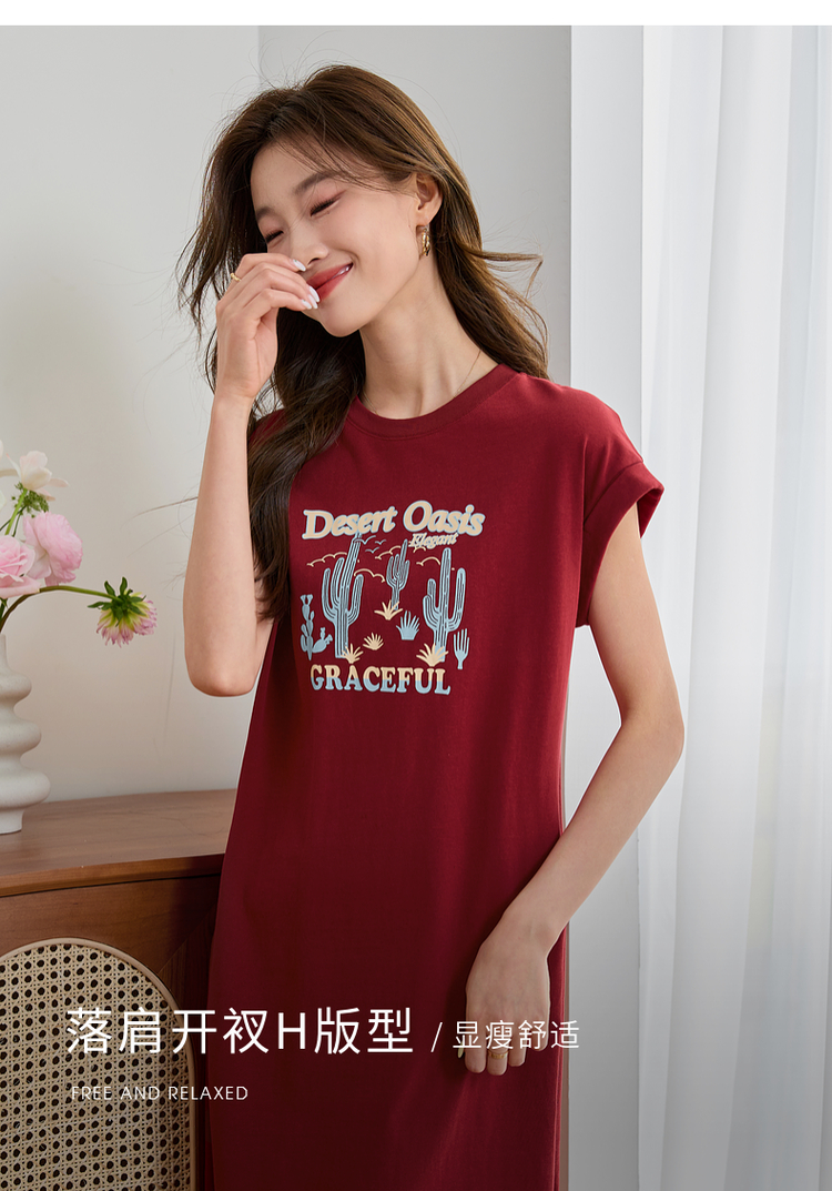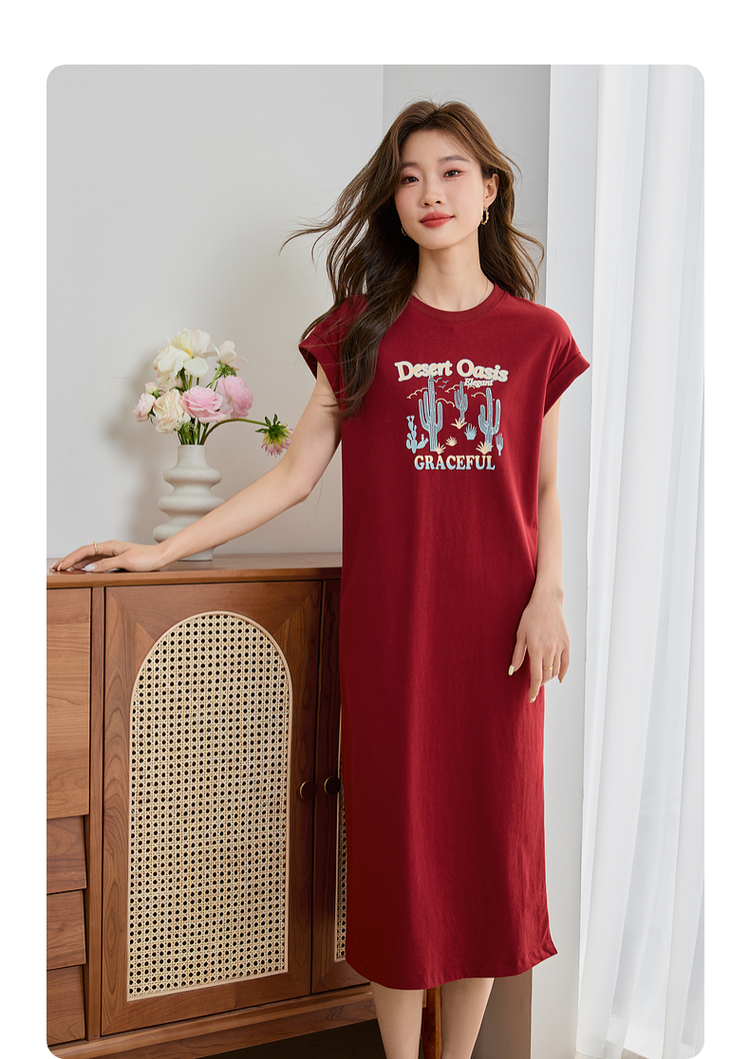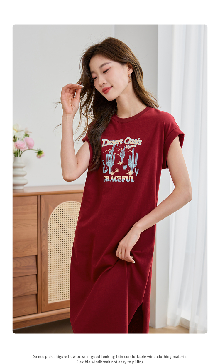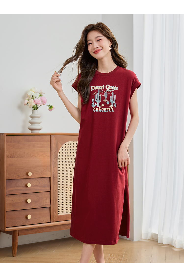 【专属特价】熙世界落肩袖宽松休闲连衣裙夏季新款美式印花纯棉开叉T恤裙子