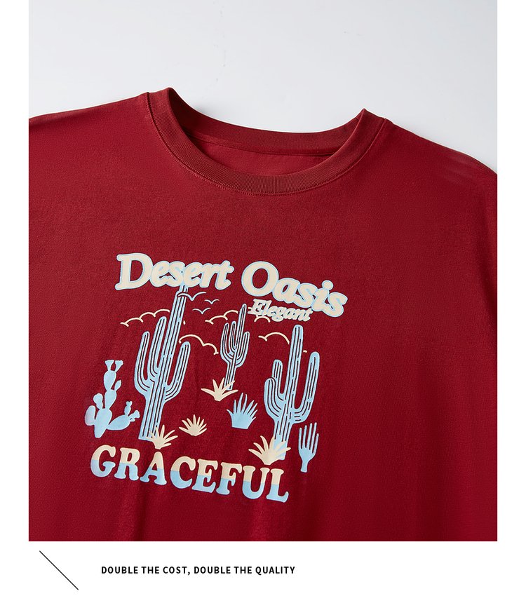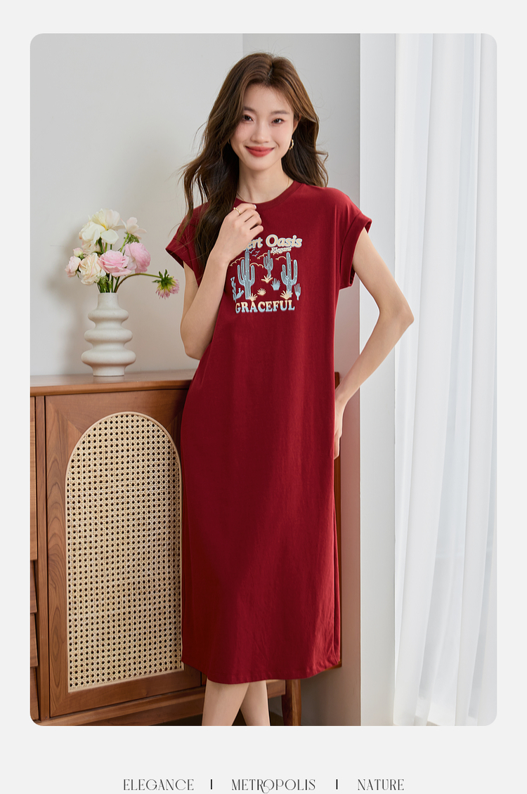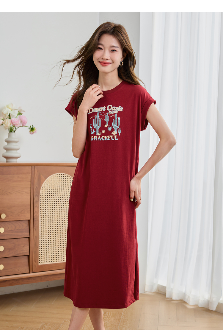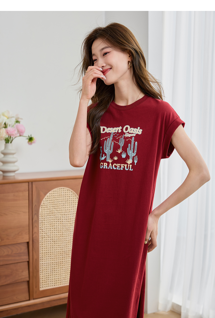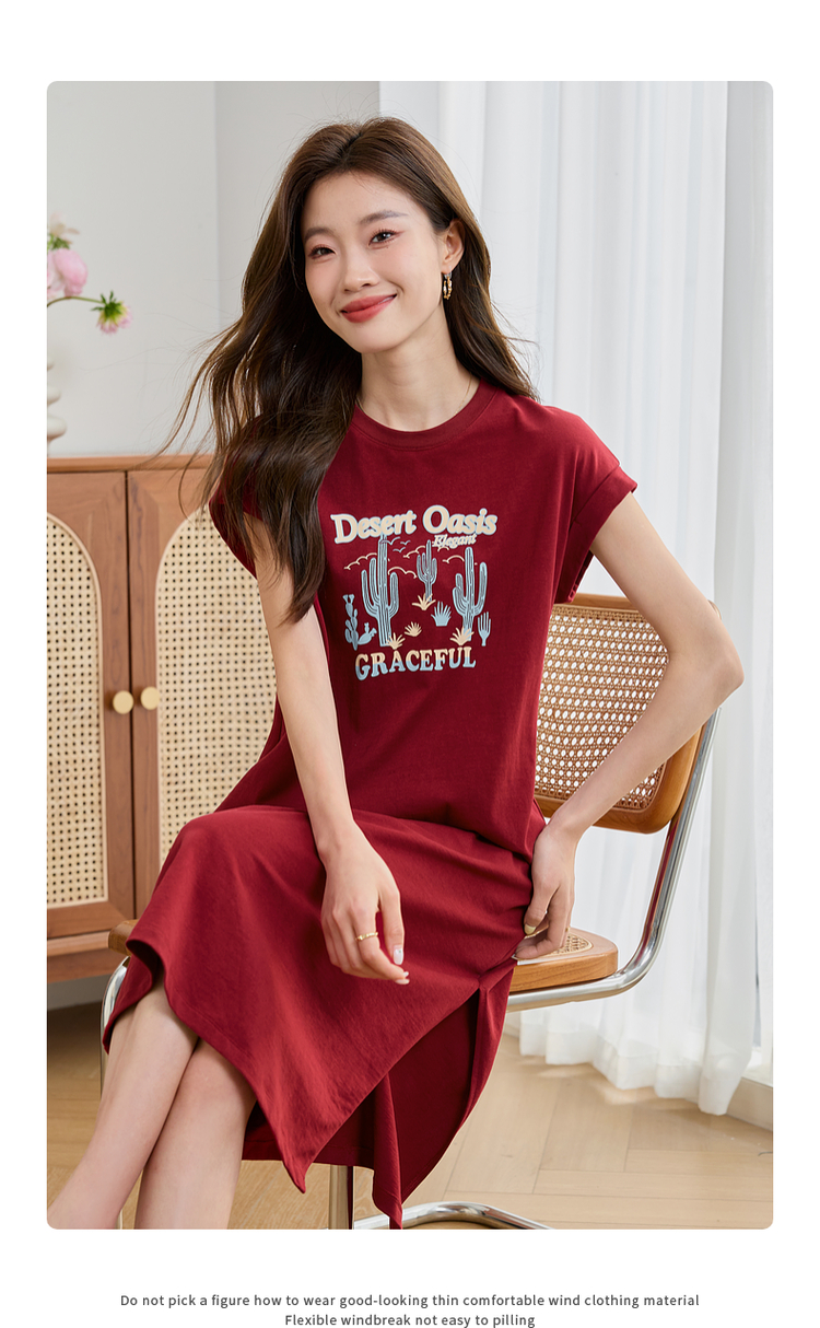 【专属特价】熙世界落肩袖宽松休闲连衣裙夏季新款美式印花纯棉开叉T恤裙子