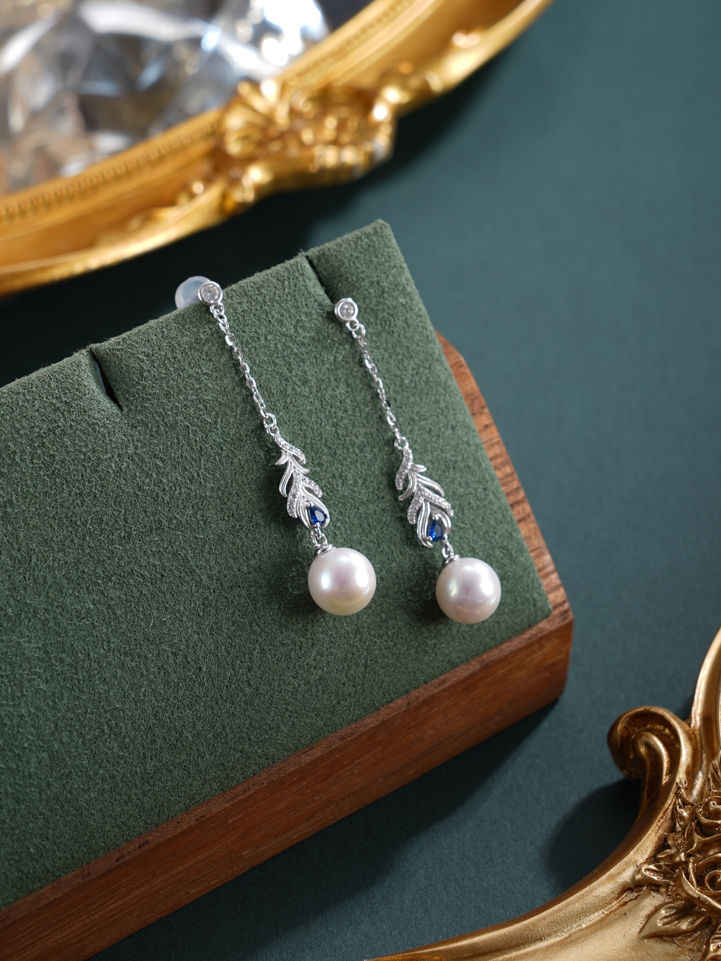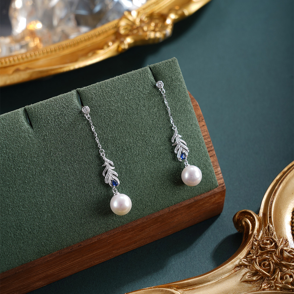 子佩集【翠羽翎华】银S925珍珠惜王妃耳钉【MLEH011】8.5mm珠孔雀羽毛流苏蓝2601