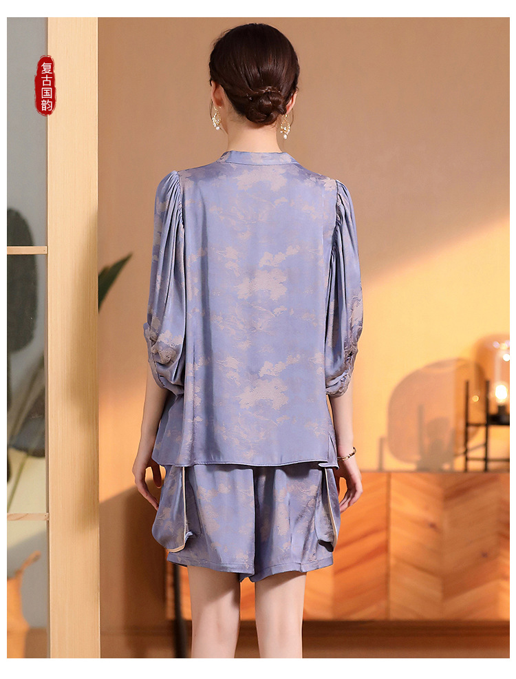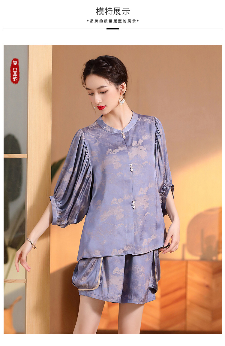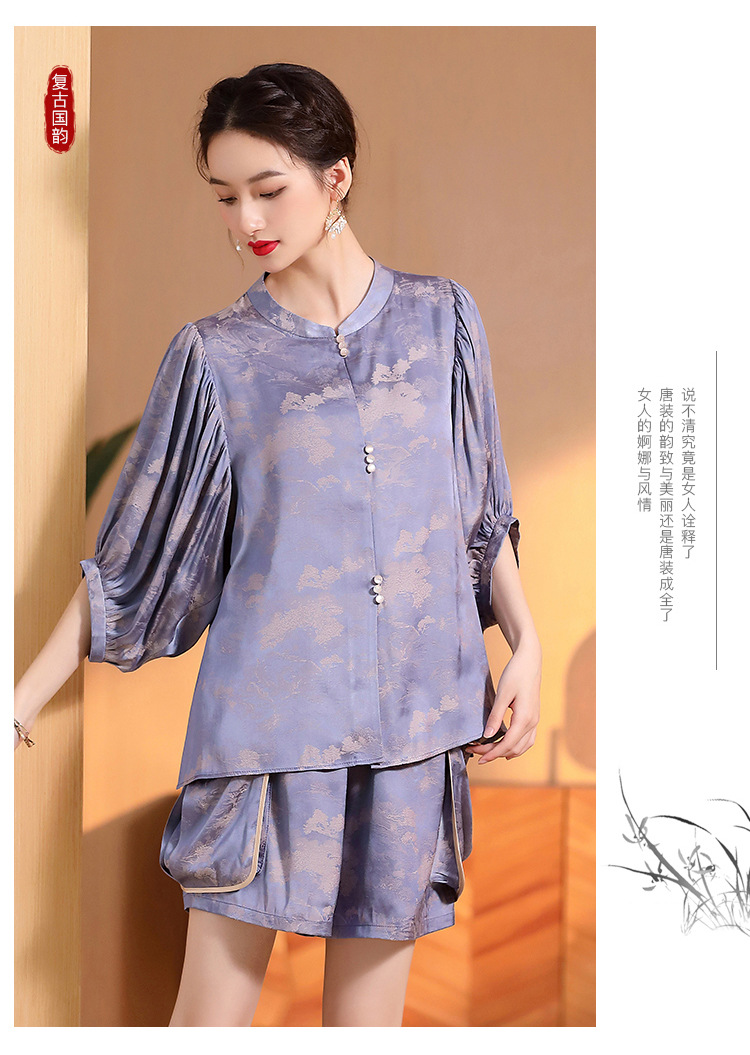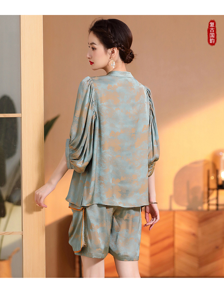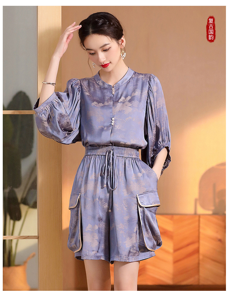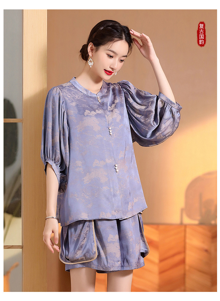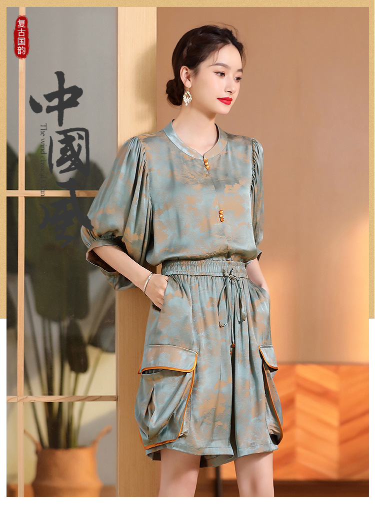 人丝提花泡泡袖改良唐装上衣女+口袋宽松短裤AYK-230512