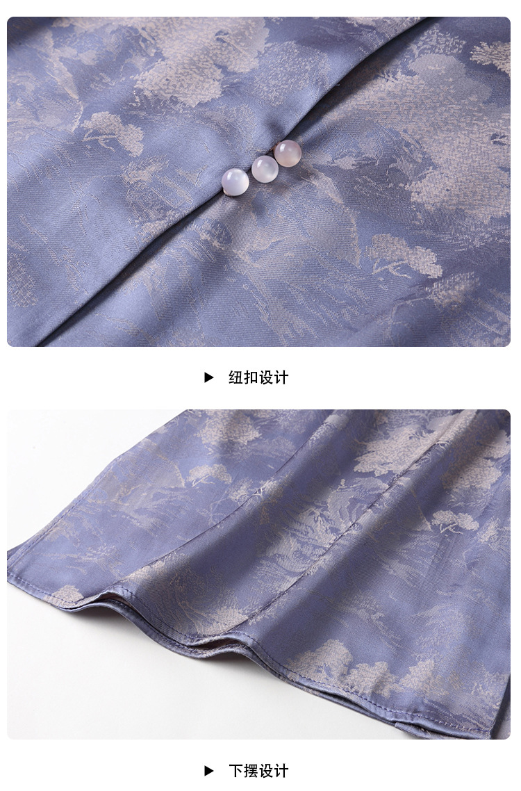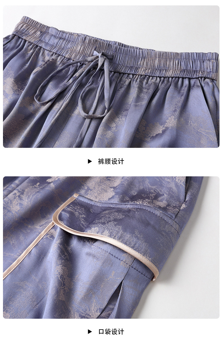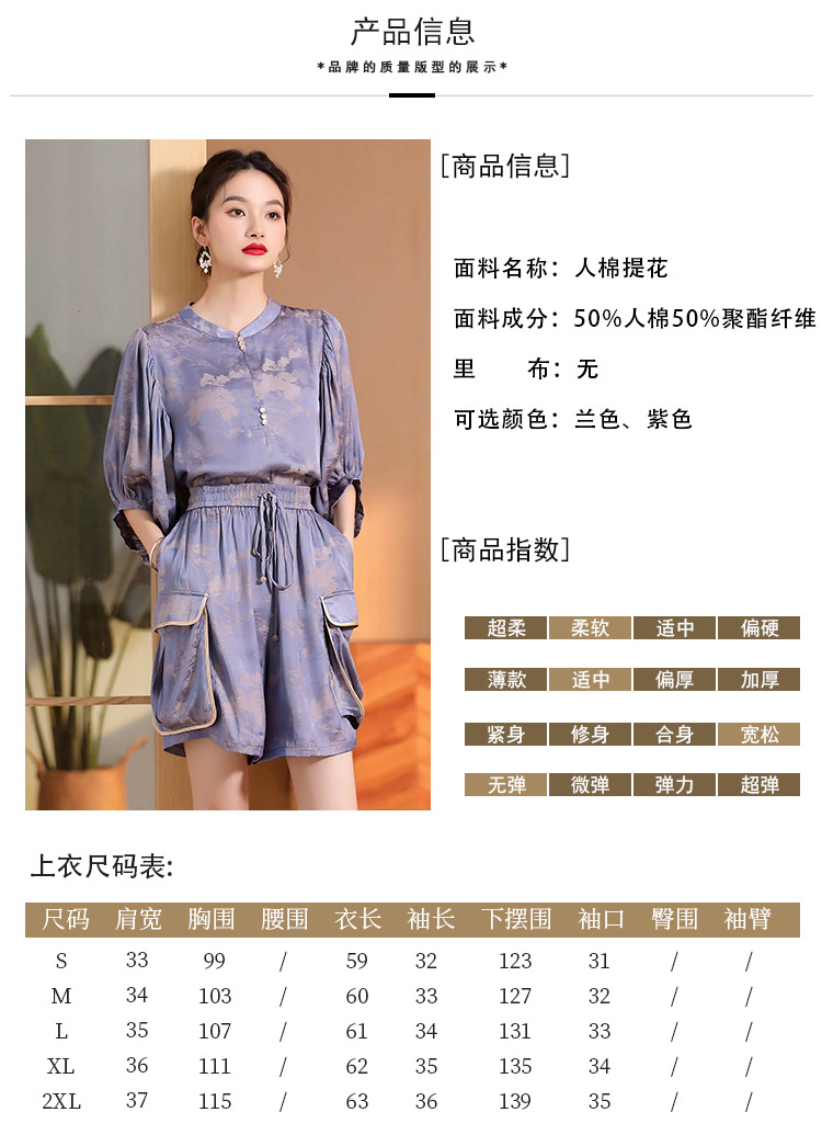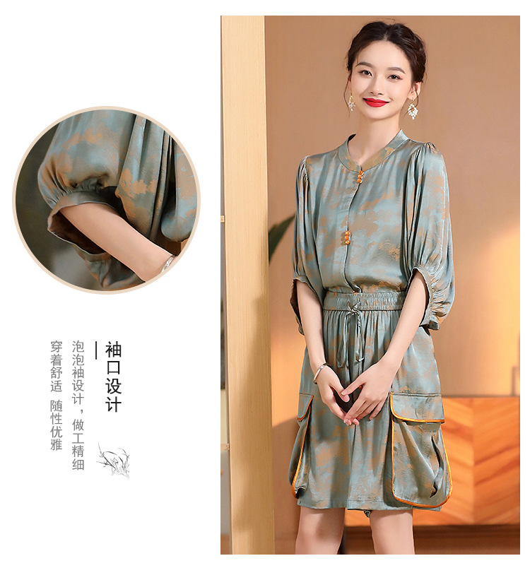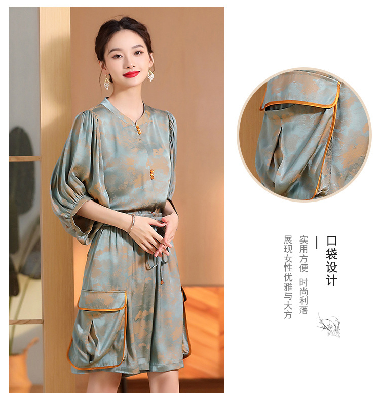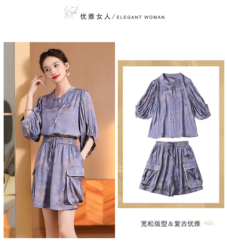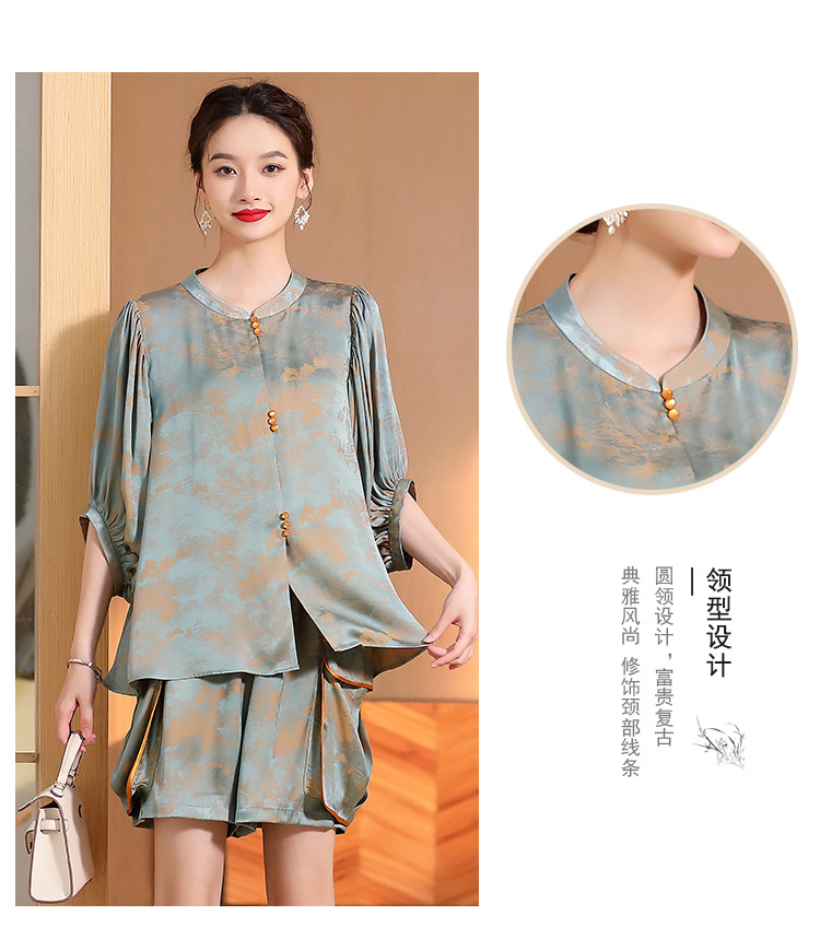人丝提花泡泡袖改良唐装上衣女+口袋宽松短裤AYK-230512