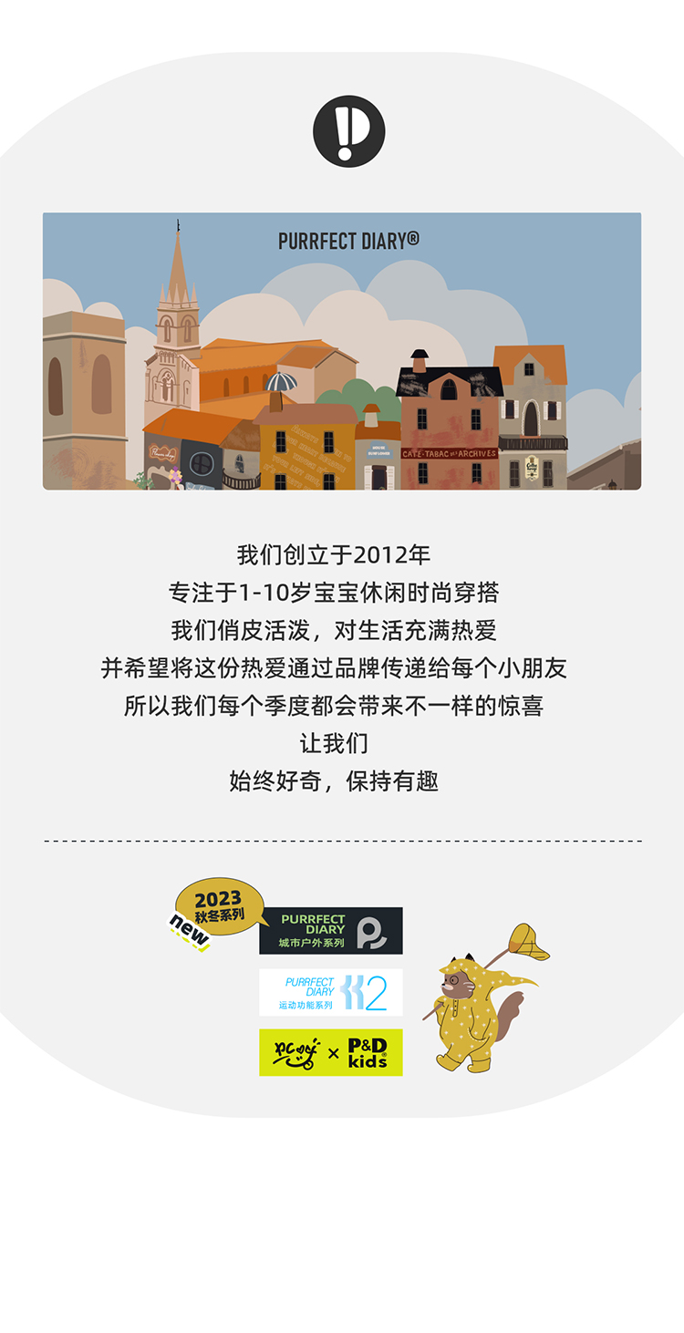 - Purrfect-Diary专注于贴近自然随性的穿着概念,轻奢平价的童装文化传播,在产品设计上更加注重婴童穿着的舒适性、安全性、更出众的国际化品牌,将欧美的育婴文化在中国进行深入的传播与推广。