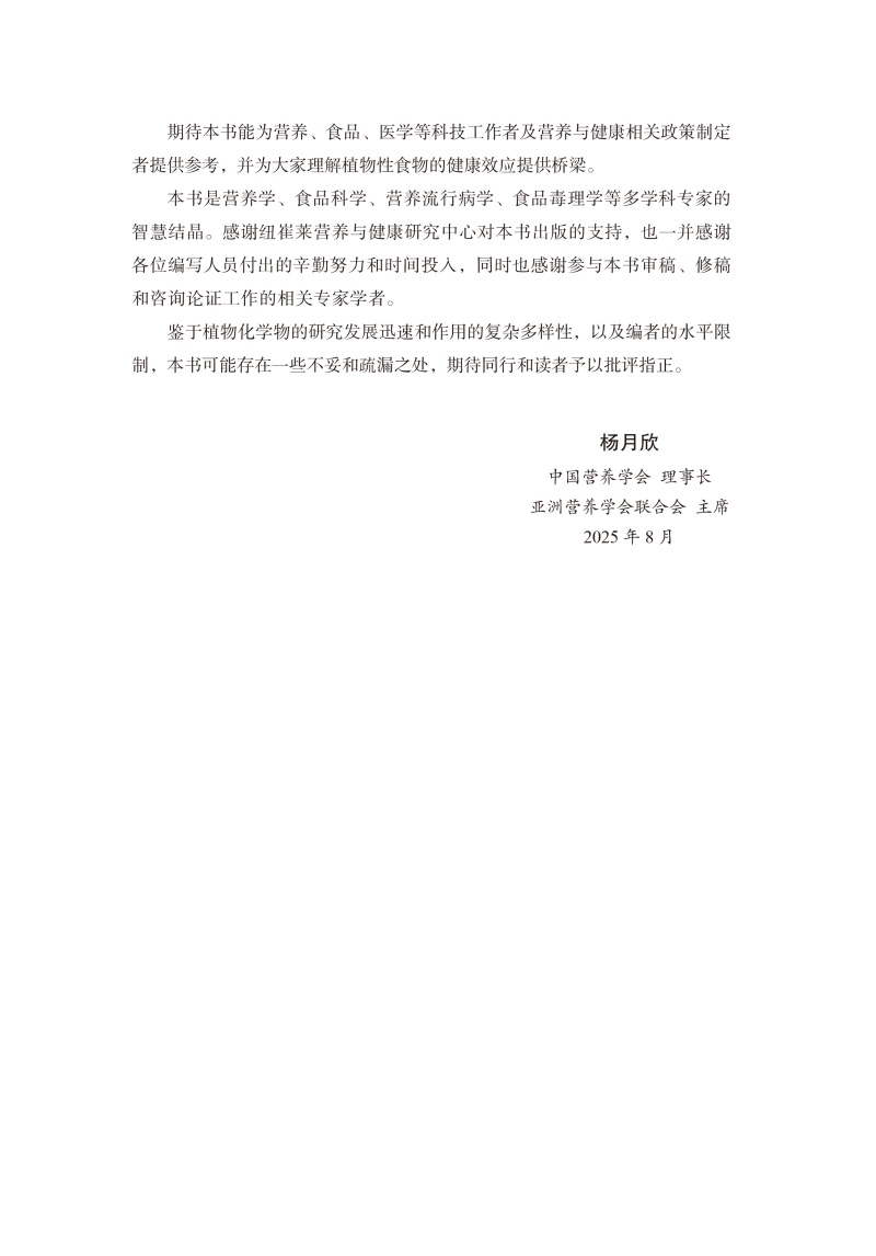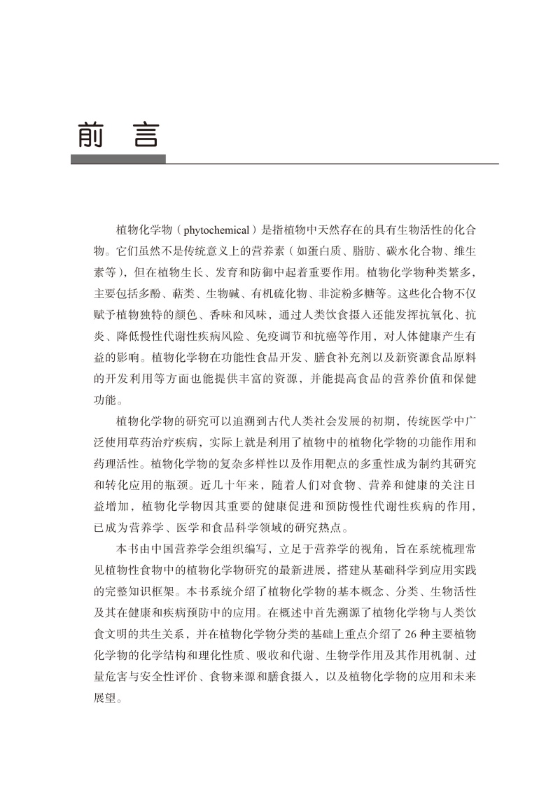 中国营养学会组织从事植物化学物研究的相关专家撰写了此本《食物植物化学物与人类健康概论》科学专著。本书的编写立足于学科交叉的视角,旨在系统梳理植物性食物中的植物化学物研究的最新进展,搭建从基础科学到应用实践的完整知识框架。本书系统介绍了植物化学物的基本概念、分类、生物活性及其在健康和疾病预防中的应用。在概述中首先溯源植物化学物与人类饮食文明的共生关系;并在植物化学物分类的基础上,重点介绍了26种主要植物化学物的理化性质、吸收代谢和利用、生物学作用及其作用机制、过量危害与安全性评价、食物来源和膳食摄入,以及植物化学物的应用和未来展望。