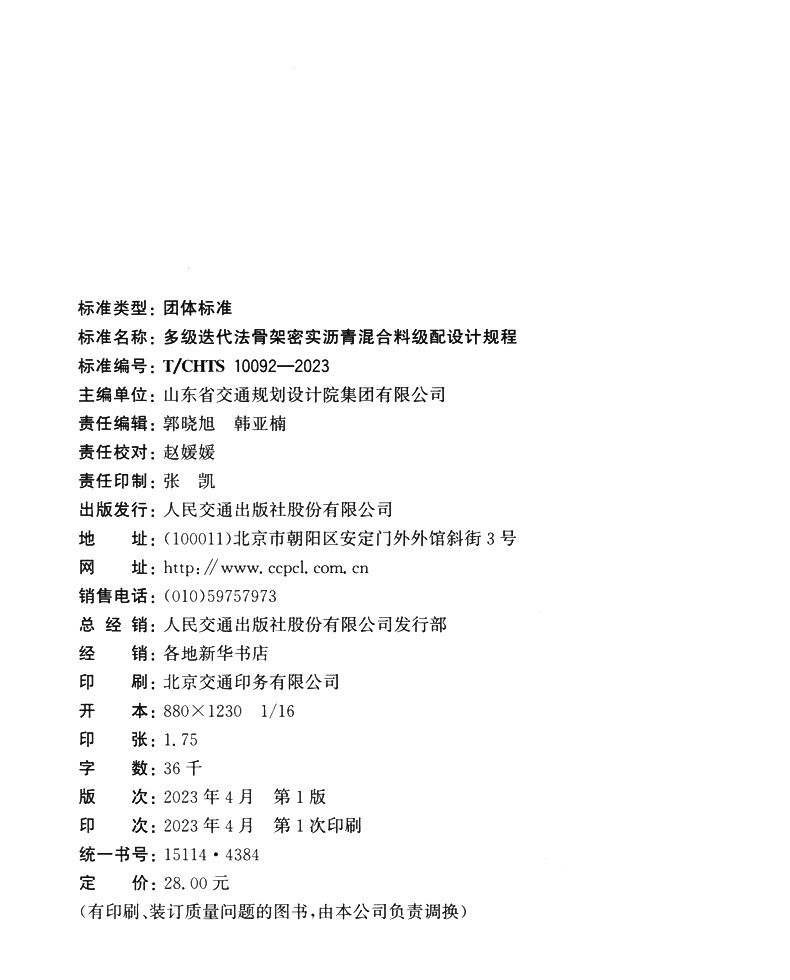 书名:多级迭代法骨架密实沥青混合料级配设计规程(T/CHTS 10092—2023)