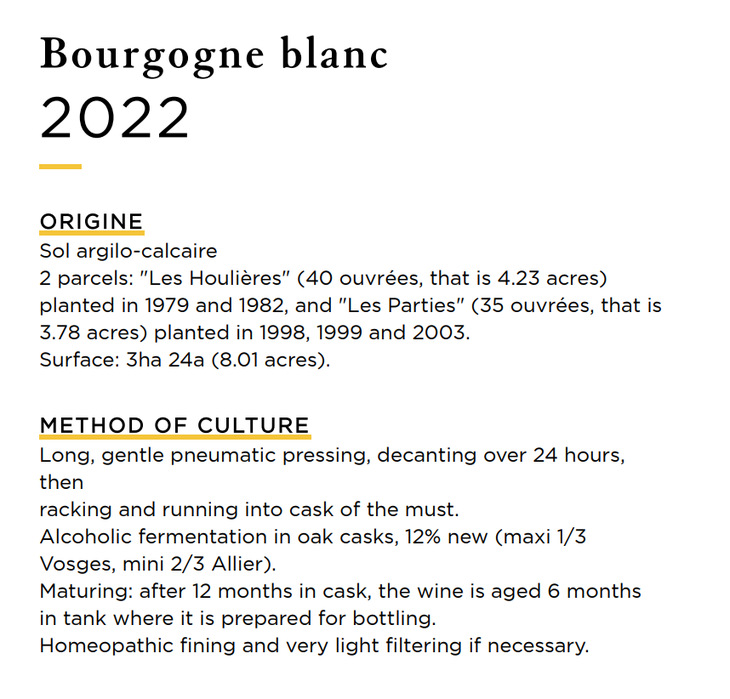 这款酒的酿造葡萄均来自双鸡家自家的葡萄田,其中“Les Houlières”田块面积为4.23英亩(40 ouvrées),种植于1979年与1982年,为较老藤,风味更浓郁复杂。Les Partie田块面积3.78英亩(35 ouvrées),种植于1998、1999及2003年,包含不同树龄葡萄,兼具成熟度与清新感。