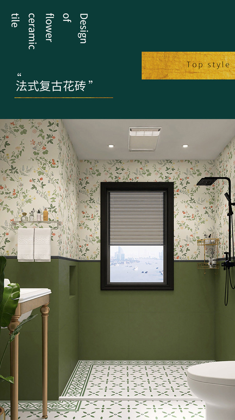 艺术阳台法式绿色浴室地砖厨房仿花砖全瓷瓷砖卫生间墙纸复古墙砖