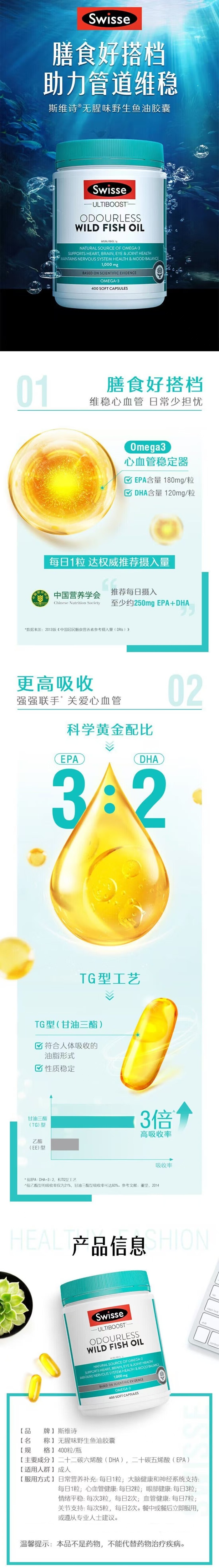 【保税仓】Swisse/斯维诗无腥味深海鱼油软胶囊400粒/瓶(胶囊装)