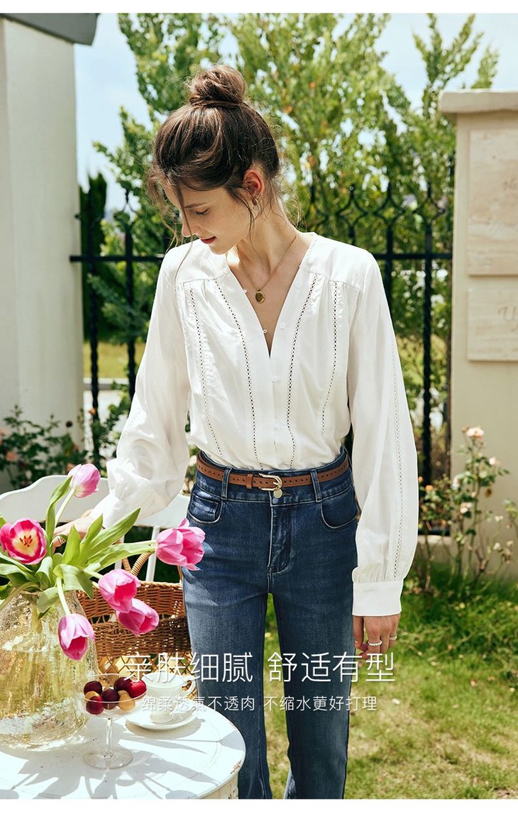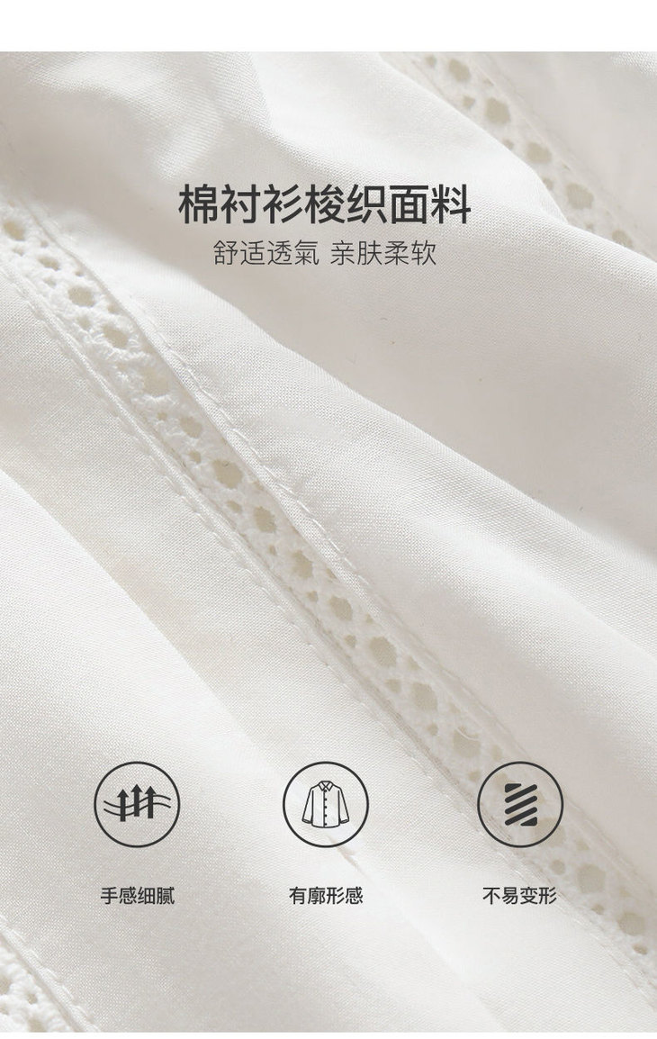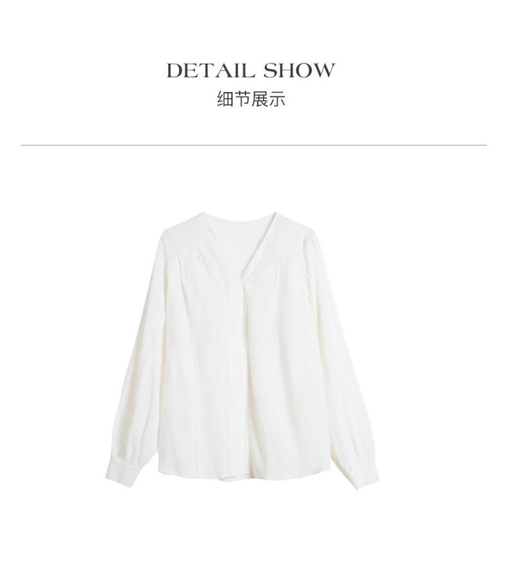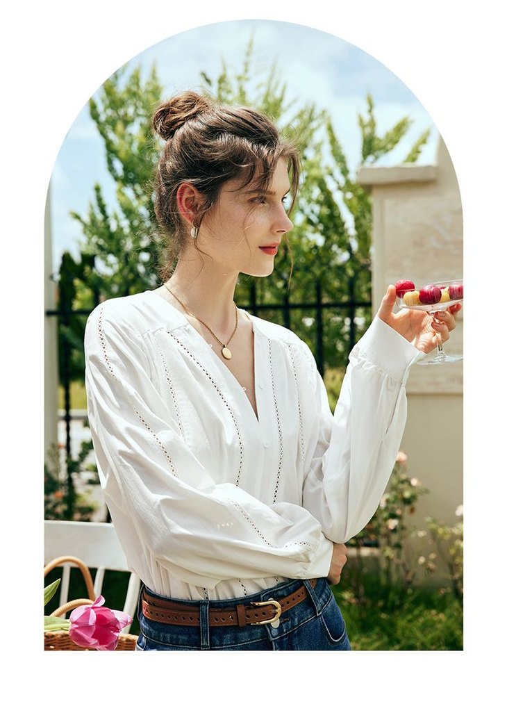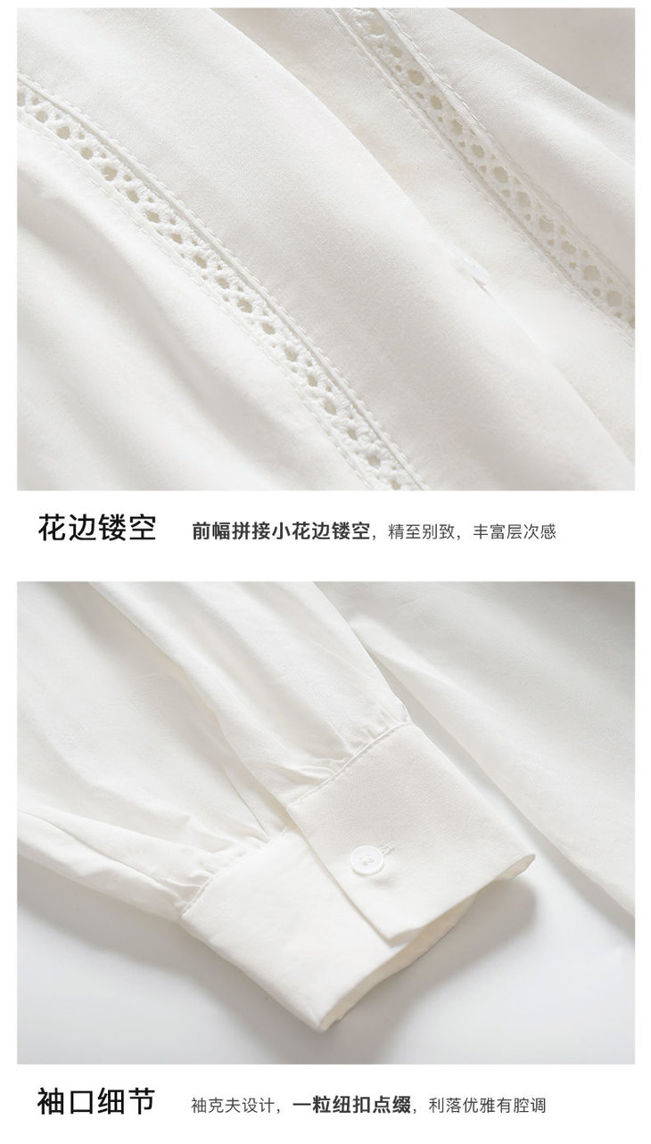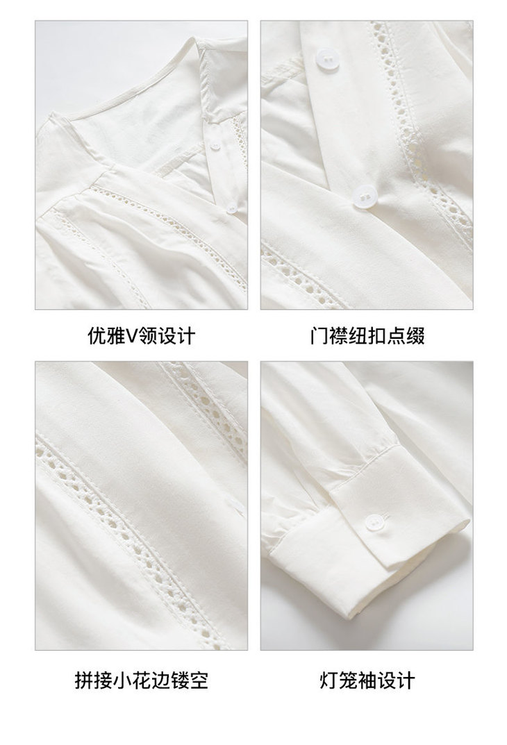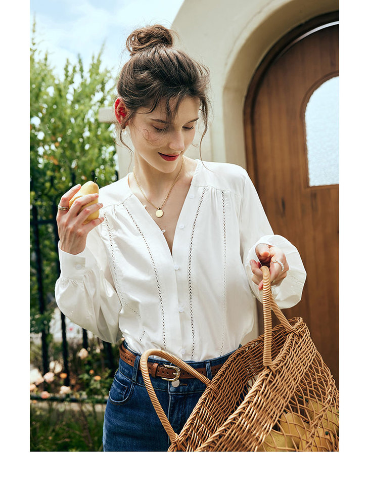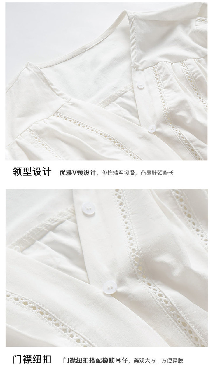 OLrain欧芮儿法式白色V领衬衫女夏季2023新款宽松镂空灯笼袖衬衣
