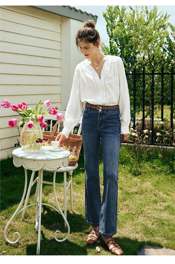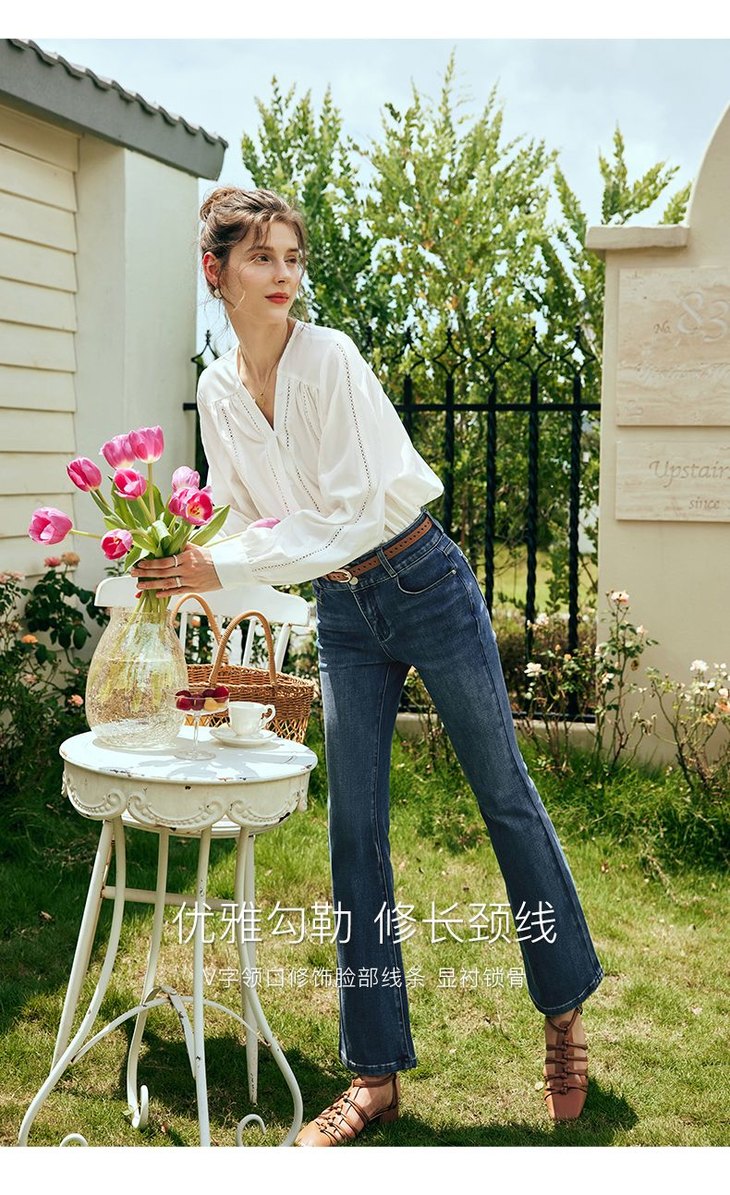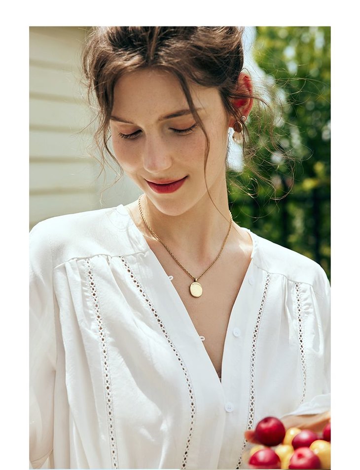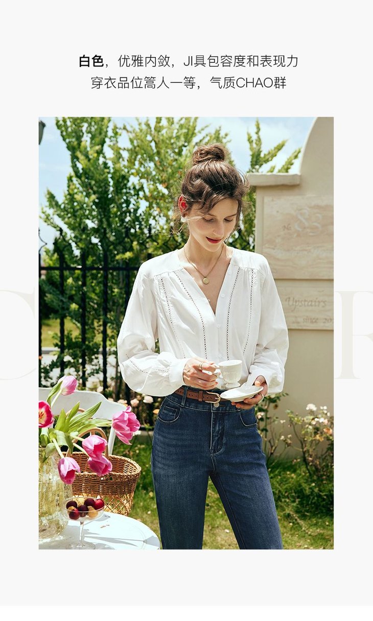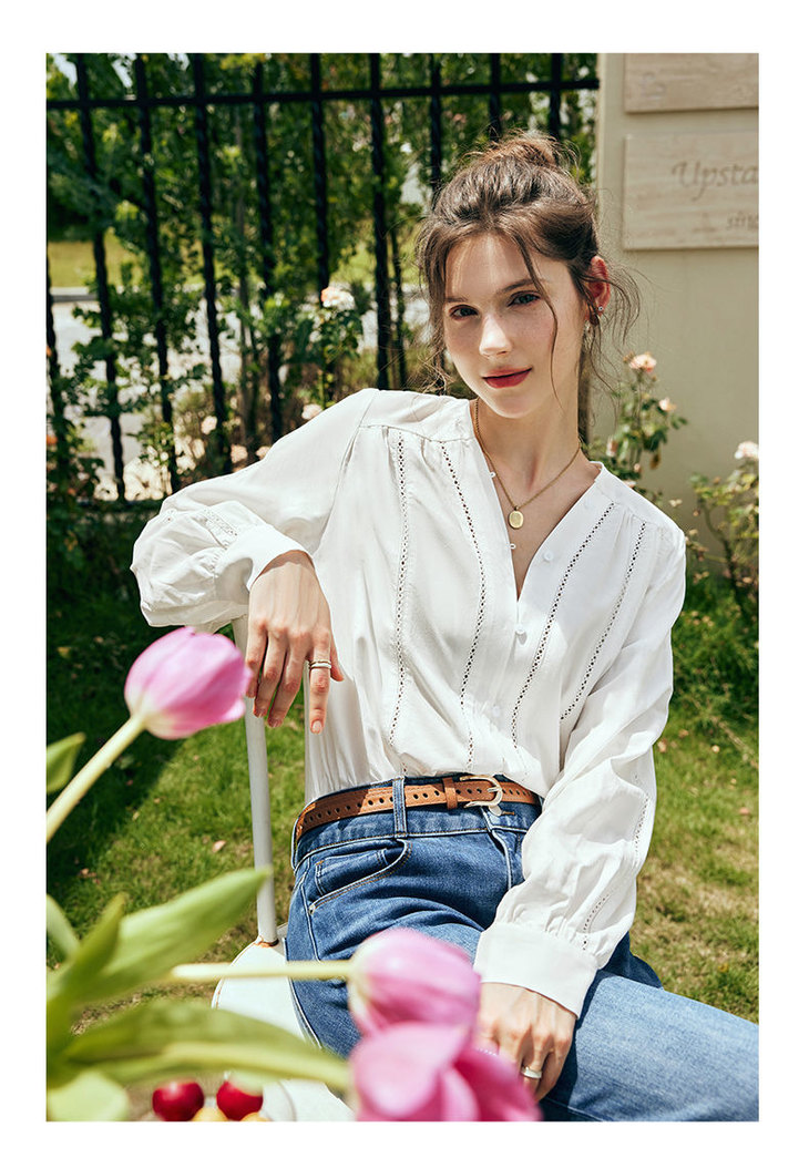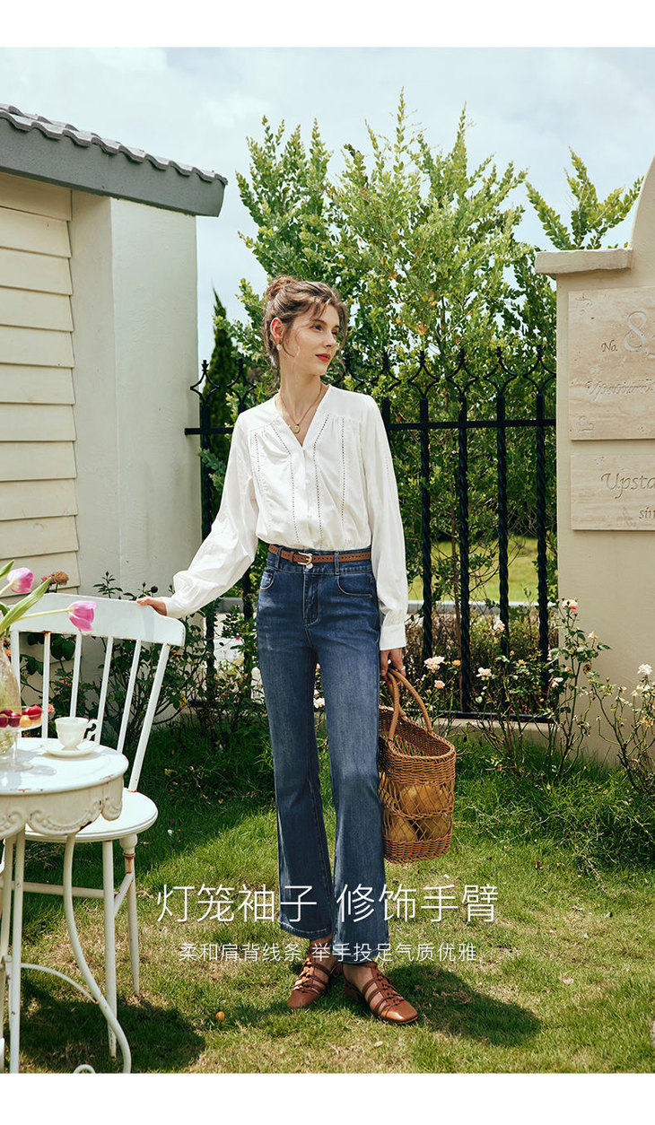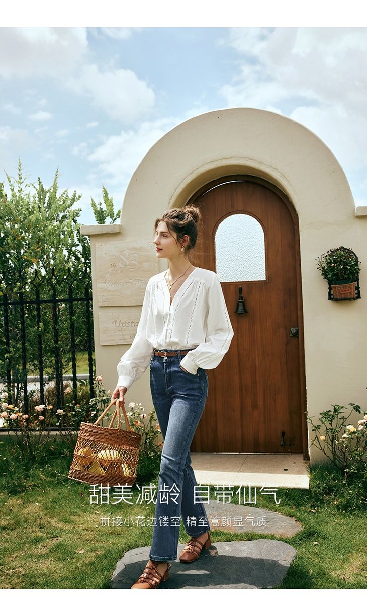 OLrain欧芮儿法式白色V领衬衫女夏季2023新款宽松镂空灯笼袖衬衣