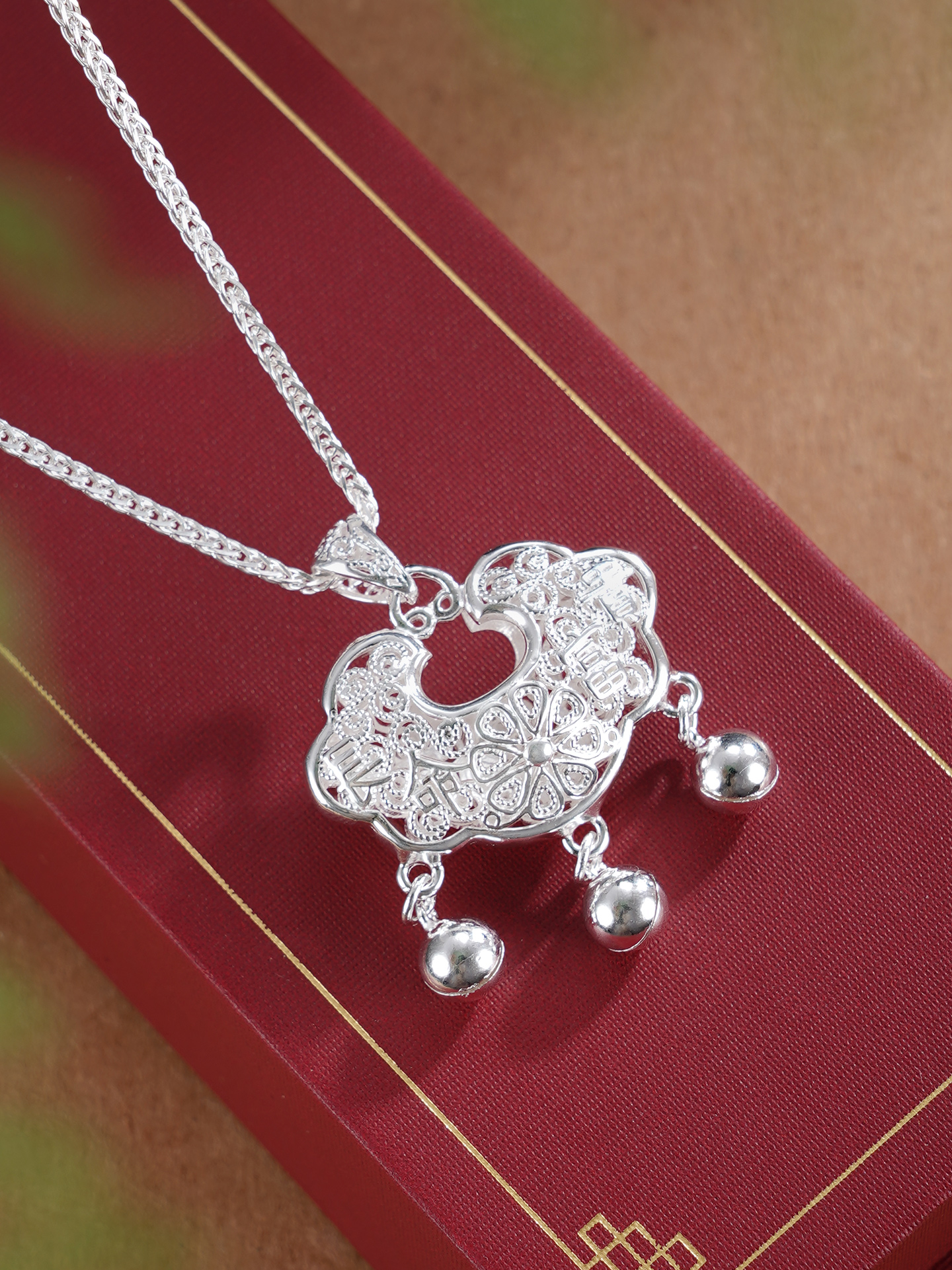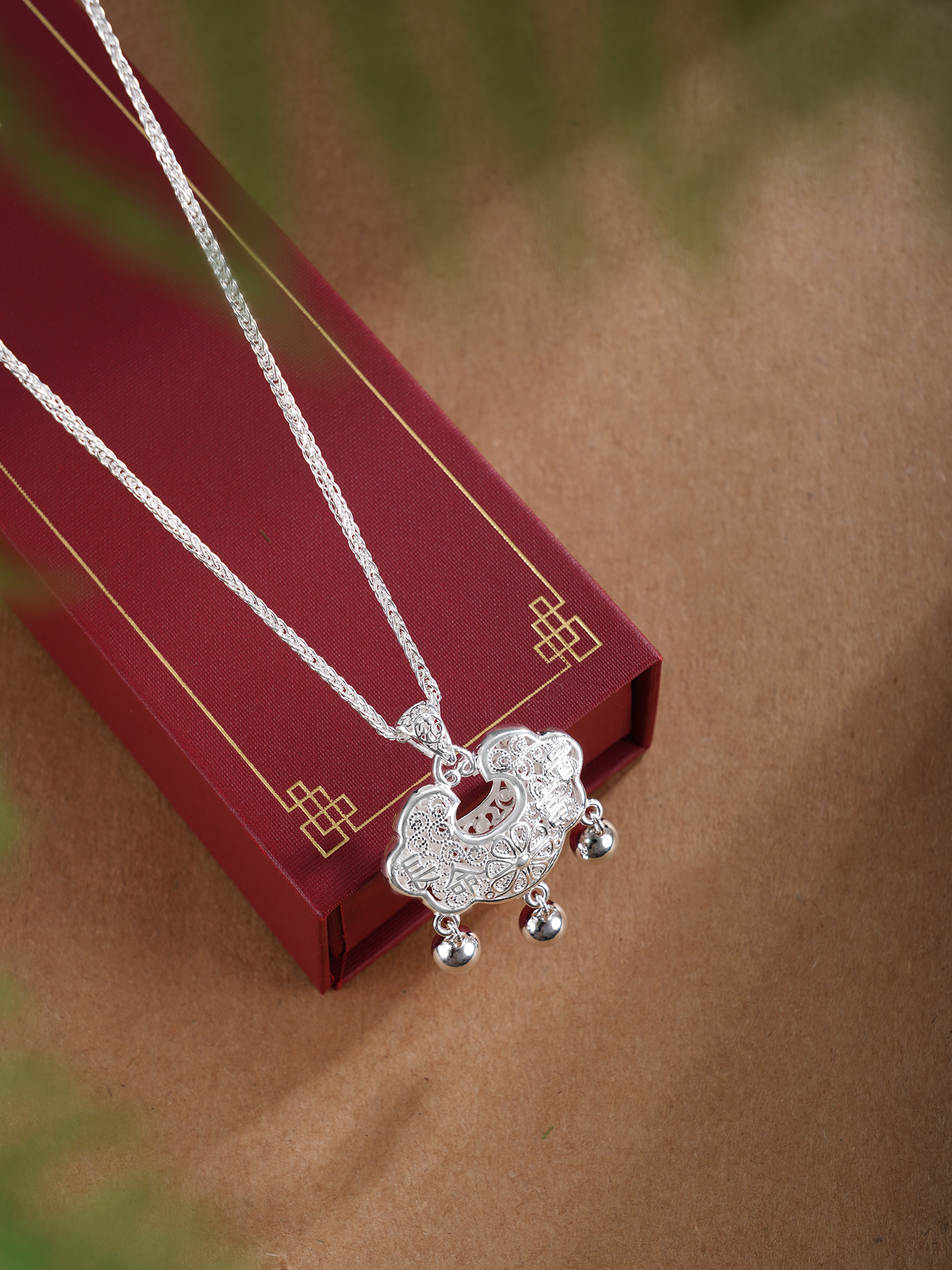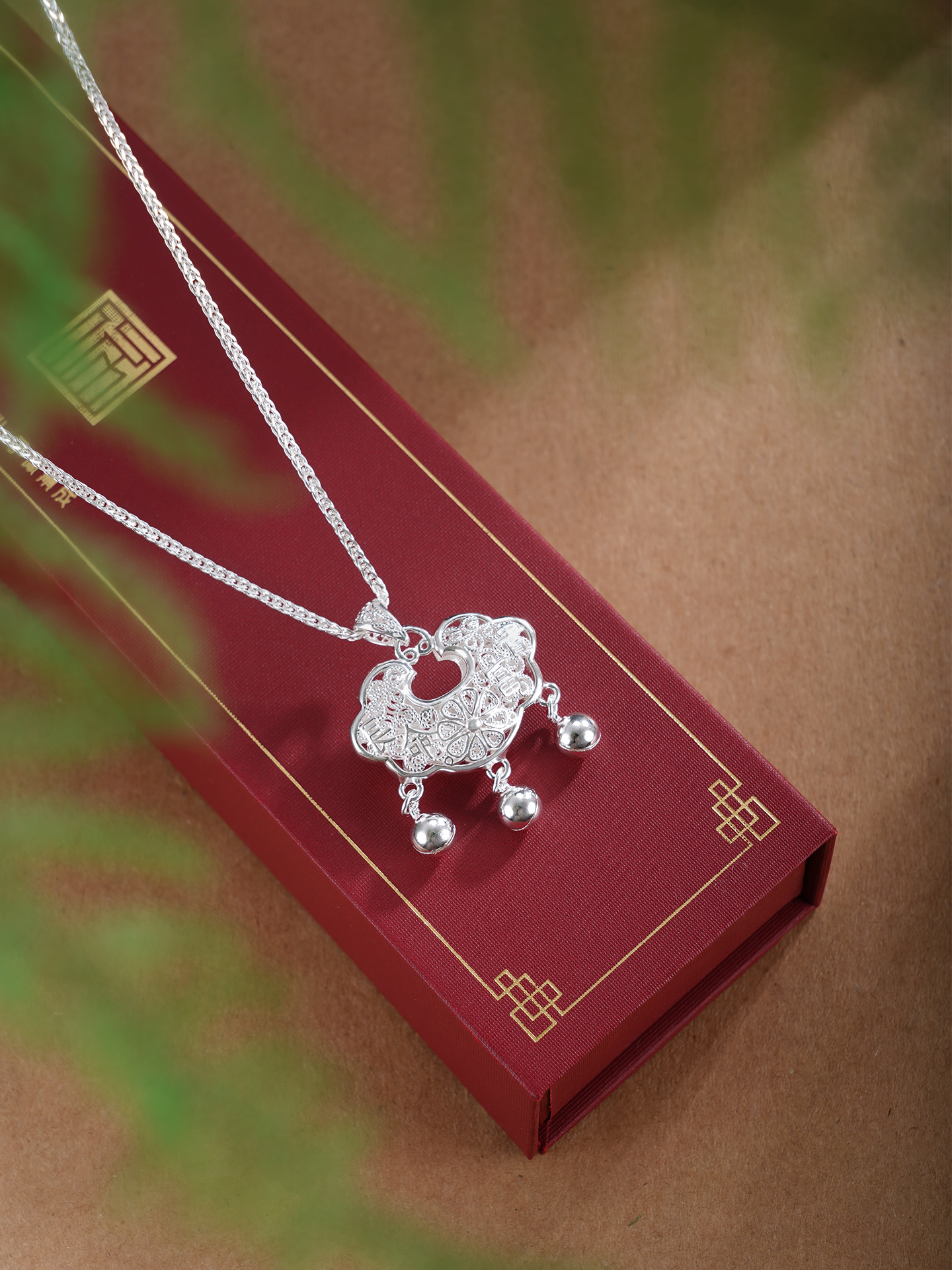 【寓意】:如意锁吊坠,以银花丝工艺打造,表面浮雕“长命富贵”文字与花朵纹样,寓意将美好与祝福长久锁住,愿宝宝一生长命幸福。