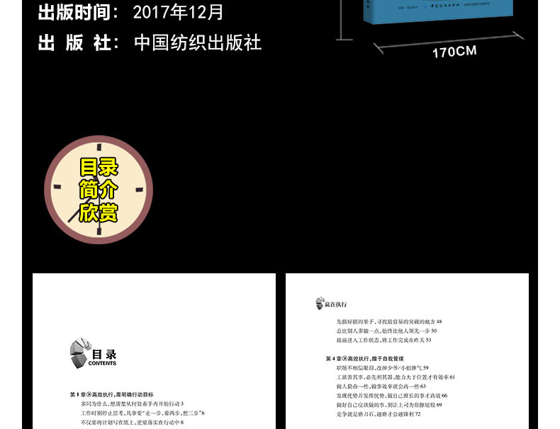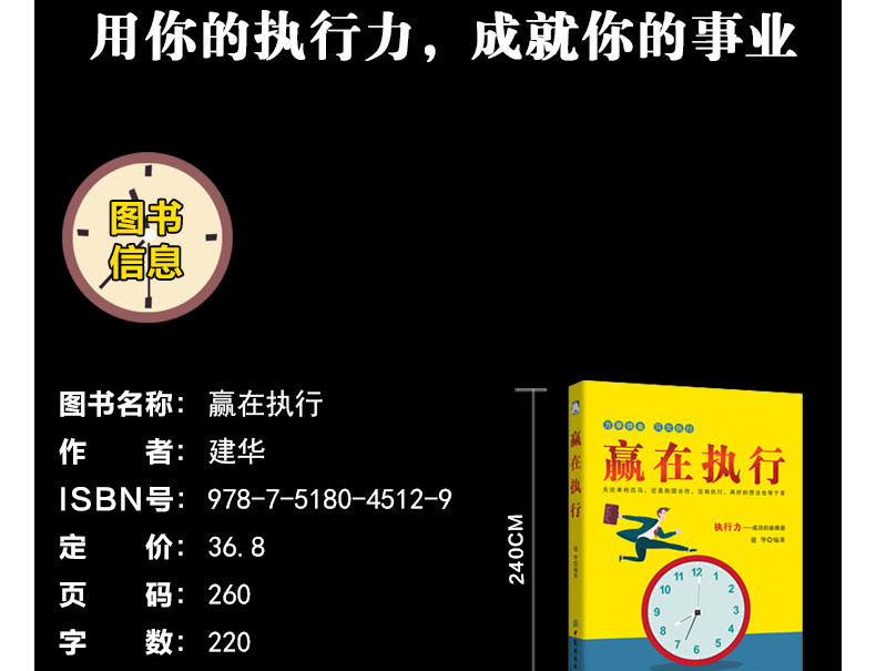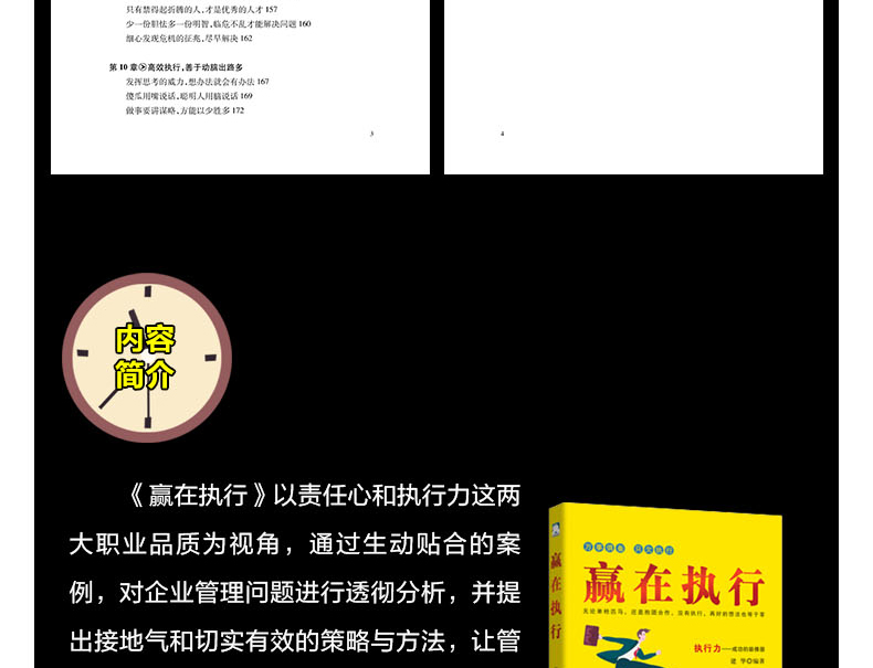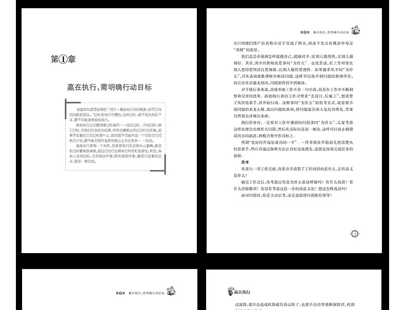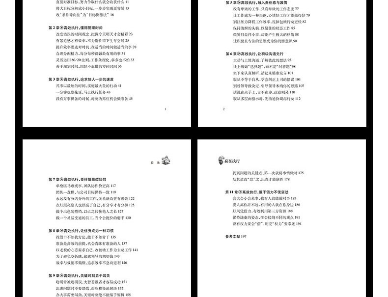 章高效执行,需明确行动目标工作时别停止思考,凡事要“走一步,看两步,想三步”直接对准目标,努力争取什么就会收获什么改“条件导向法”为“目标倒推法”改变错误的时间观念,把握今天明天才会精彩提升效率要选对时机,在适当的时间做适当的事灵活运用80/20法则:工作条理化,事多也不怕第3章高效执行,追求快人一步的速度一分钟也别拖延,马上执行任务先摘好摘的果子,寻找容易的突破的地方提前进入工作状态,将工作完成在昨天职场不相信眼泪,改掉少爷/小姐脾气做人勤奋一些,做事效率就会高一些做好自己应该做的事,别让上为你擦股第5章高效执行,融入责任感与激情让工作成为一种兴趣,心情好工作才能做得好保持清醒的头脑,以的状态工作让积极且专注的思维成为你的潜意识主动与上级沟通,了解彼此的想法坐下来认真倾听,站起来精准发言别替领导做决定,引导领导纳你的思路服从多层面指示时,先沟通协调再行动单枪匹马难成事,团队协作价更高永远没有分内分外的工作,关系融洽更有成效做个出色的搭档,以己之长换他人之长第8章高效执行,让成为一种习惯准备是高效的前提,机会青睐有准备的人为了避免空折腾,超越领导的期望值第9章高效执行,关键时刻勇于闯关出现问题时不要恐慌,而应积极地解决只有禁得起折腾的人,才是的人才细心发现危机的征兆,尽早解决发挥思考的威力,想办法就会有办法做事要讲谋略,方能以少胜多反其道而“思”之,出奇才能制胜会大会小会来事,找对人就能做对事好风凭借力,有效利用第三方资源没有权力要会“借”,用完“权力”要奉还参考文献