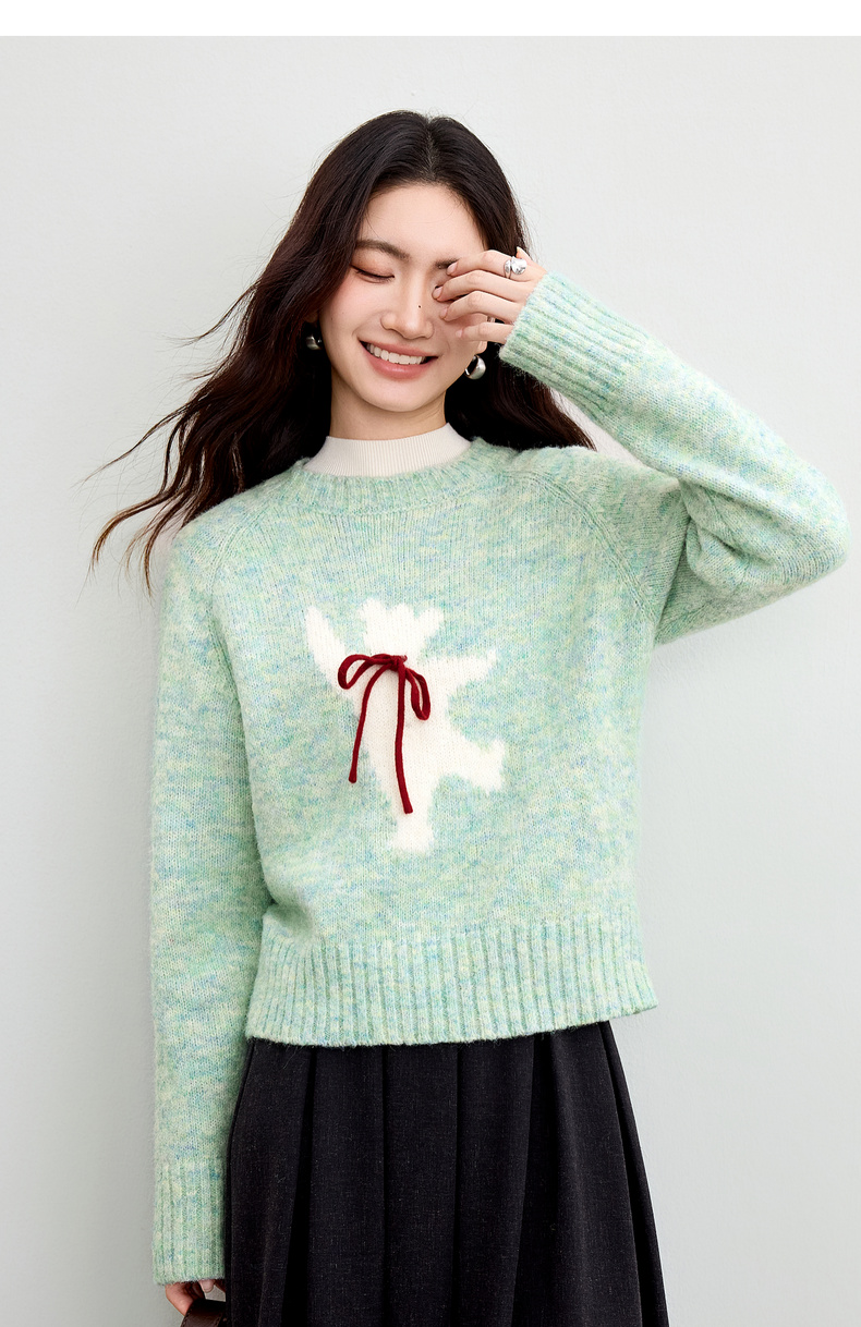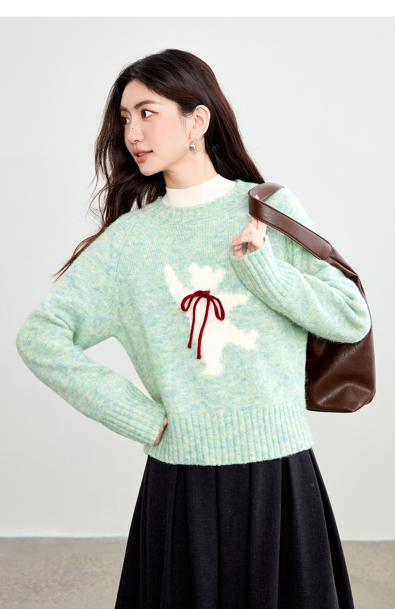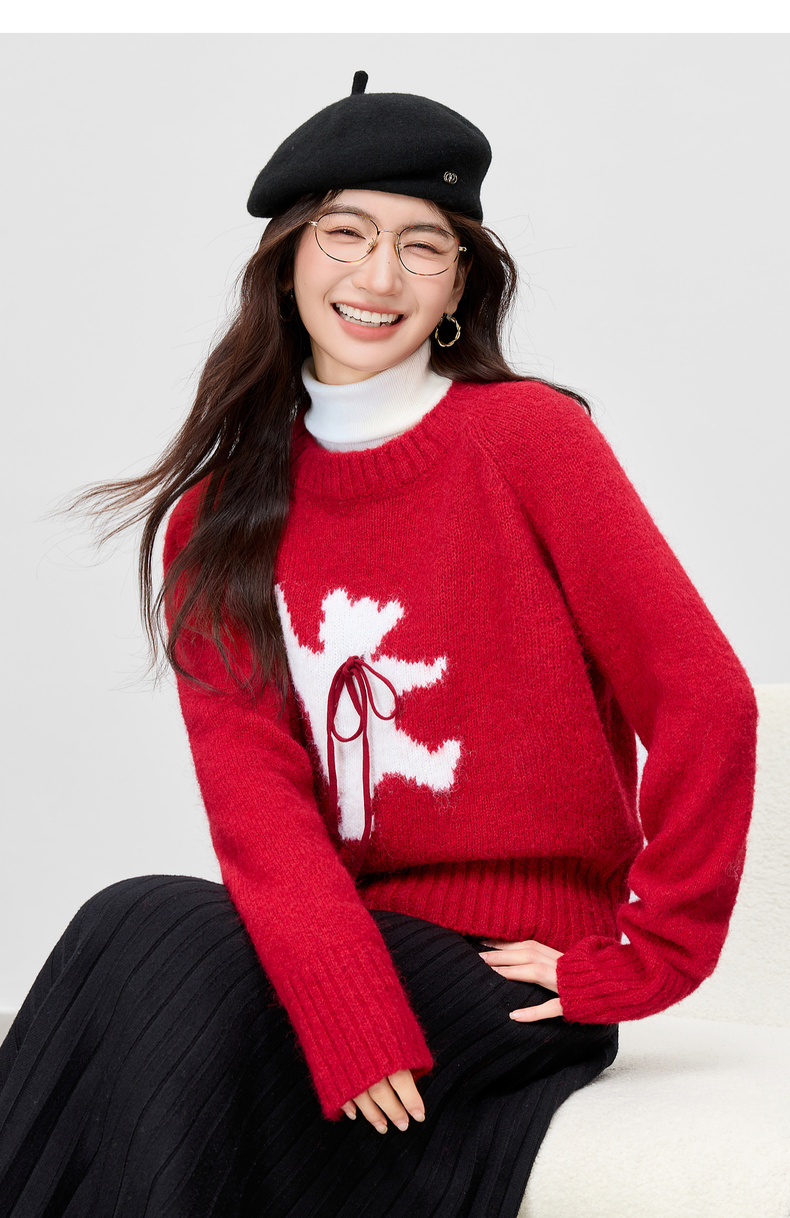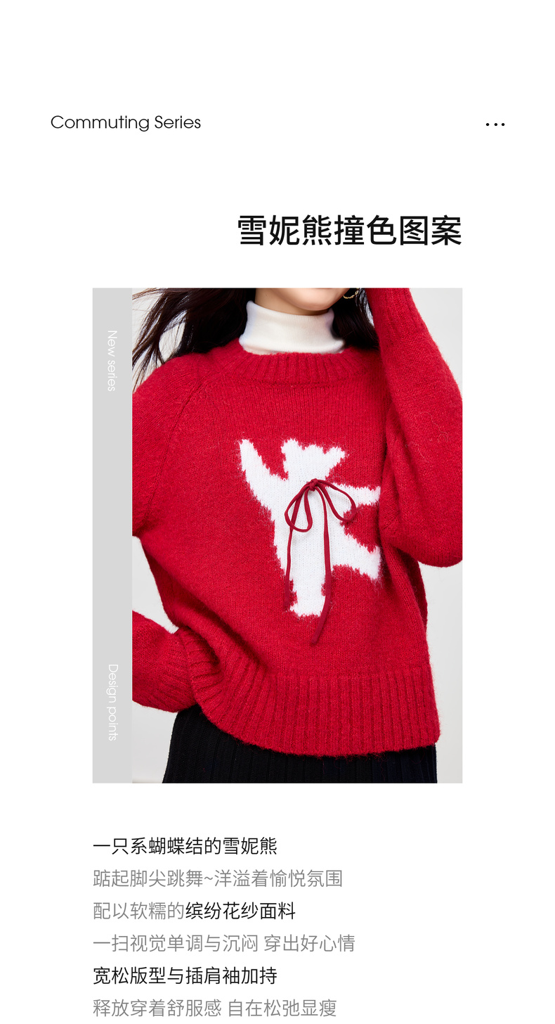 【内购】【雪妮熊】简约通勤圆领撞色蝴蝶结小熊图案宽松含绵羊毛花纱毛衣-W53EE3423