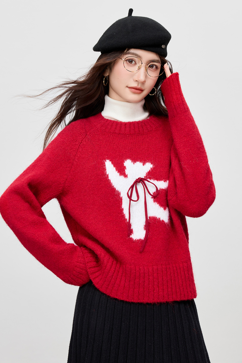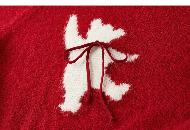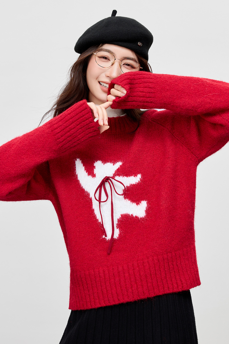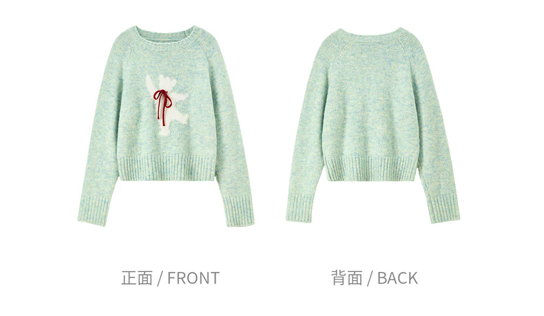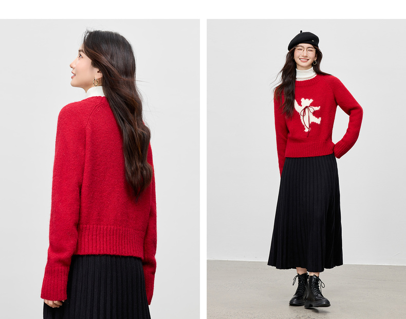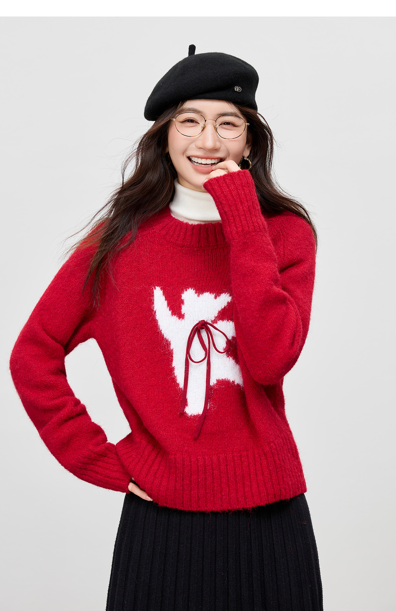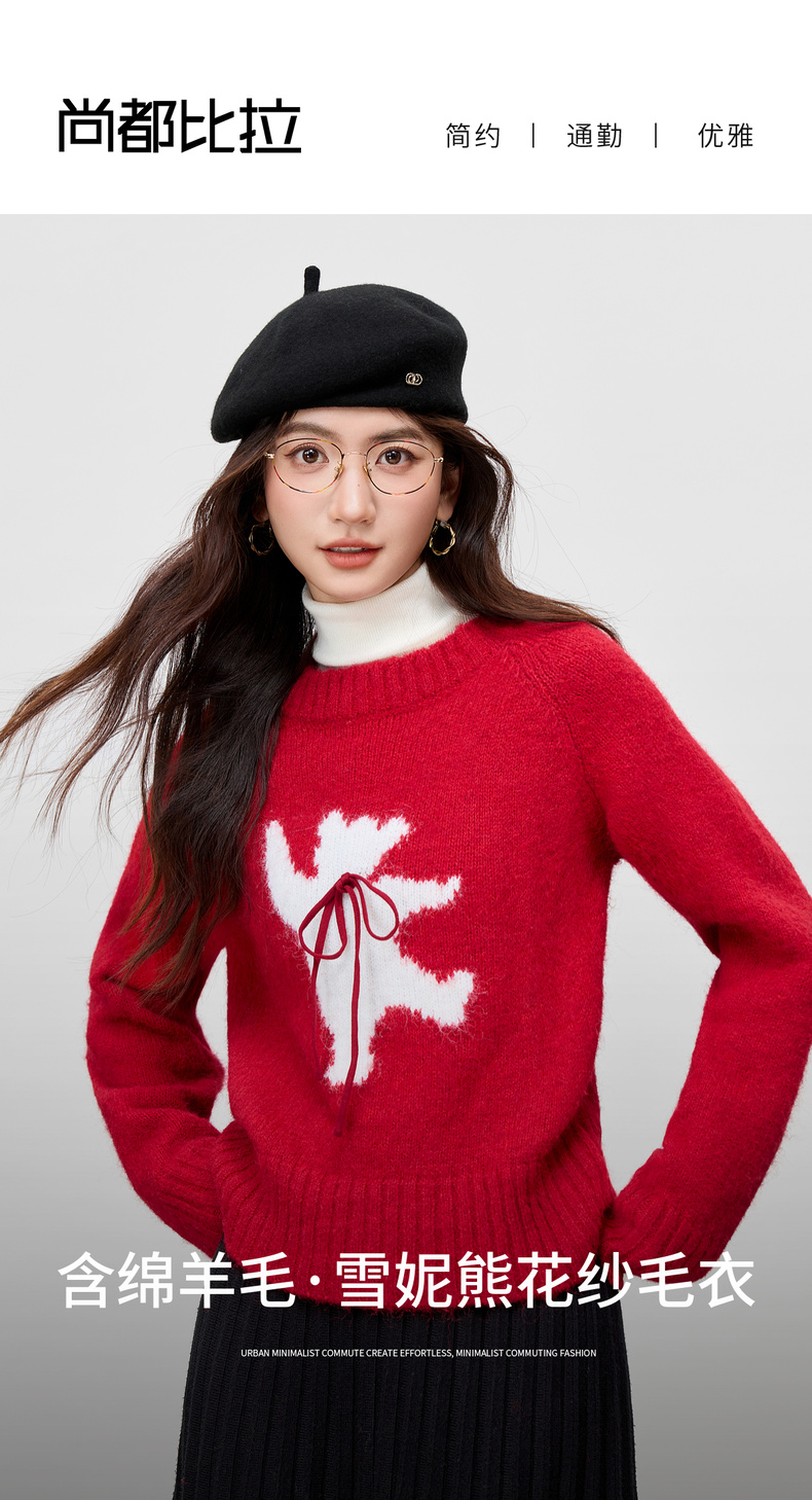 【内购】【雪妮熊】简约通勤圆领撞色蝴蝶结小熊图案宽松含绵羊毛花纱毛衣-W53EE3423
