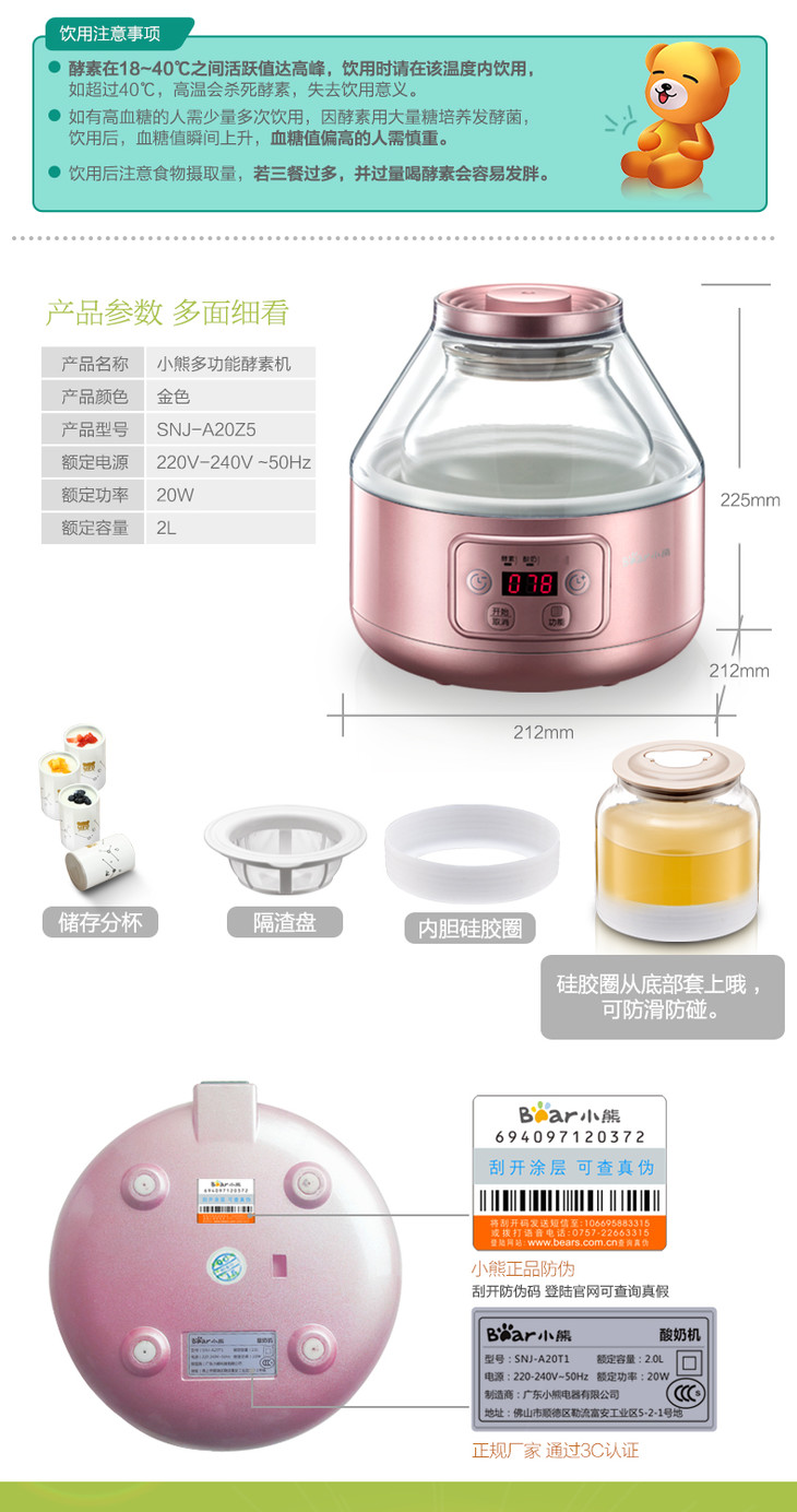 Bear/小熊 SNJ-A20Z5酵素机 家用酸奶葡萄酒机全自动玻璃瓶酵素桶