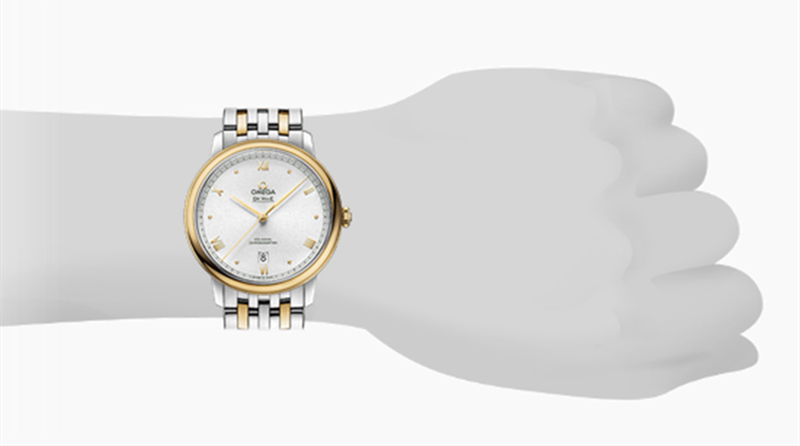 镜面材质 | 蓝宝石水晶玻璃 | 表盘 | 精钢‑黄色18 K金表壳 银色太阳光芒射线表盘,环绕“轨道式”分钟圈。 腕表的6点位置设有日历窗,欧米茄品牌标识、间隔出现的罗马数字与弧面形小时刻度,以及指针均采用镀黄色18K金制成。 密底 |