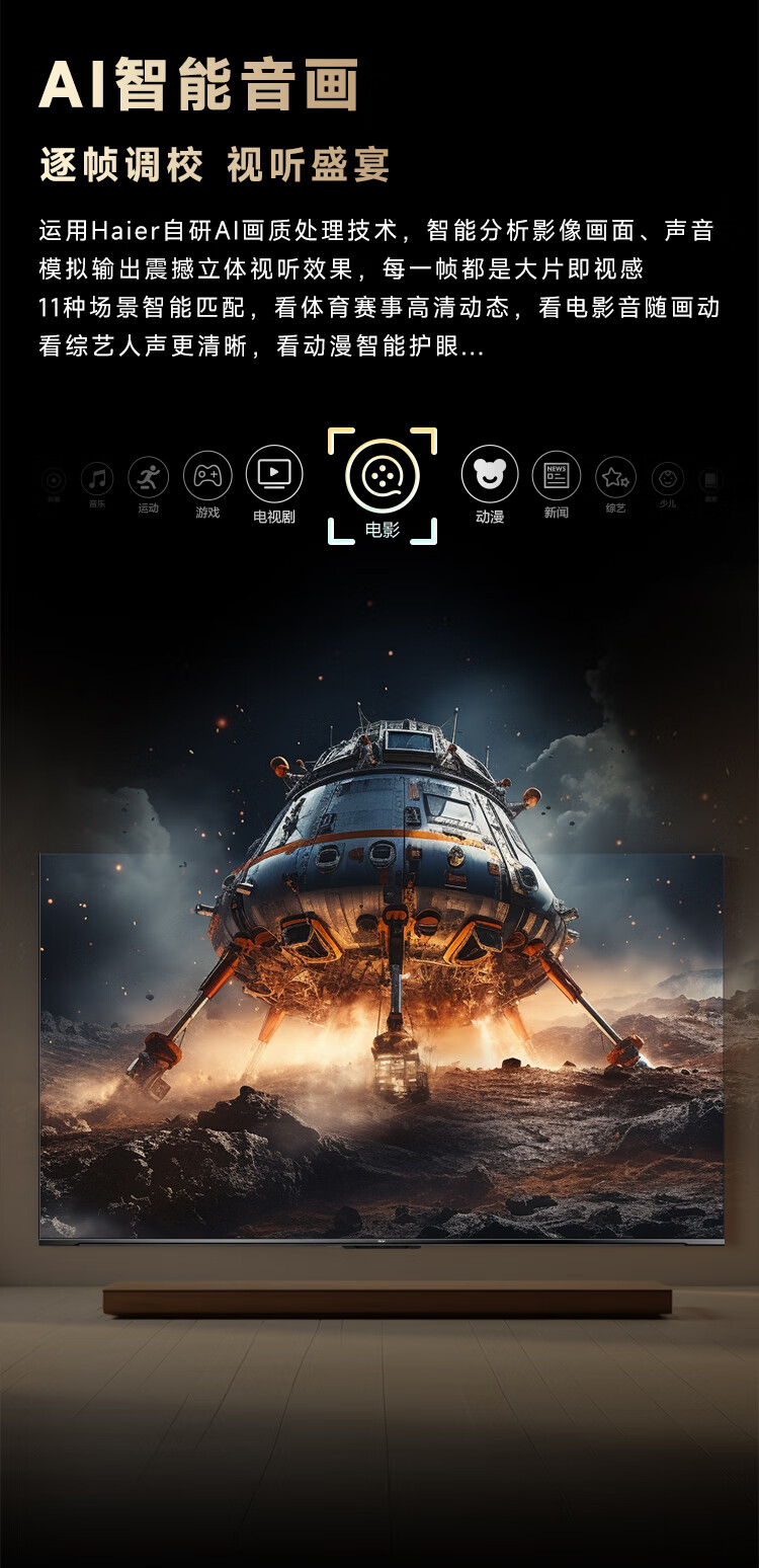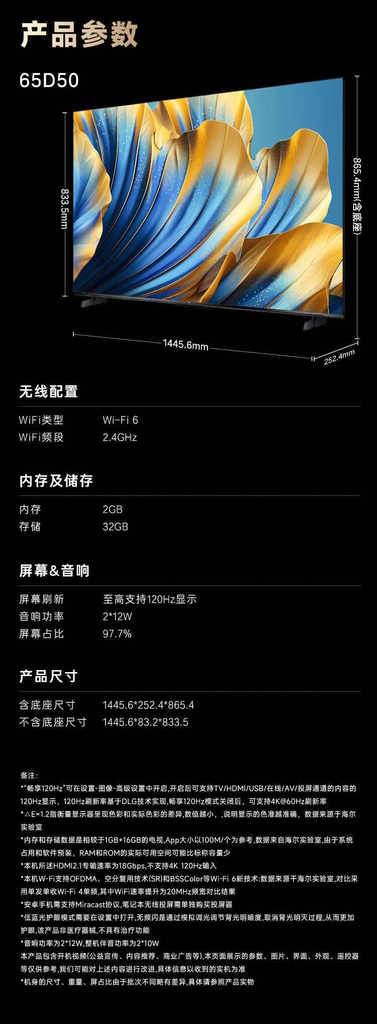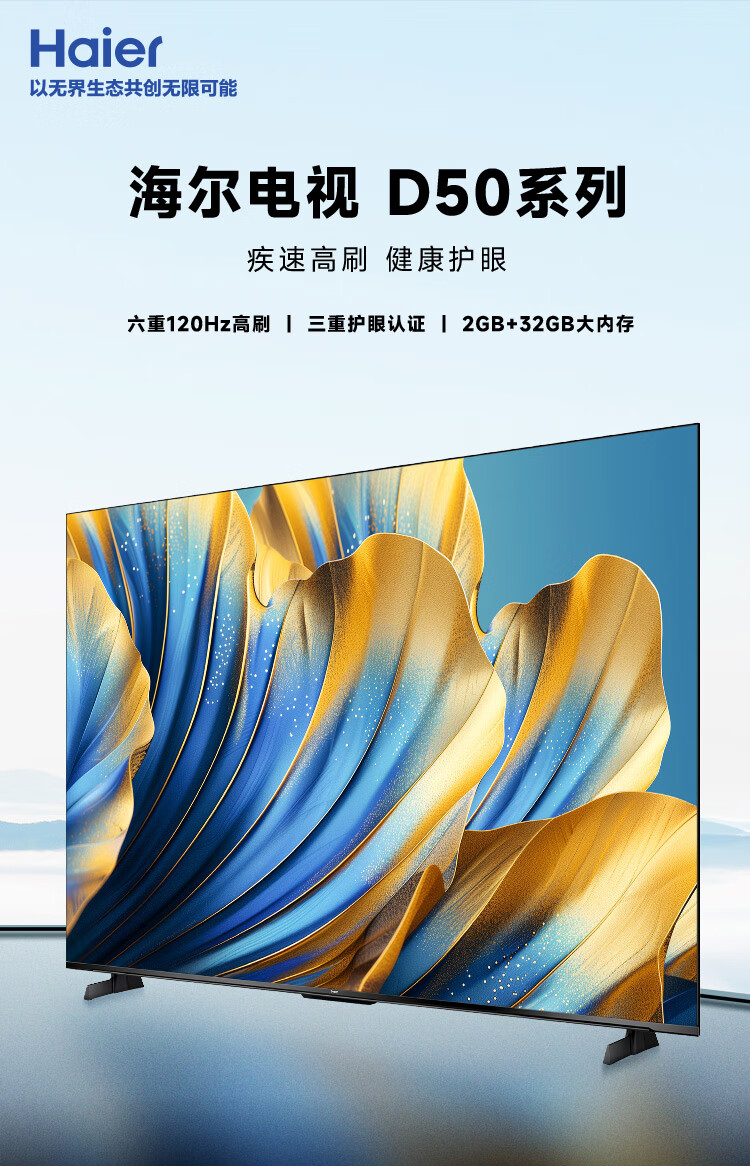 海尔 65英寸 4K超高清 智能电视120Hz高刷 2+32GB大内存 智能液晶 平板电视机 疾速WiFi 6 护眼电视65D50