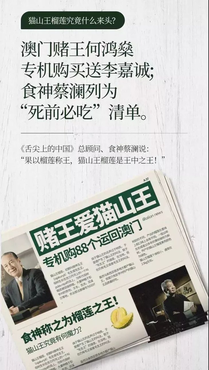 有报道澳门赌王何鸿燊派私人飞机运了100颗猫山王榴莲回香港,宴请李嘉诚等生意大亨,一夜之间“猫山王”声名鹊起,无数明星都是猫山王的忠实食客!