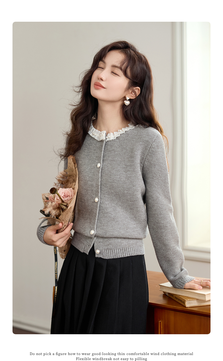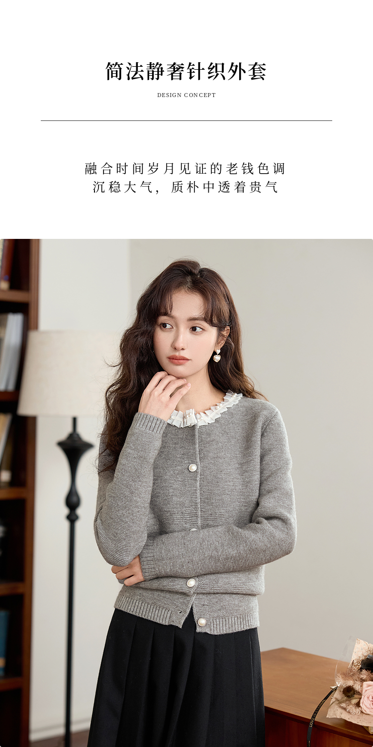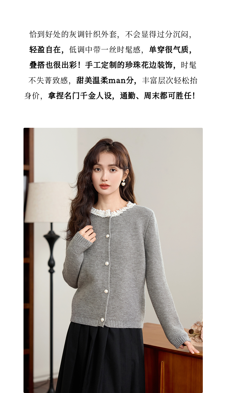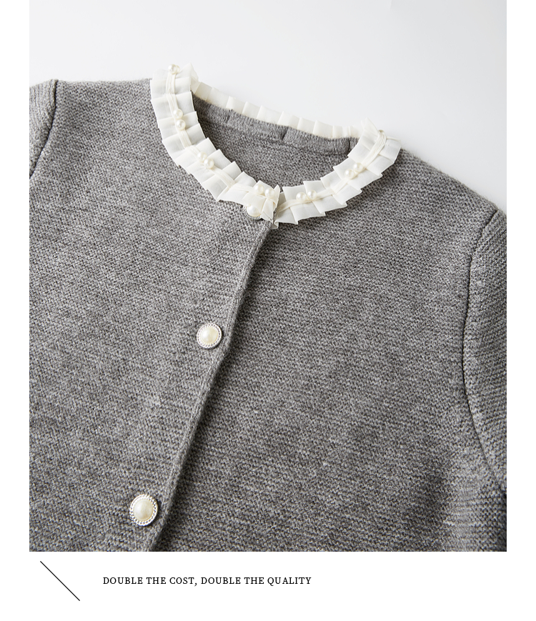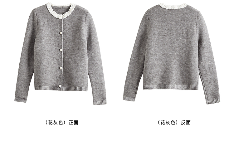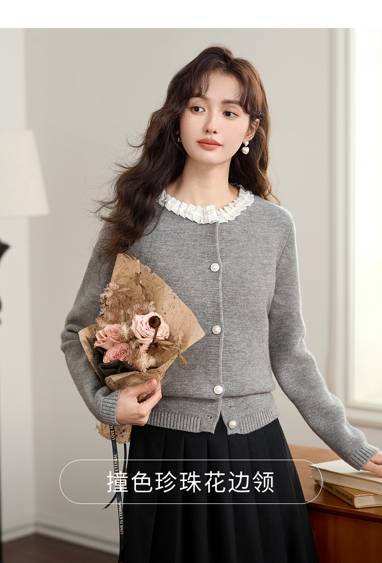 【年终特卖】熙世界撞色珍珠花边圆领针织开衫秋冬内搭小个子打底毛衣短外套