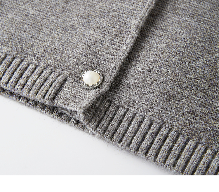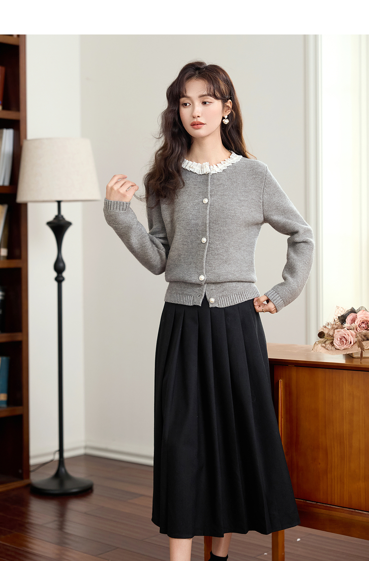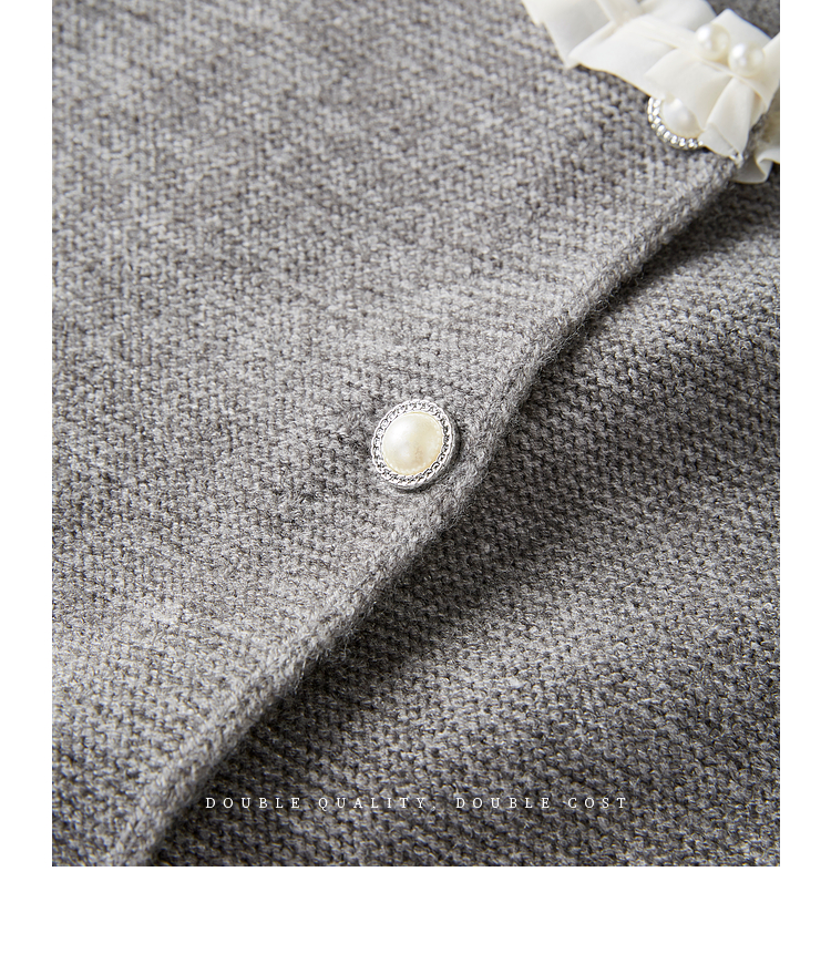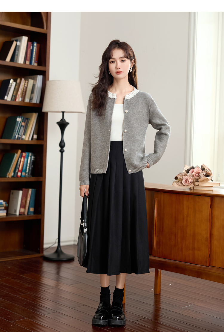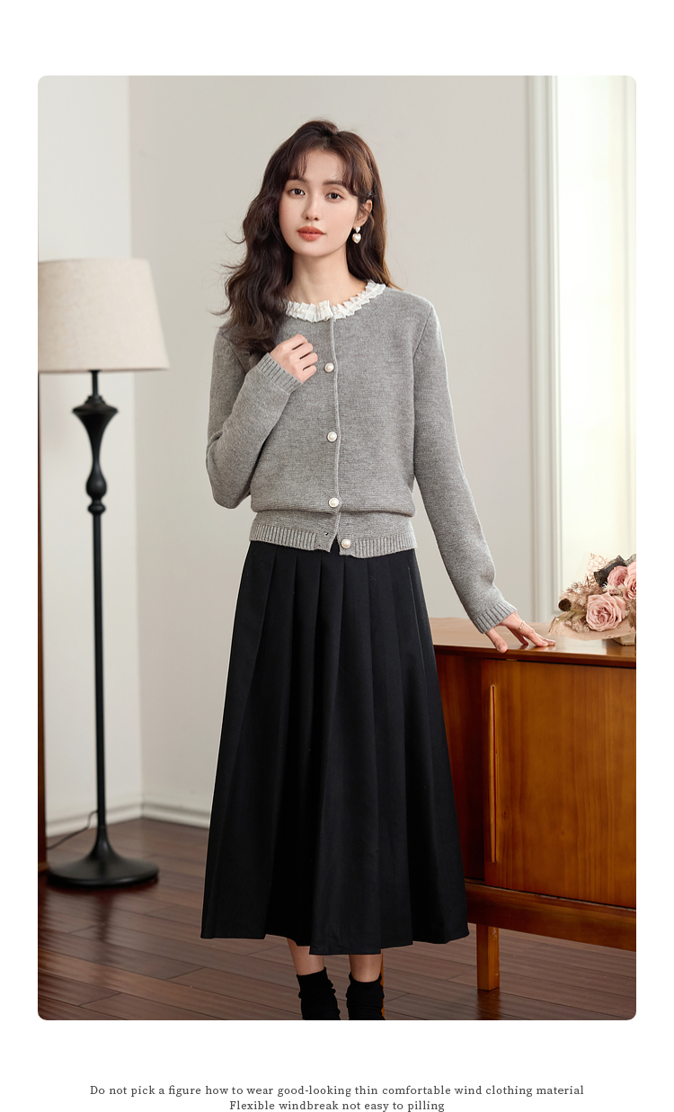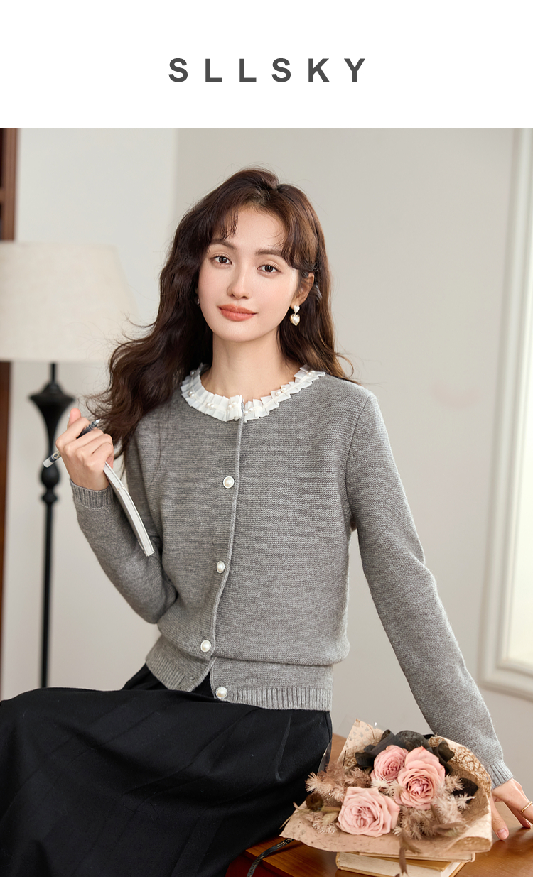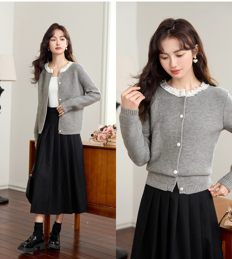 【年终特卖】熙世界撞色珍珠花边圆领针织开衫秋冬内搭小个子打底毛衣短外套