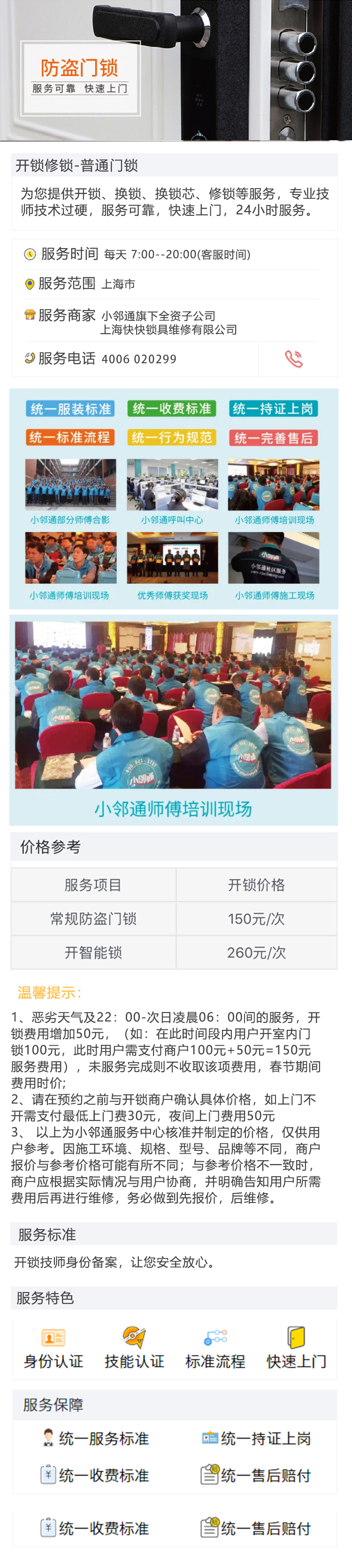 开锁上门服务时间为7:00-20:00。范围限上海区域。交通不方便地方及个别离公交站距离远的地方不保证能安排;