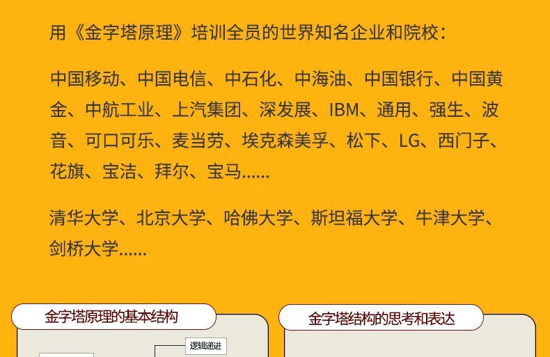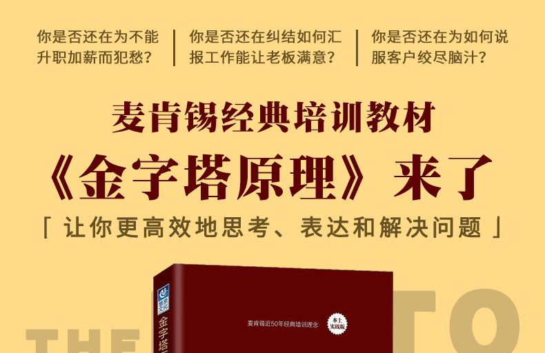 我们*希望解决问题时,能够做到思路清晰、考虑周全、直截了当抓住问题重点;给上司汇报工作或是回答提问时,可以表述得主次分明,逻辑性更强;尤其在演讲时,能充分调动听众的兴趣,还能让他们记住并赞同我们的观点……只要熟练掌握金字塔原理,这些其实非常简单。