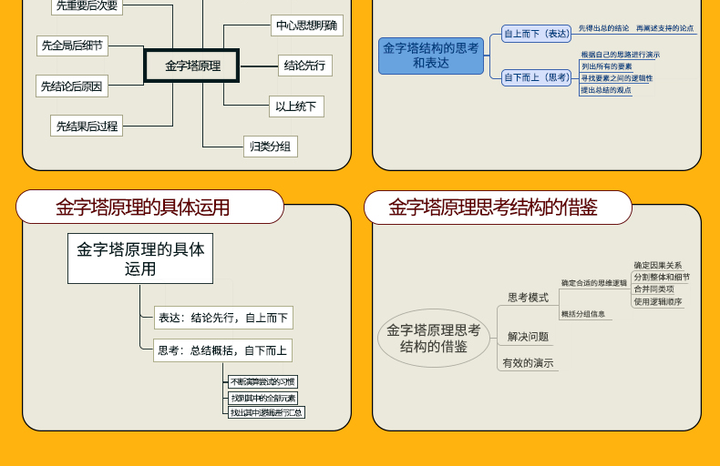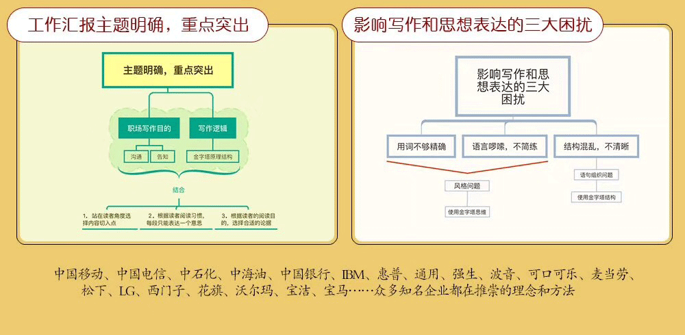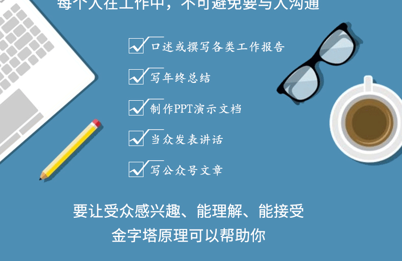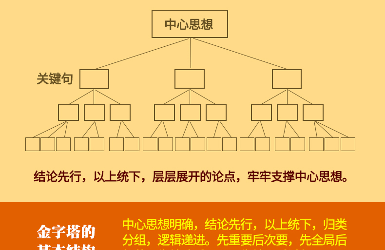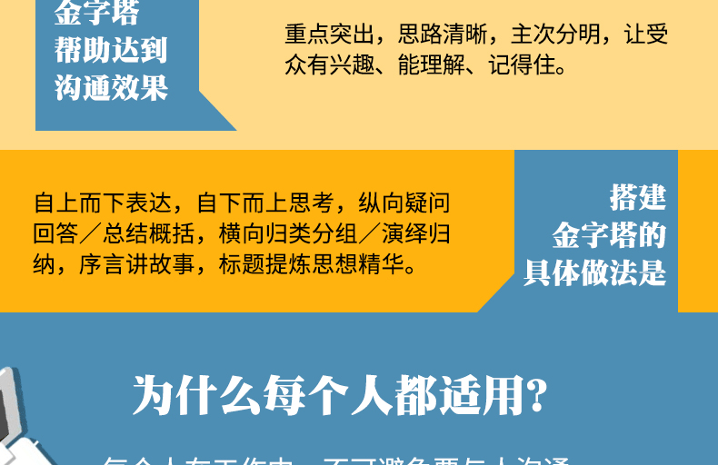 一份好的汇报或者总结并不是靠着文笔取胜,而是对方能否看懂,条理是否清楚,结构是否完整。写作、汇报*是一种演示,与思考问题一样*需要一定的逻辑。金字塔原理着重于快速搭建逻辑清晰的结构框架,重点突出,思路清楚,主次分明,在这种思维指导下的文案演示能让对方产生兴趣,快速理解自己要表达的思想和内容。