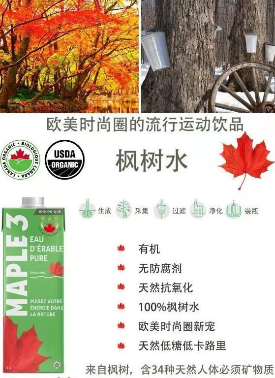 枫树液,是一种纯天然健康饮品,它产自世界枫叶之都——加拿大,是直接从枫树中提取,后经过滤、净化等多道工序,最后灌装成瓶。这种“长在树里”的健康饮品是枫树的组织液,喝起来十分清爽,带点微甜。加拿大政府只允许生产企业每年春天对枫树开采取用,因此更显稀缺珍贵。