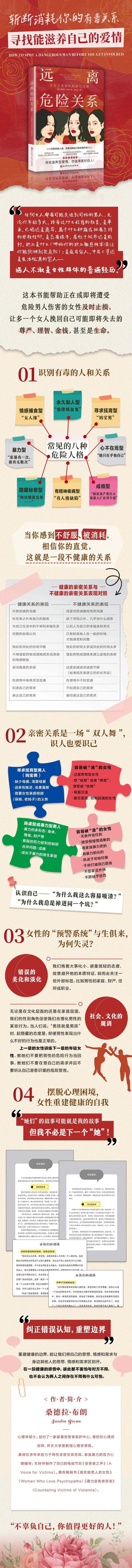 这本精准、直白的书将真实的女性故事与专业的心理学知识、两性关系问题的研究结果结合起来,帮助所有年龄段的女性在她们卷入一段不健康的亲密关系之前识别出危险的人格,同时认识自己的人格特点、情感需求和择偶模式,改变错误的认知,识人也识己,寻找并建立能滋养自己的健康关系。