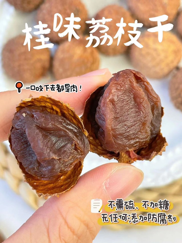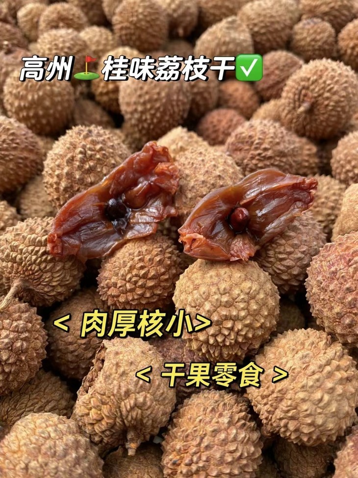 新鲜出炉的【桂味荔枝干】,它选用了茂名的桂味荔枝新鲜制作,再经过传统的烘干工艺,桂花香和荔枝香浓。肉厚核小,吃起来就是爽!都是肉!紧实有嚼头,香甜软糯,吃起荔枝味超浓!