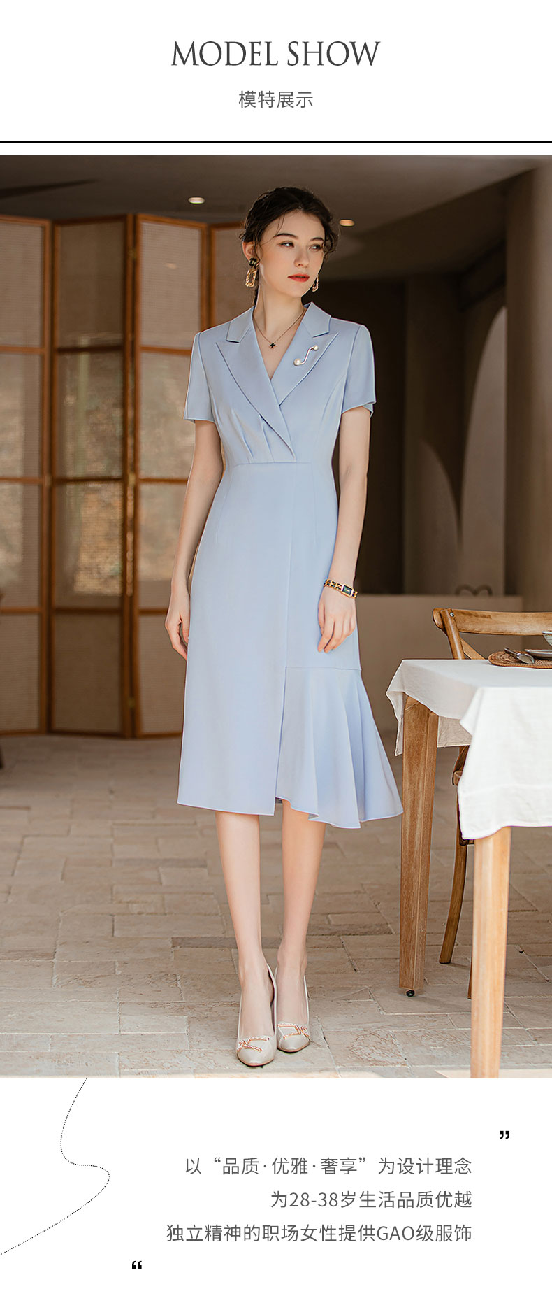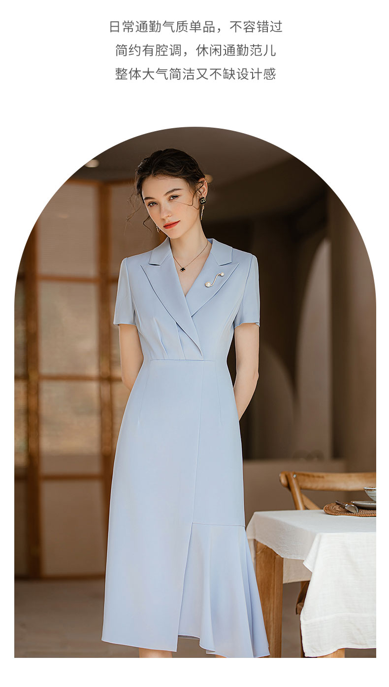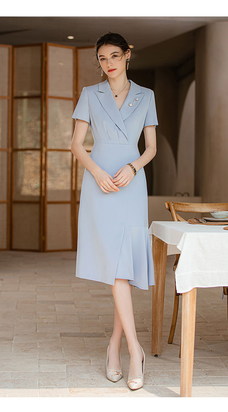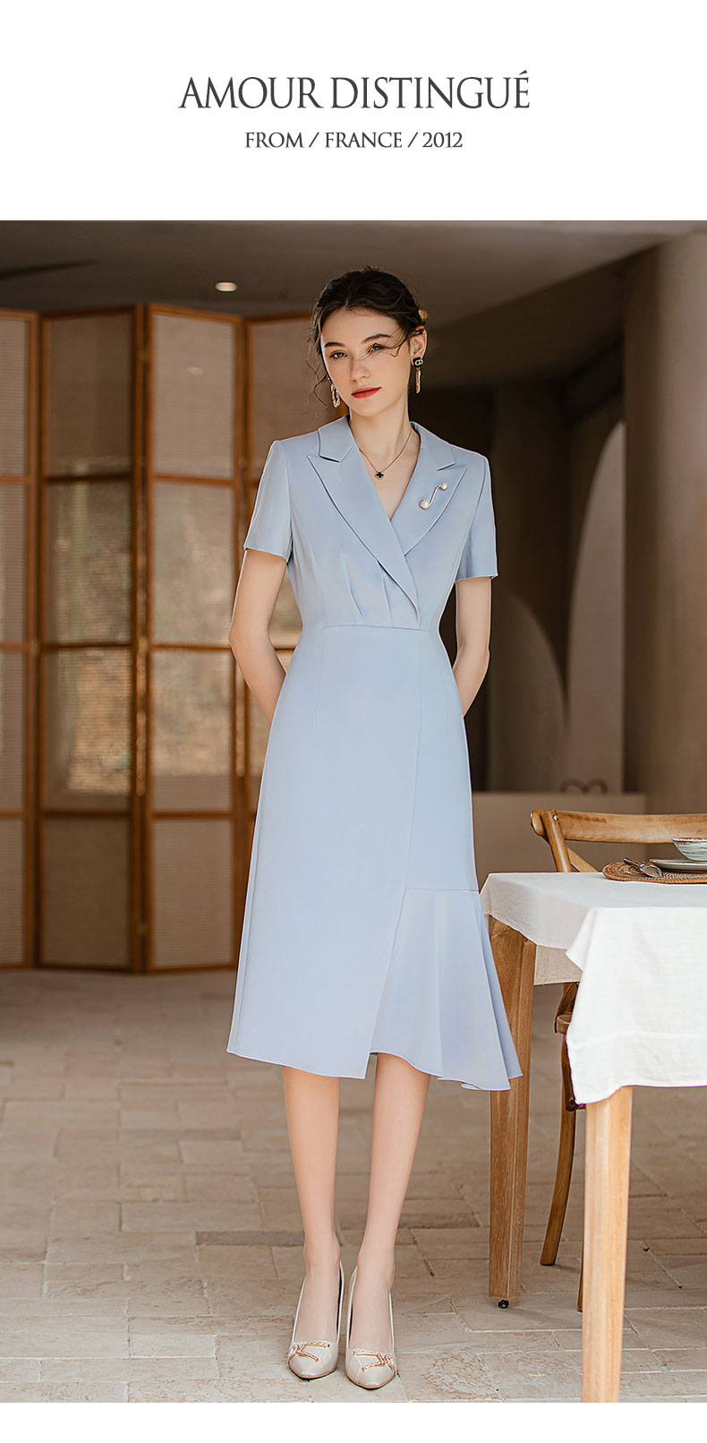IWY/蓝色连衣裙女夏短袖不规则中长款褶皱小众设计感薄西装裙Q897-L
