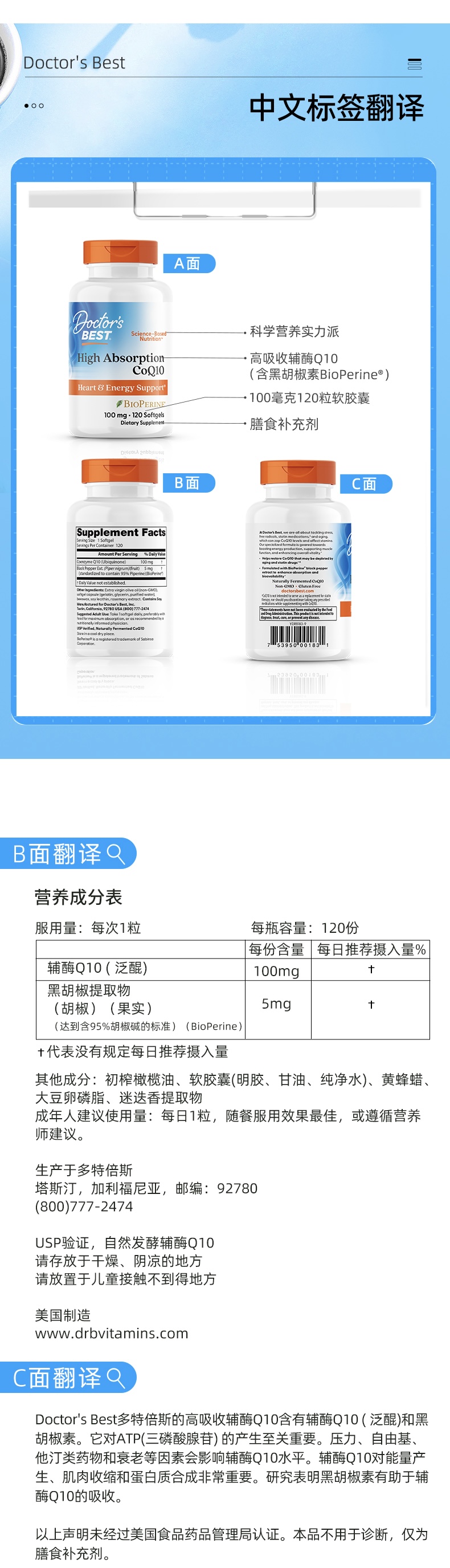 【2瓶装/1瓶装 可选】Doctor’s Best高吸收辅酶Q10软胶囊100毫克120粒X2 每日1粒美国 多特倍斯 【供】JDW