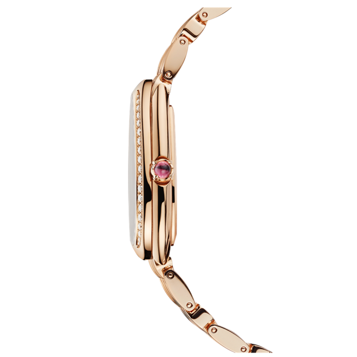 镜面 材质 | 蓝宝石水晶玻璃 | 表盘 | 18k玫瑰金镶钻表壳 白银色蛋白石表盘 18K玫瑰金表冠,饰以1颗凸形蛋面切割粉色红碧玺 |
