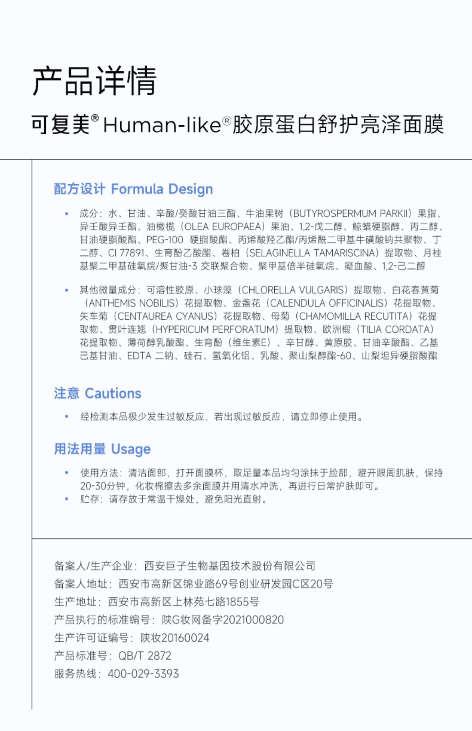 可复美胶原蛋白舒护亮泽面膜5g*10颗/盒(2.0版小蓝杯)