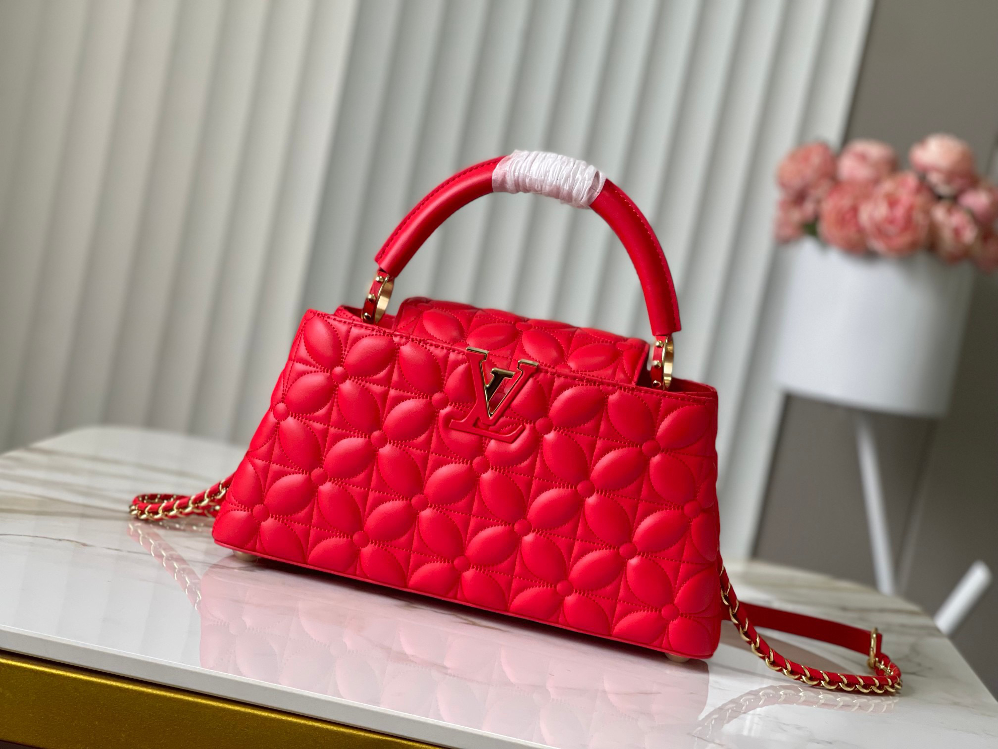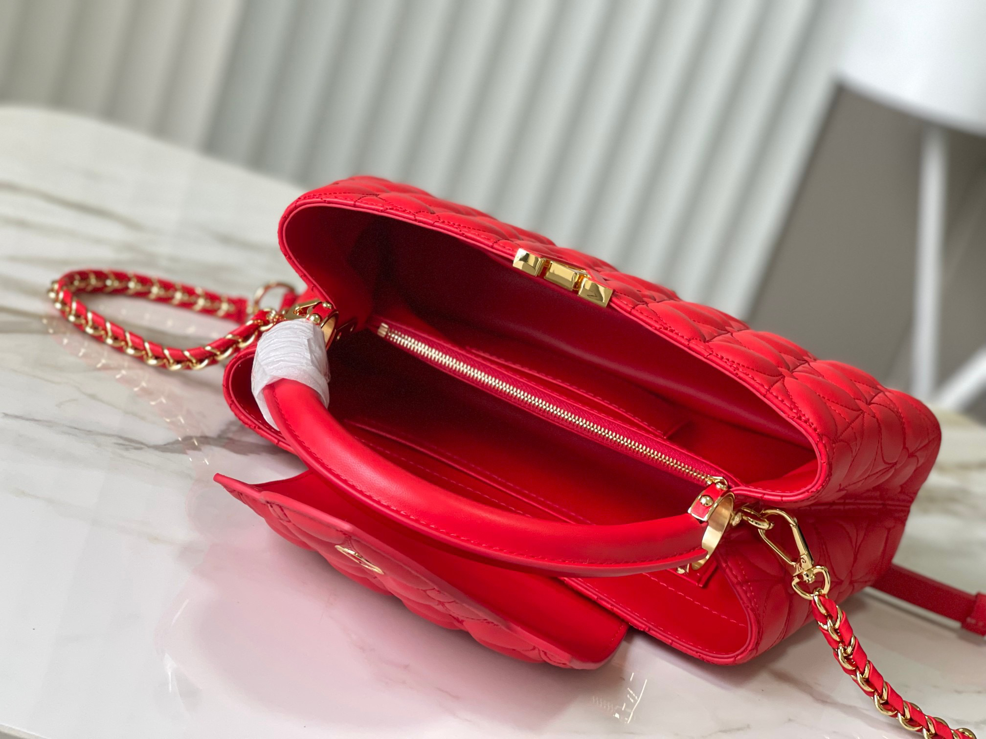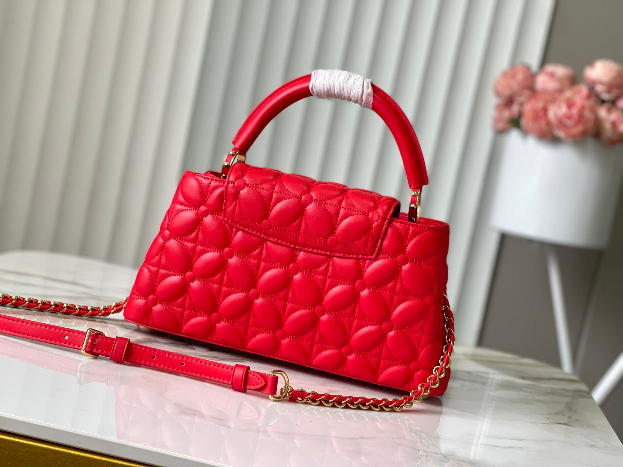 秋冬特惠💰1700 渠道级LV 新品 te级LV 全套包装 M25332/M48865红色四叶草链条款(变码芯片)Monogram 花卉于优雅绗缝中浮现 为 Capucines 手袋吹袭门店装饰之风 柔软绵羊皮塑造沉稳构型与饰边 可拆卸肩带实现舒适肩背体验 Size:30 * 19 * 9 cm