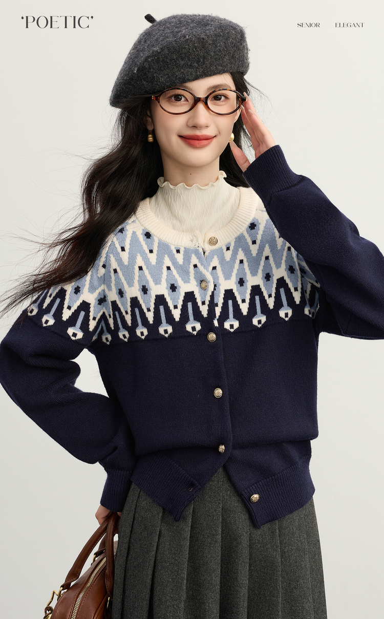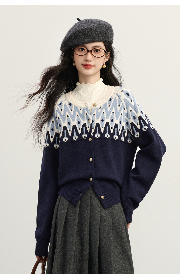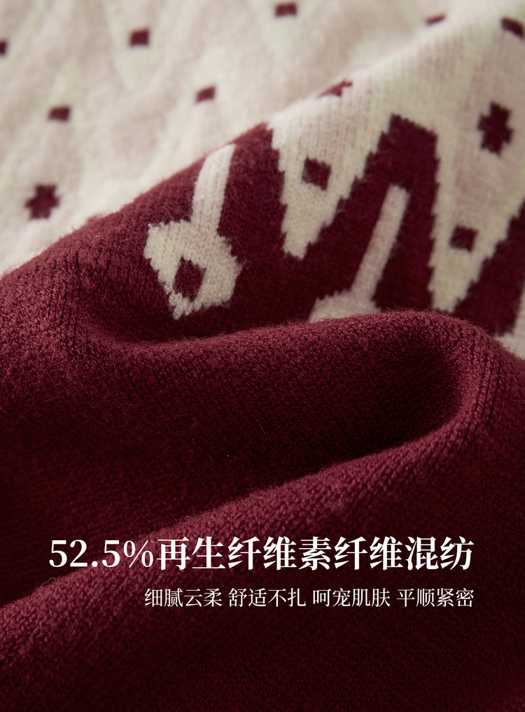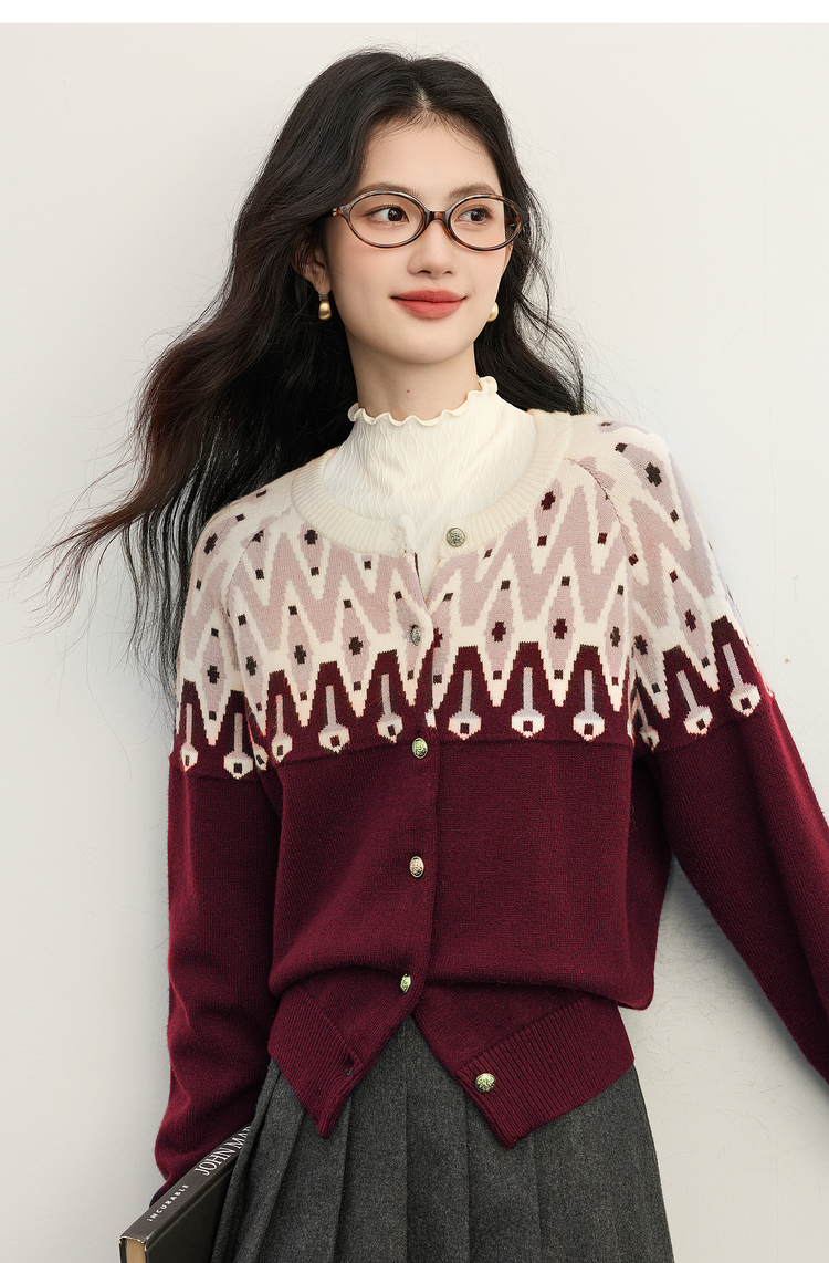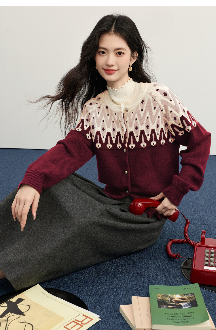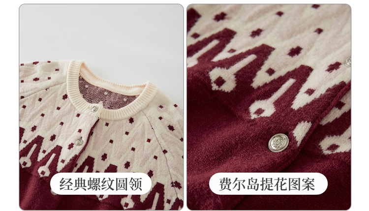 【年货节】熙世界北欧风新年费尔岛提花毛衣女2025秋冬新款圆领针织开衫上衣