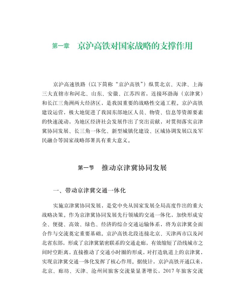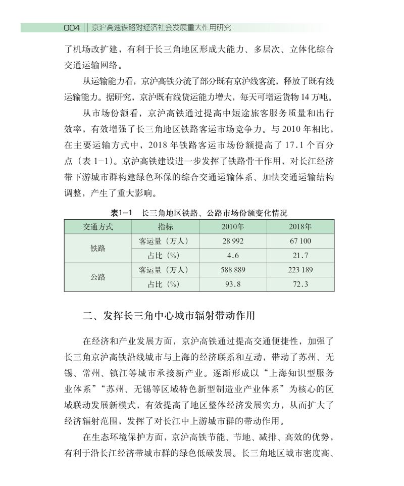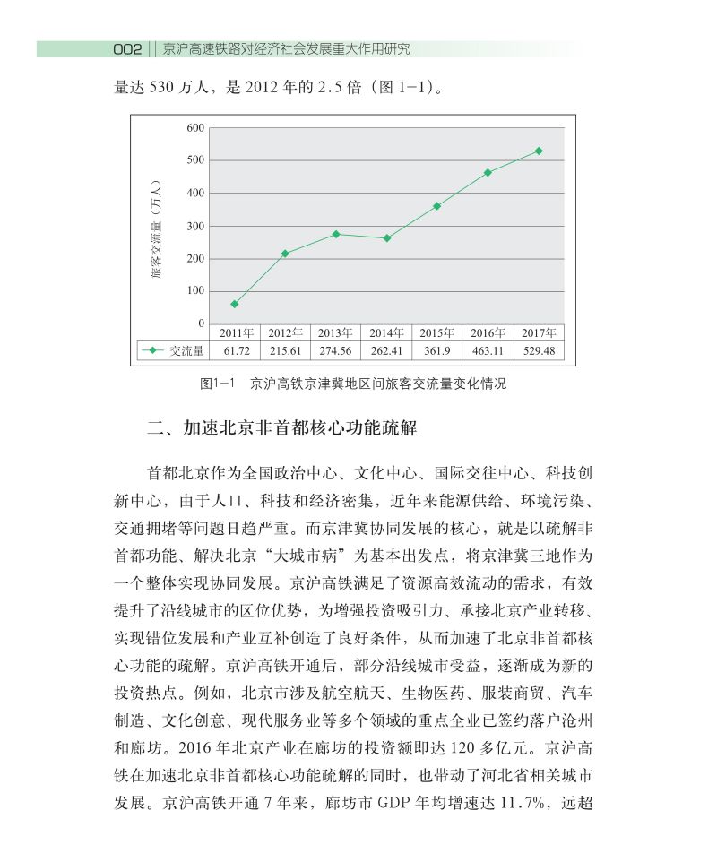 京沪高铁开通运营十年来,安全畅通,运量持续增长,在综合运输中发挥了骨干作用,取得了良好的经济收益;在优化沿线城市产业空间布局、推动产业结构升级、构建现代产业体系、加快旅游产业发展、增加劳动就业需求、改善人民生活质量、促进精神文明建设等方面产生了重大影响,有力支撑的京津冀协同发展,长三角一体化建设和区域协调发展。本书旨在通过详尽的理论与数据分析,剖析京沪高铁运营以来对经济社会的重大作用。